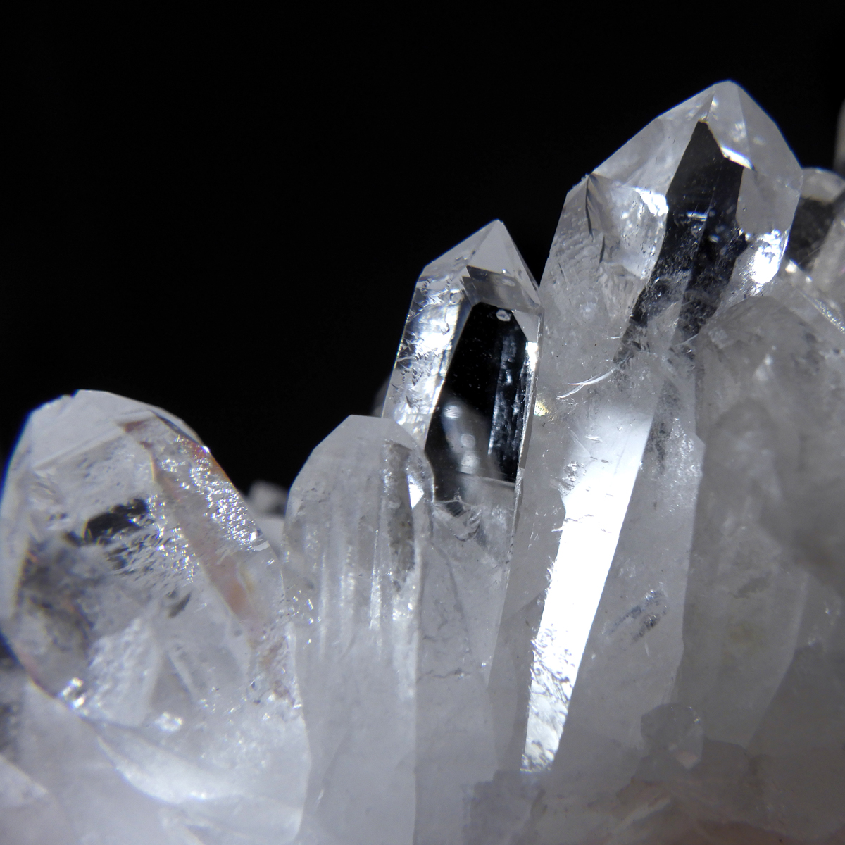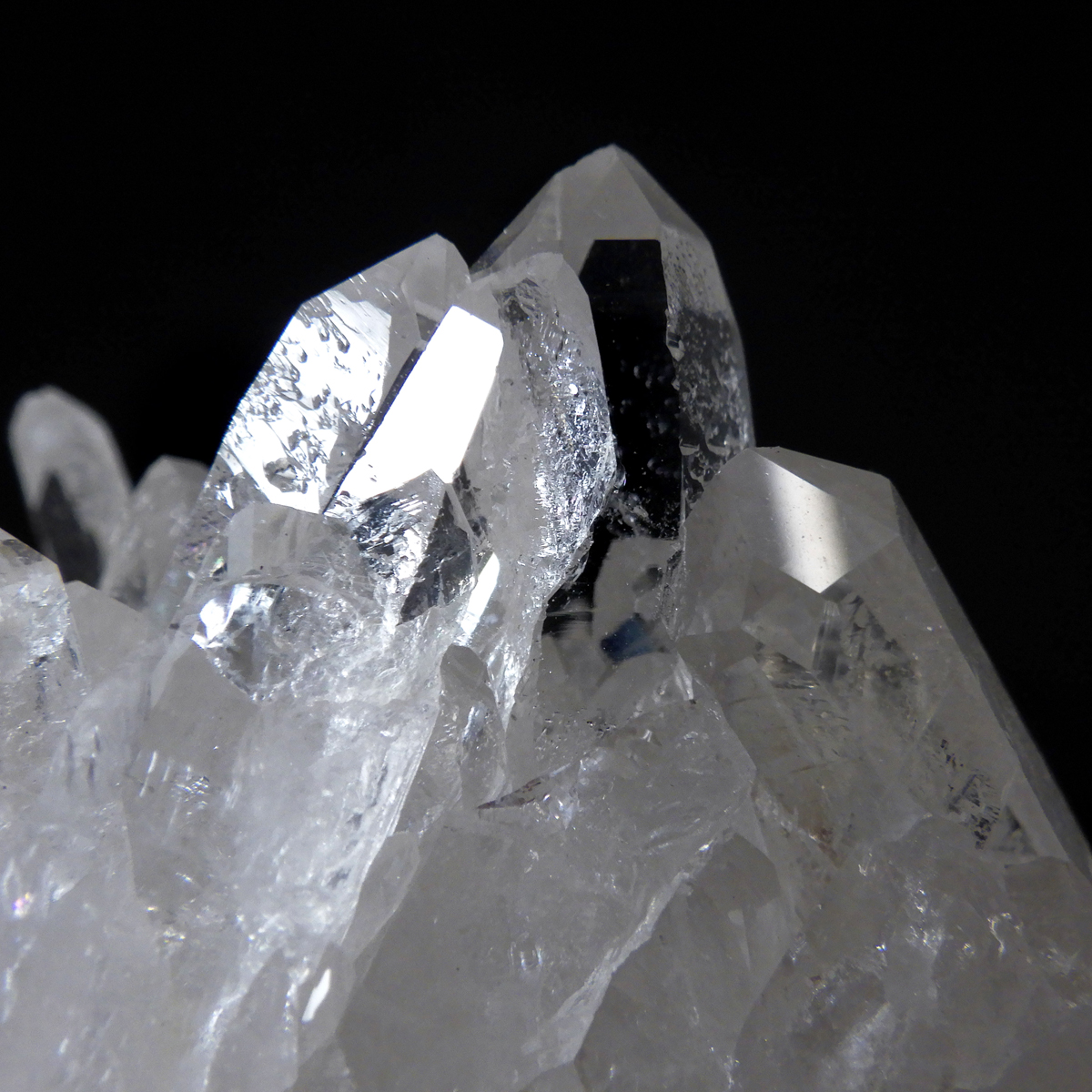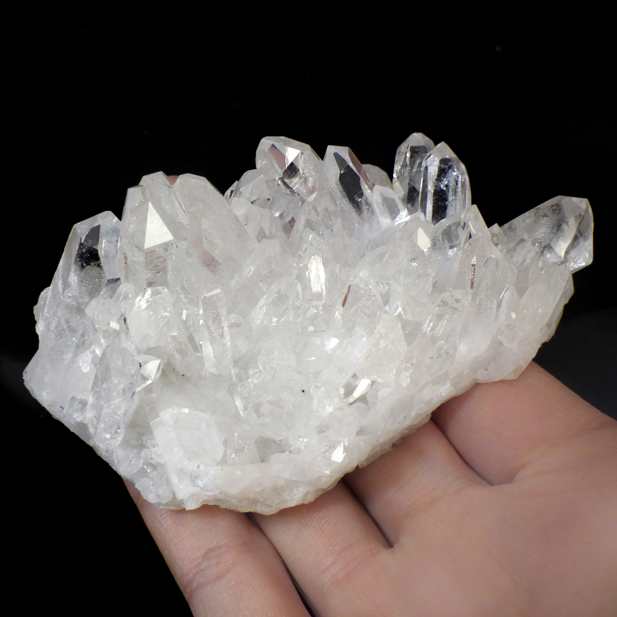 ブラジル トマスゴンサガ産 の水晶クラスターです。トマスゴンサガ産の水晶の特徴は、照りと艶。 光沢が強いため、驚くほどキラキラとしています。 また、水晶柱が放射線状に伸びて立体的な構造を作っているものが多く、「これぞ、水晶クラスター」という形状をしています。 非常に透明度の高い大小様々な結晶が複雑に絡み合い、見る角度によって様々な表情を見せる大変美しいクラスターです。