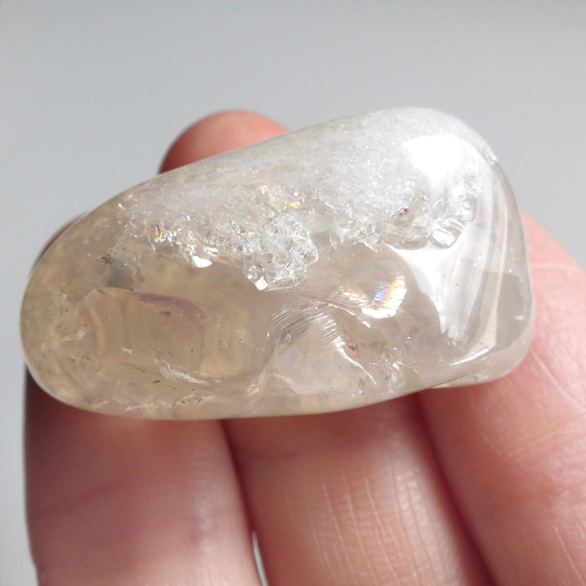 ブラジル・ミナスジェライス産のオパールクォーツです。 オパールクォーツは、水晶中に微量に含まれている硫黄(サルファー)によって優しい黄色に色づいています。その姿からオパールクォーツと呼ばれているようです。またクラックによって、沢山の小さなレインボーを楽しむ事ができます。