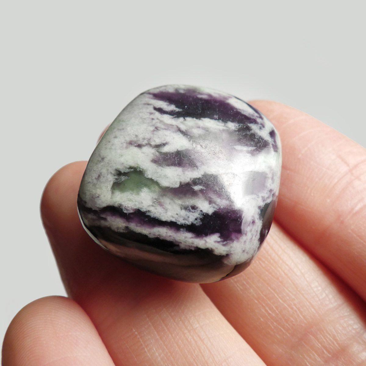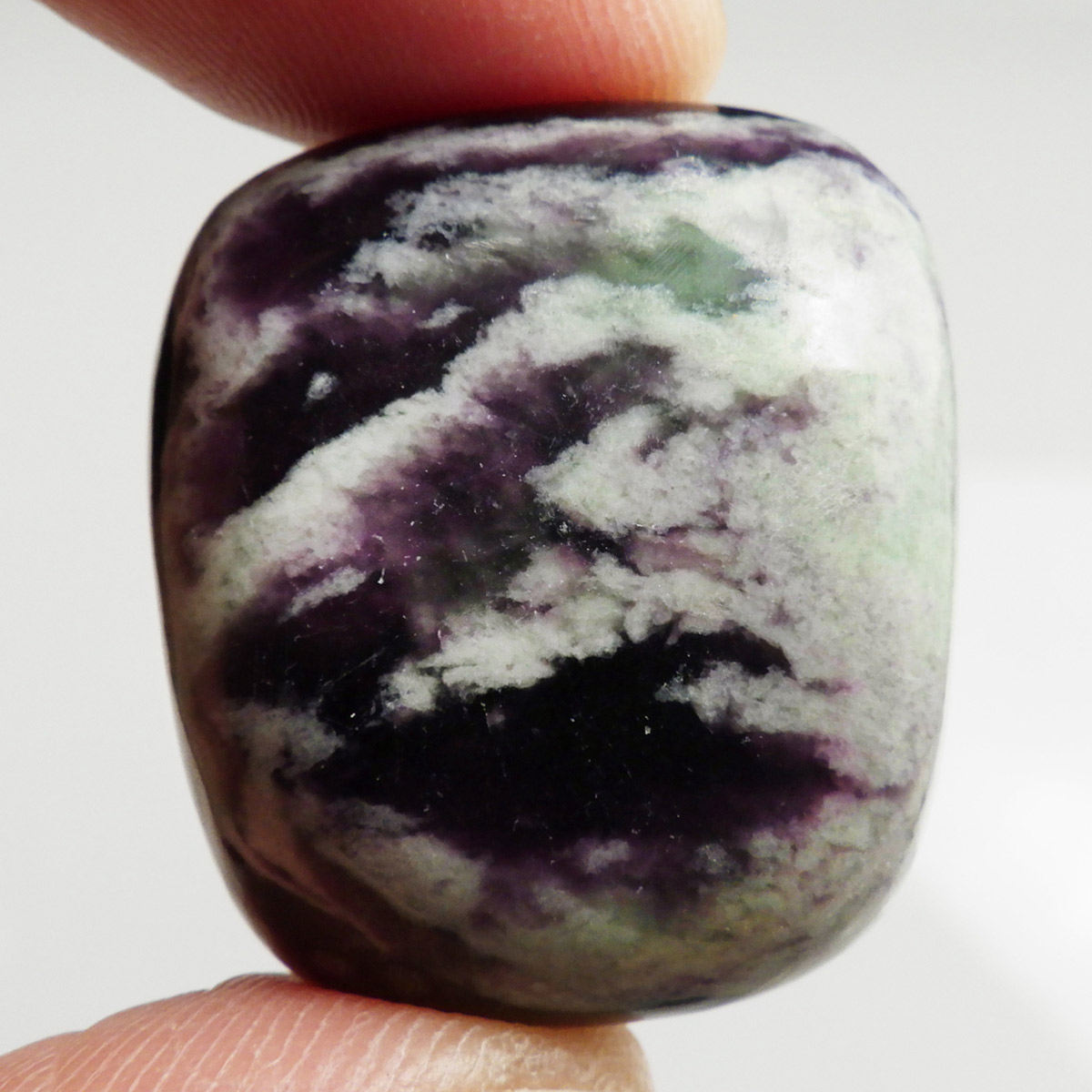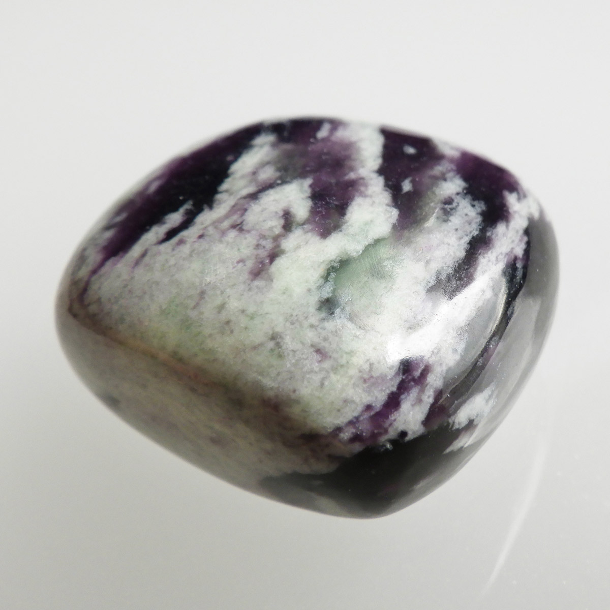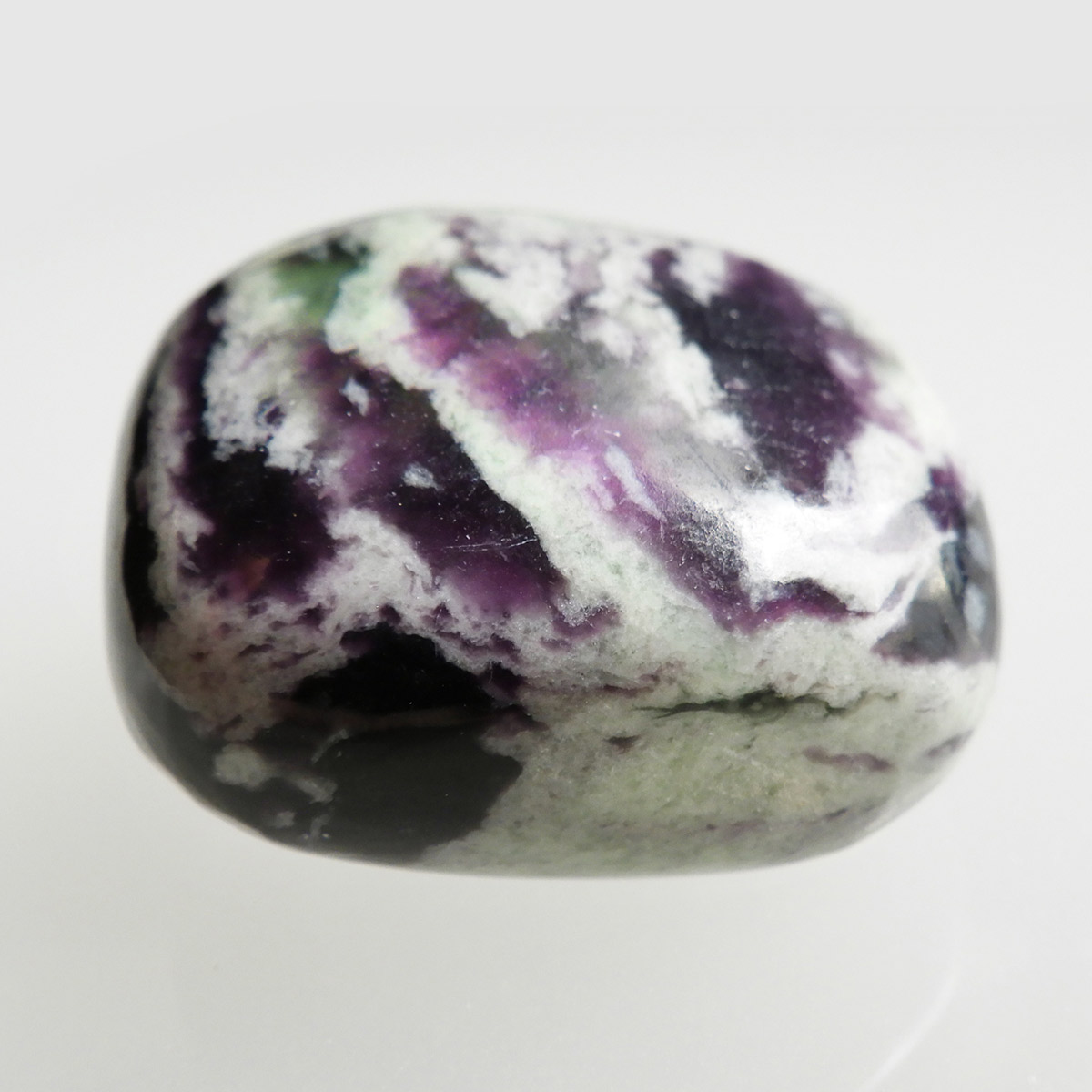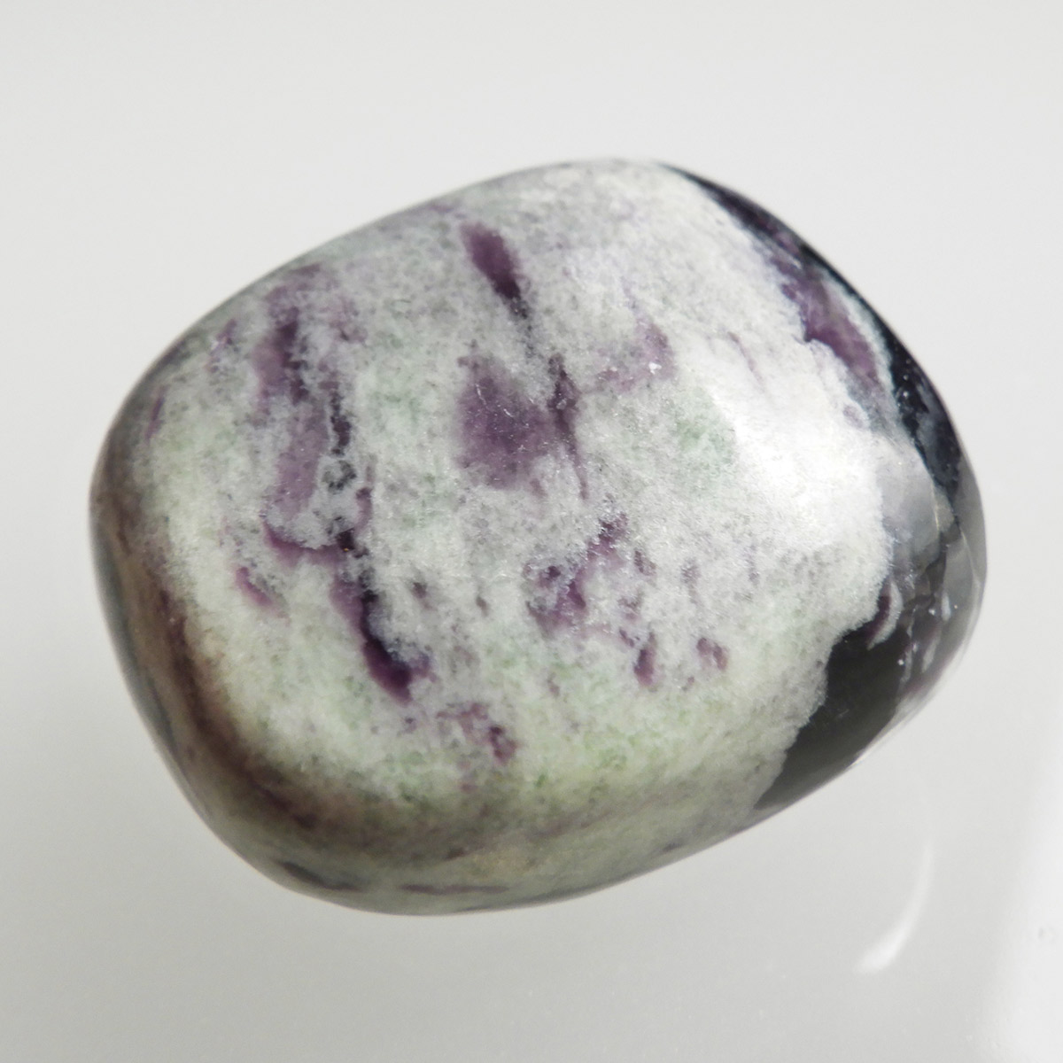 ケンメレライトはその色にちなんで和名で菫泥石と呼ばれています。ケンメレライトはロシアの化学者A. A.Kammererにちなんで名付けられています。ケンメレライトが最も近い表記だと思いますが、ローマ字読みでカメレライトとも表記されることがあります。緑泥石グループに属するクリノクロアがクロムを含み赤紫色を呈した亜種で、この鮮やかな赤紫色が特徴です。紫はケンメレライト、緑はサーペンティン(蛇紋石)。
