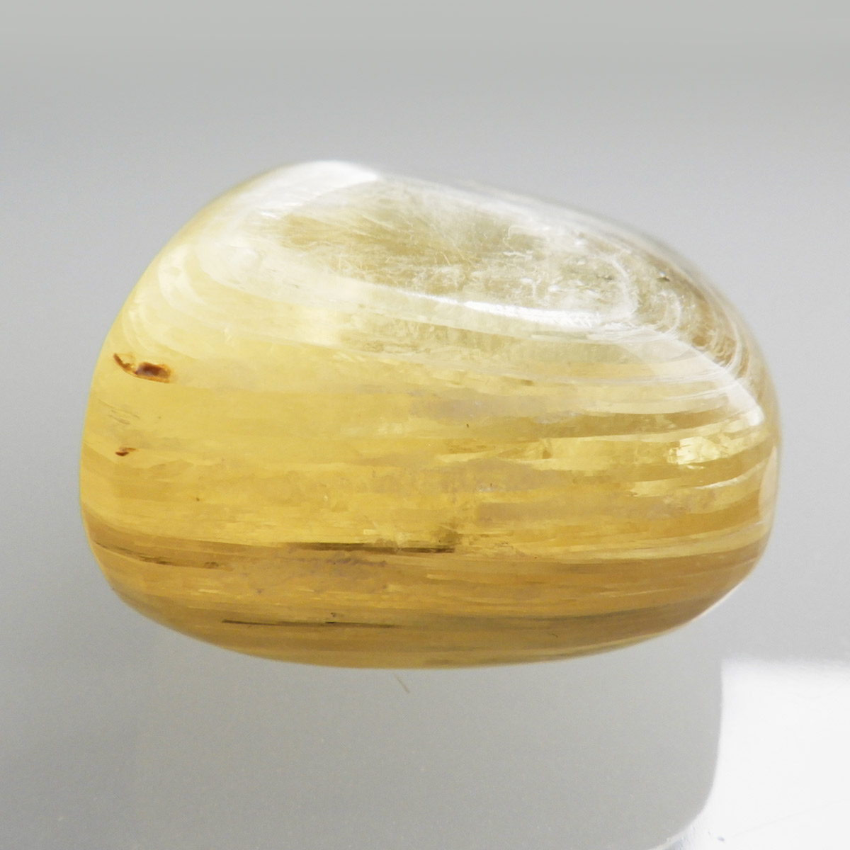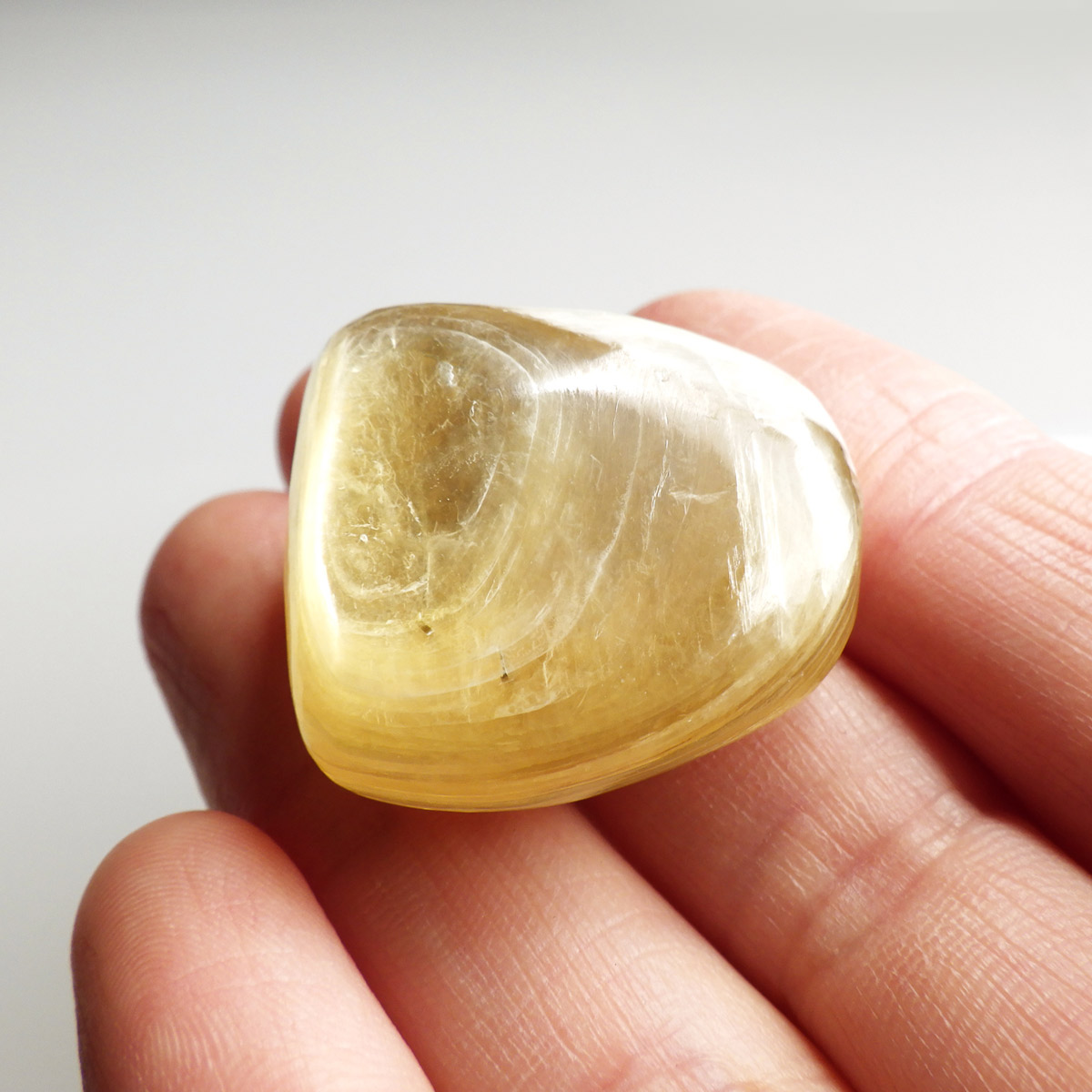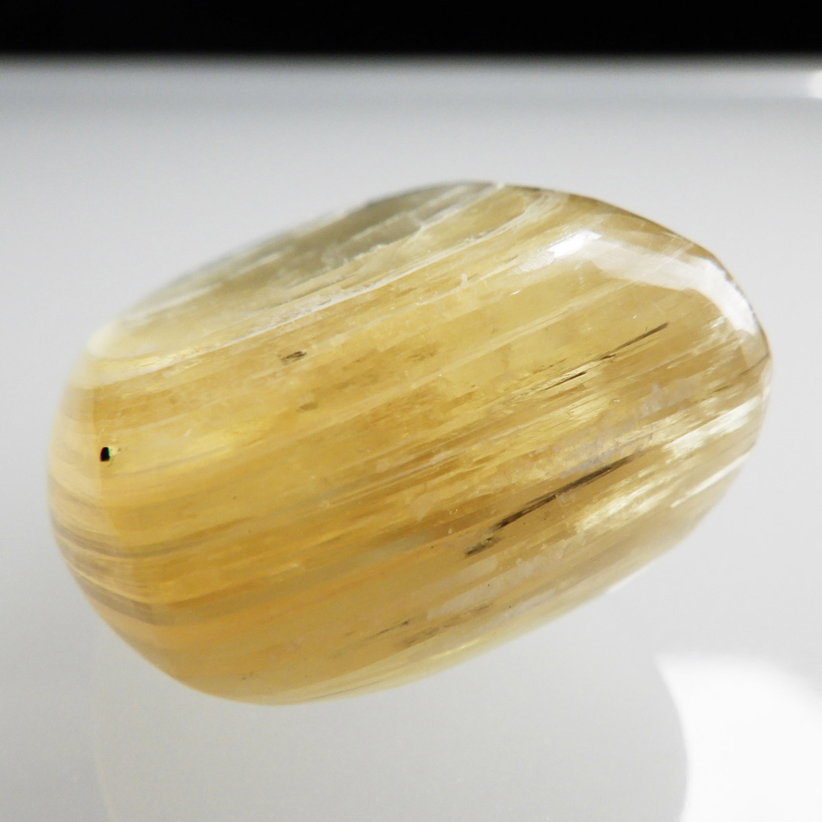 ブラジル産ゴールデンマイカ、タンブルです。ゴールデンマイカの最大の特徴は淡い金色の色合いで、光の当たる角度によって見られる、ガラス光沢のキラキラとした美しい輝きです。和名を「白雲母」といい、この輝きは雲母によるものです。ゴールデンマイカの中でもここまでの光沢ある輝きはなかなか出会えない質の良い一点です。