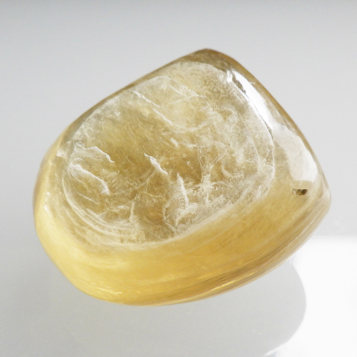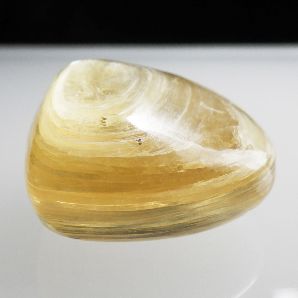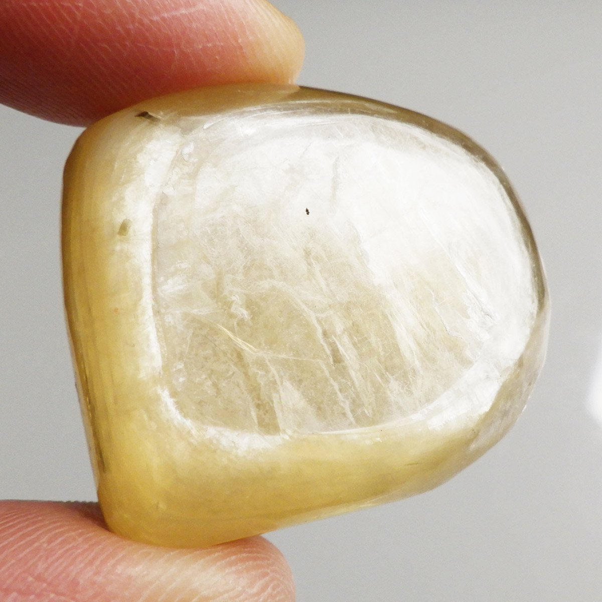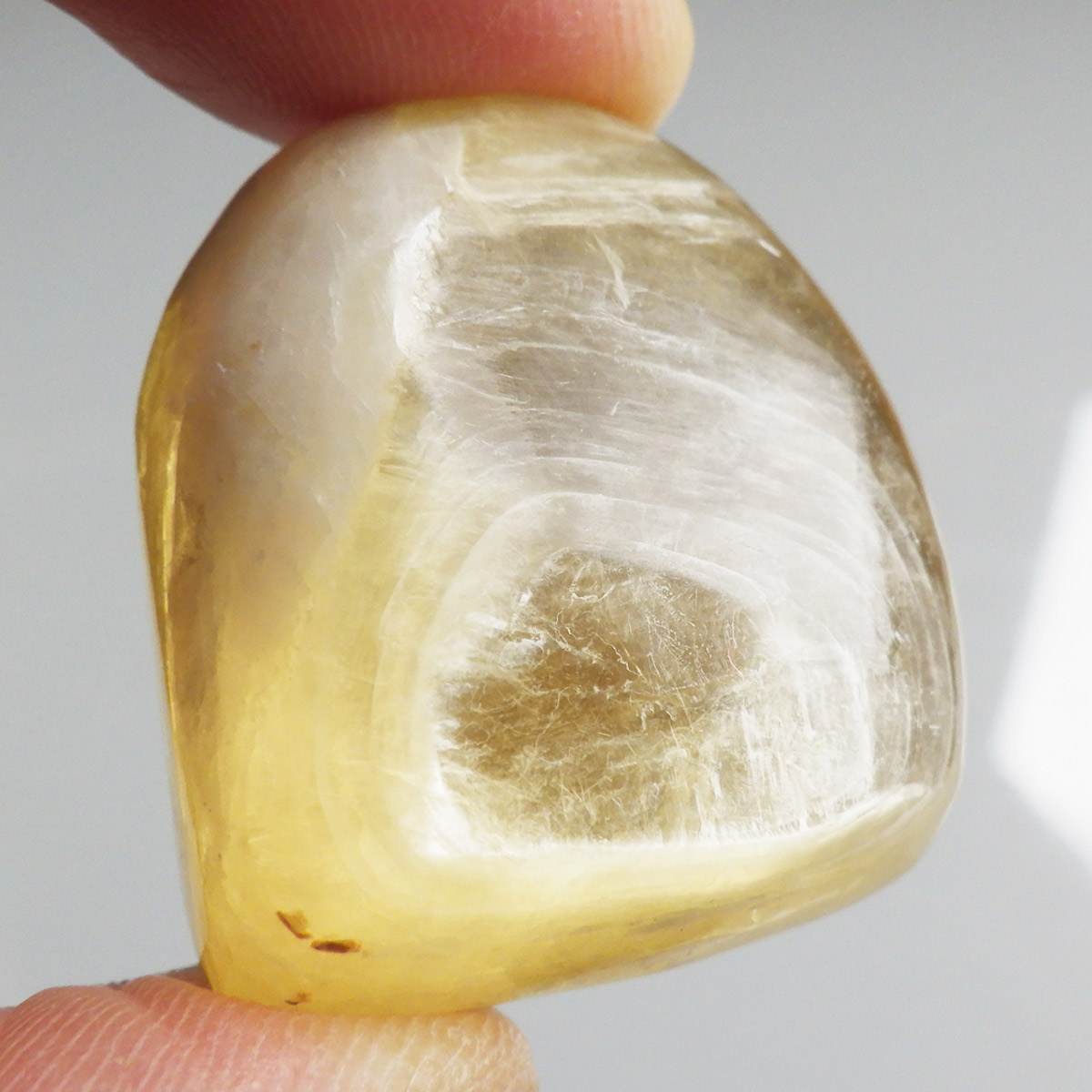 ブラジル産ゴールデンマイカ、タンブルです。ゴールデンマイカの最大の特徴は淡い金色の色合いで、光の当たる角度によって見られる、ガラス光沢のキラキラとした美しい輝きです。和名を「白雲母」といい、この輝きは雲母によるものです。ゴールデンマイカの中でもここまでの光沢ある輝きはなかなか出会えない質の良い一点です。