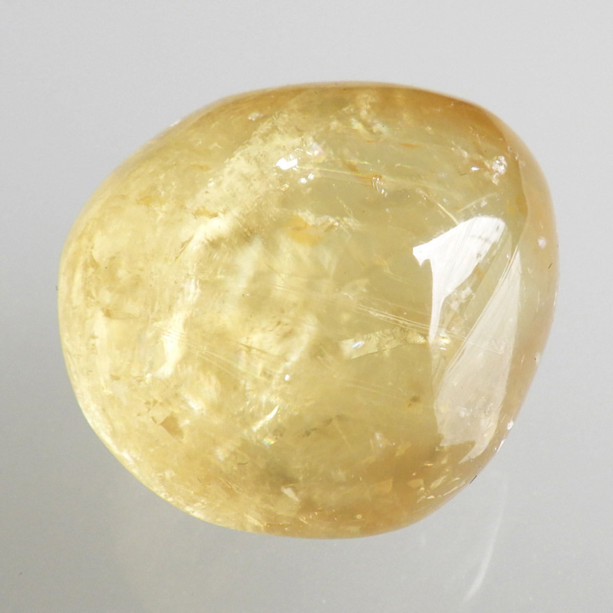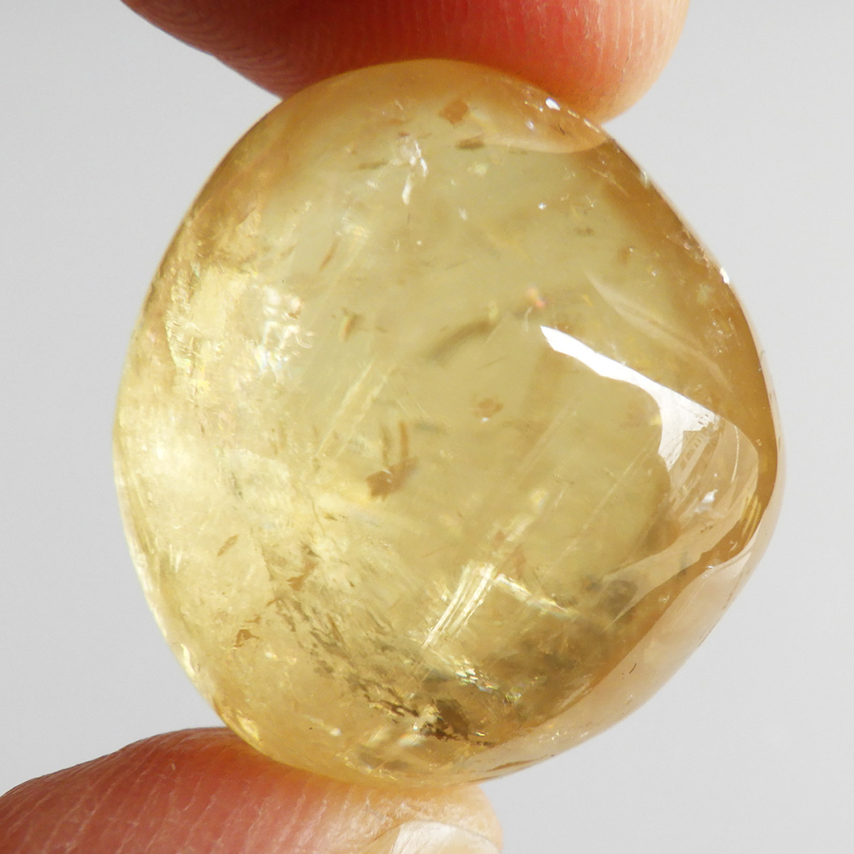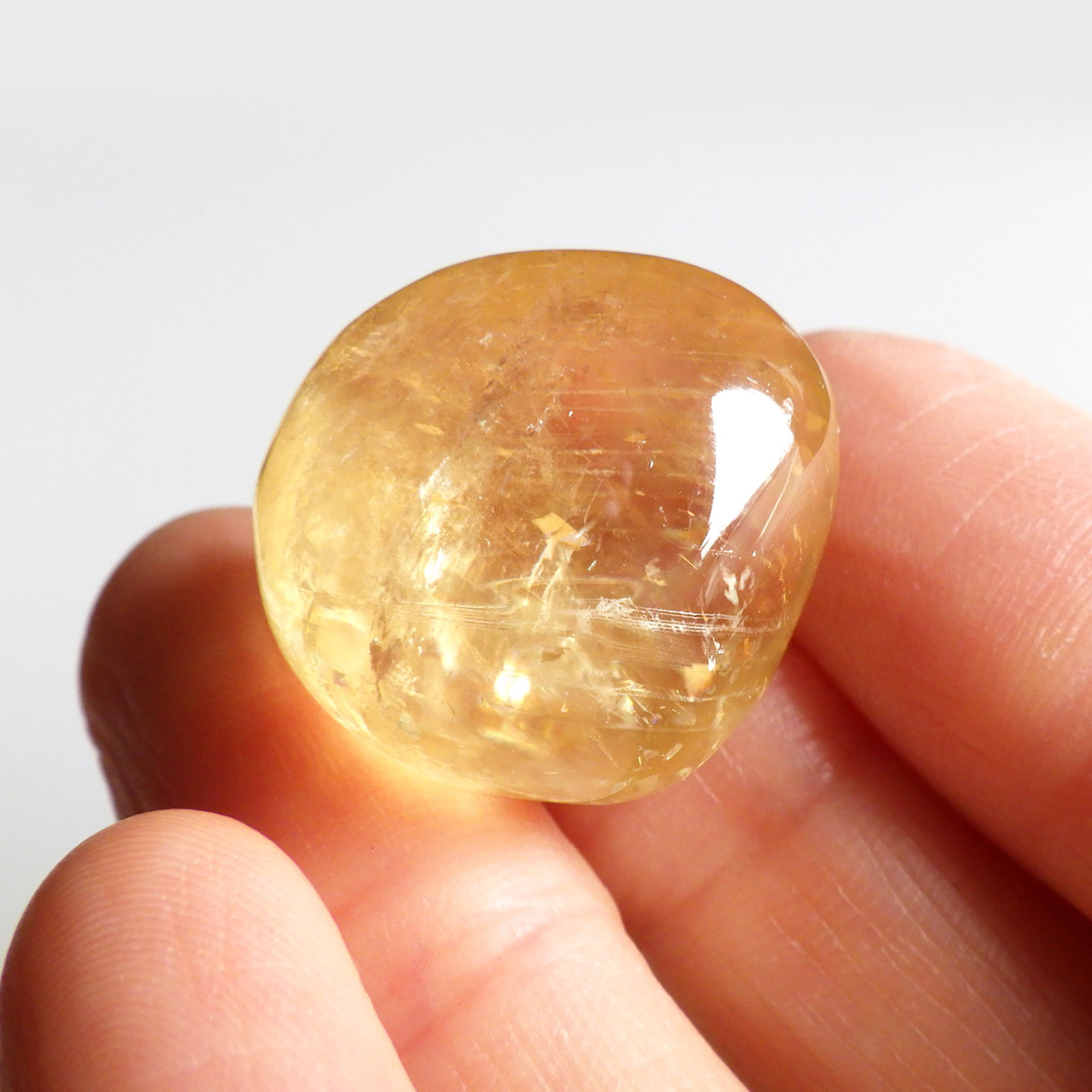 ブラジル産のゴールデンカルサイト、タンブルです。 オレンジカルサイトより透明感があり、黄金色の輝きの中にレインボーが確認できます。様々な表情でひかりますので、ぜひ自然光の元、手に乗せて光を楽しんでみてください。