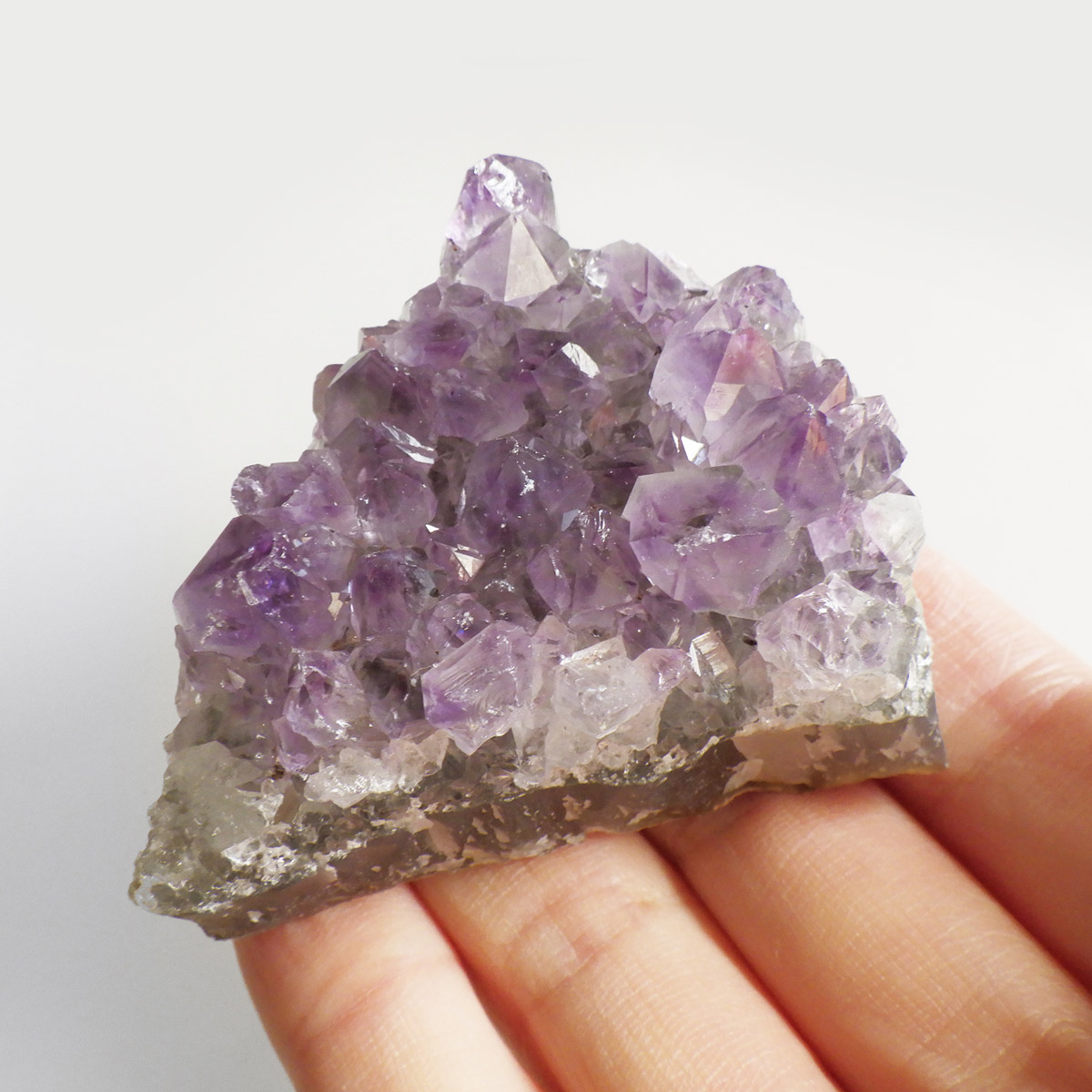 ブラジル産のアメジストクラスターです。クラスターとしては小ぶりですが、透明感のある優しい紫で、グラデーションやレインボーを楽しむ事が出来ます。 ちょこんと机の上などにも置いていただけるちょうど良い大きさだと思います。