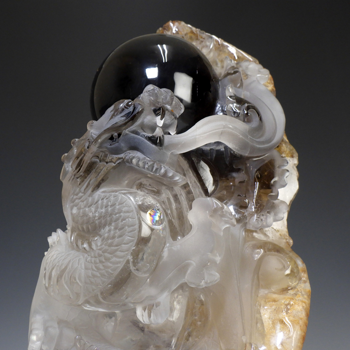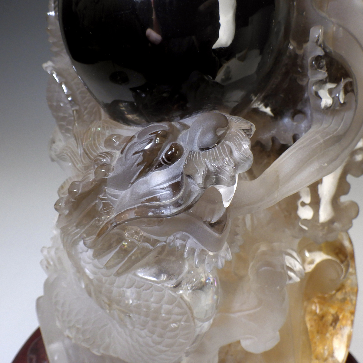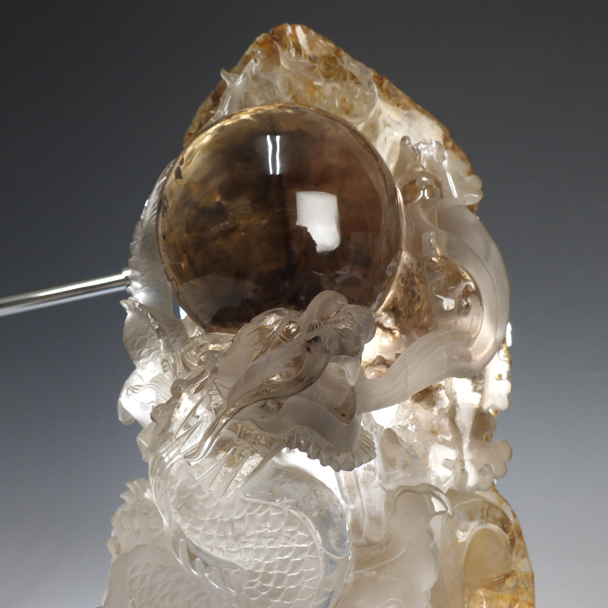 スモーキークォーツの濃い部分を玉にし、迫力がある手彫りになっています。龍はマットに仕上げており、所々にあるレインボーが美しい珍しい一点です。