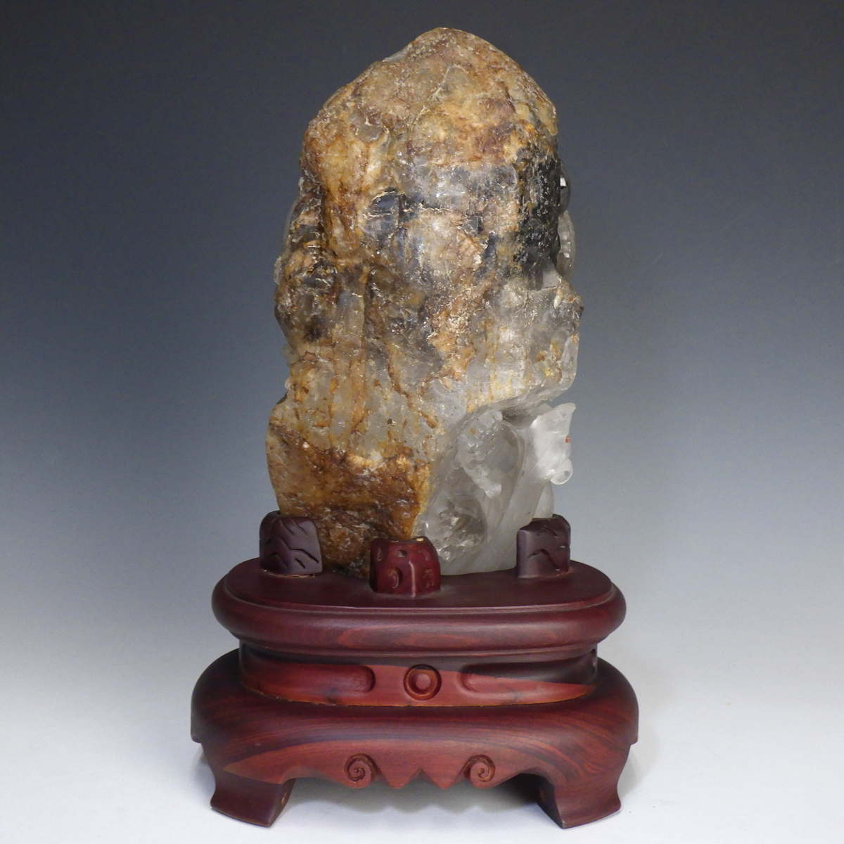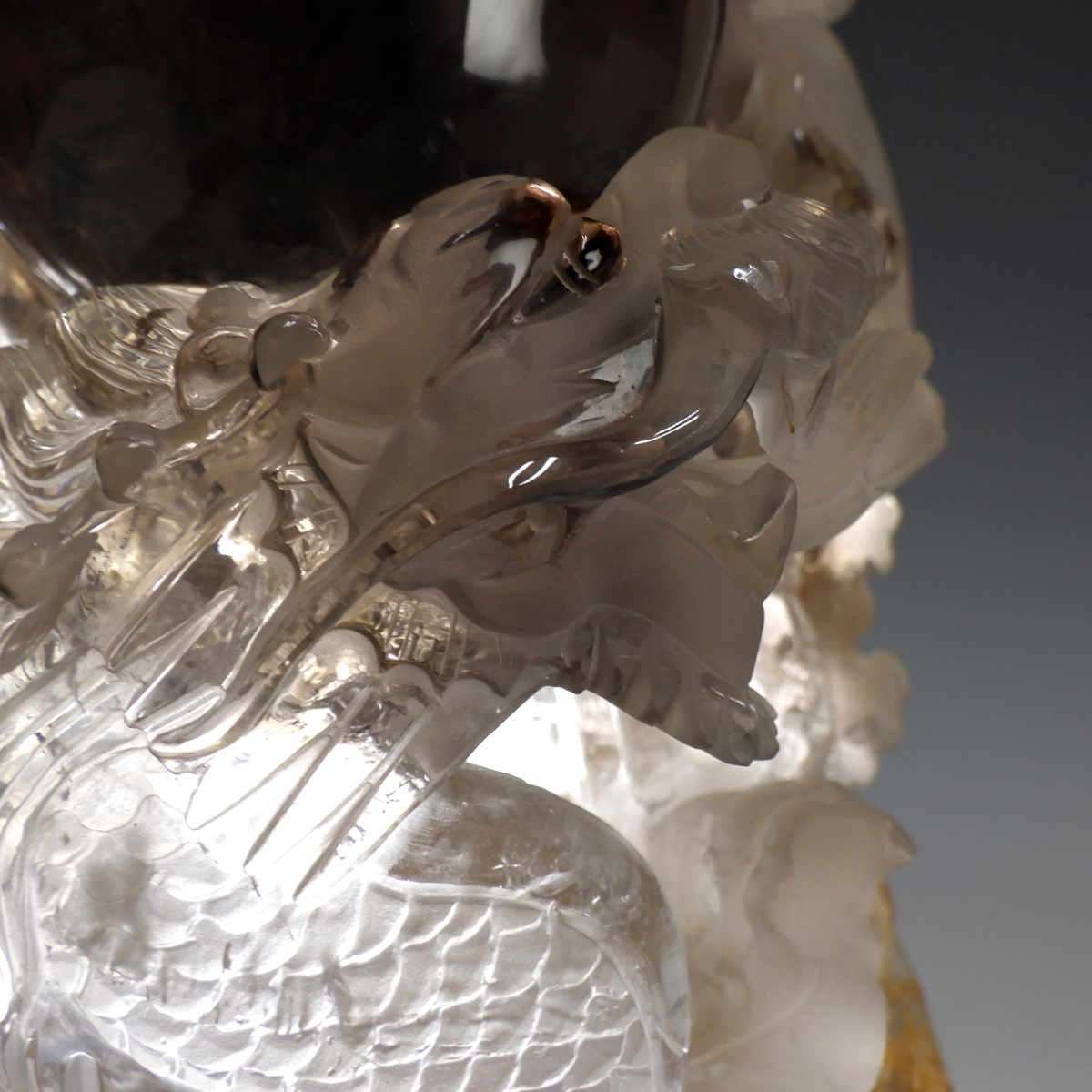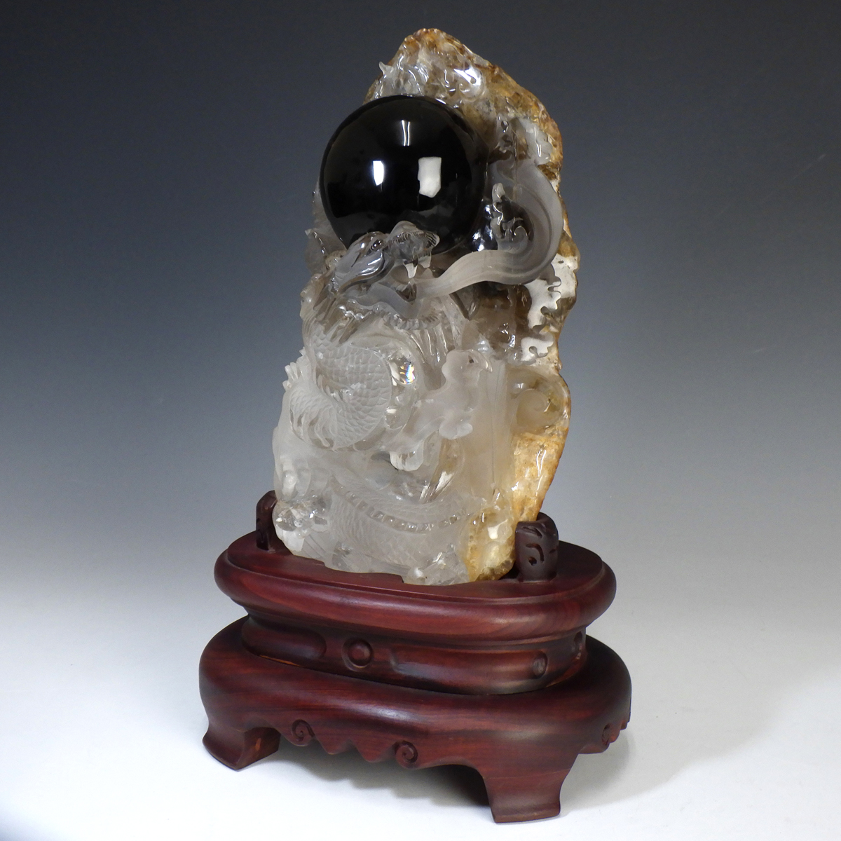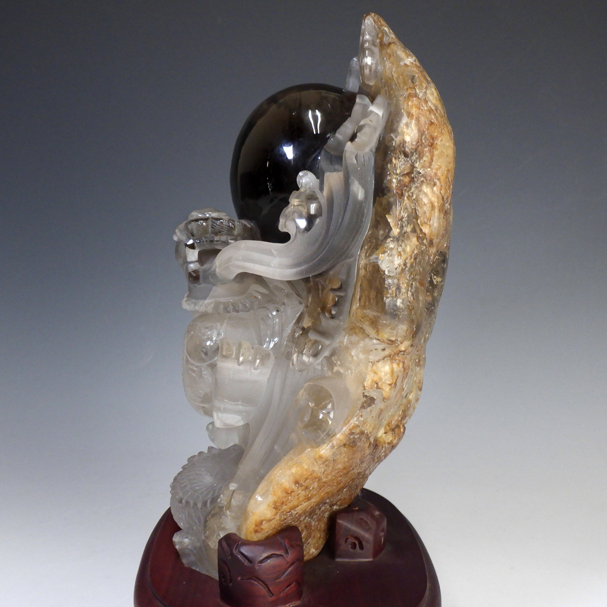 スモーキークォーツの濃い部分を玉にし、迫力がある手彫りになっています。龍はマットに仕上げており、所々にあるレインボーが美しい珍しい一点です。