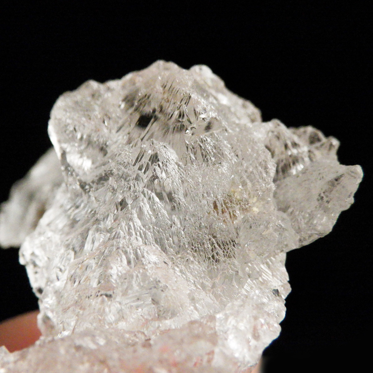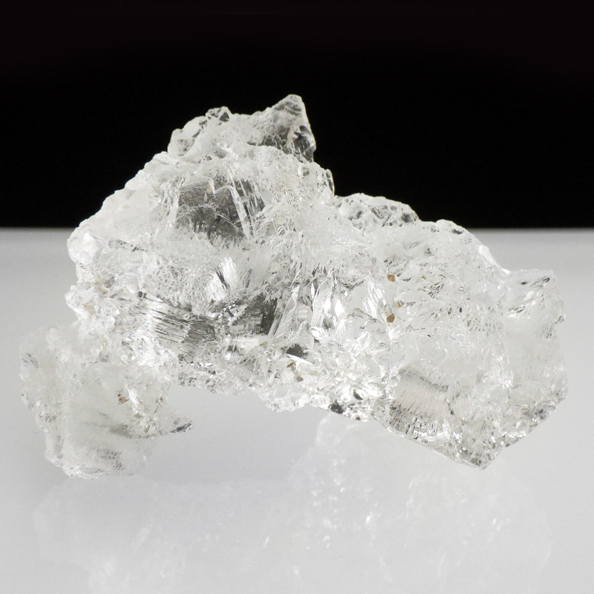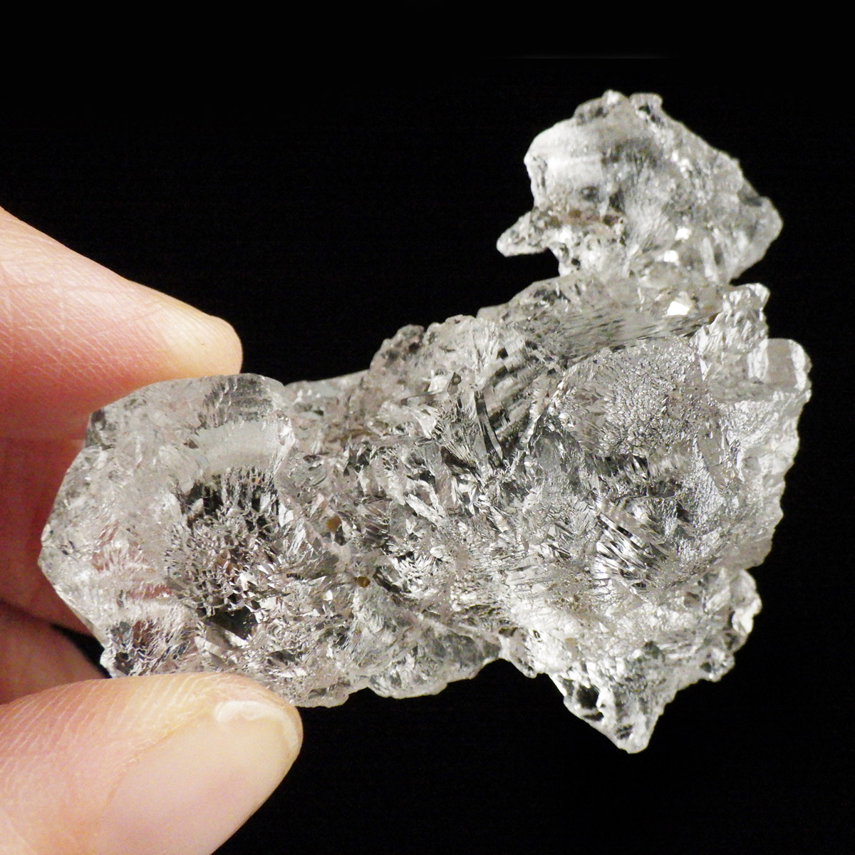 パキスタン北部ギルギット・バルティスタン州にあるスカルドゥ産のアイスクォーツです。スカルドゥはヒマラヤ山脈の西端に位置する標高2500m級の町で世界第2位の標高8611メートルを誇るK2登山の拠点となる町でもあります。温暖化の影響で氷河が溶けて現れたインドのアイスクリスタルとは本来は区別しています。透明度抜群で 非常にピュアな水晶クリスタルです。アイスクォーツは熱水にさらされて結晶表面が溶かされた蝕像水晶(エッチドクォーツ)です。まるで氷のような姿をしています。透明感も美しいのですが、蝕像水晶は自然が作り出した表面の模様が面白く刻まれています。また、こちらの結晶はグリーンのエピドートが共生しています。透明度を保った美しい蝕像結晶というところがこの産地ならではで、奇跡的なクリスタルです。