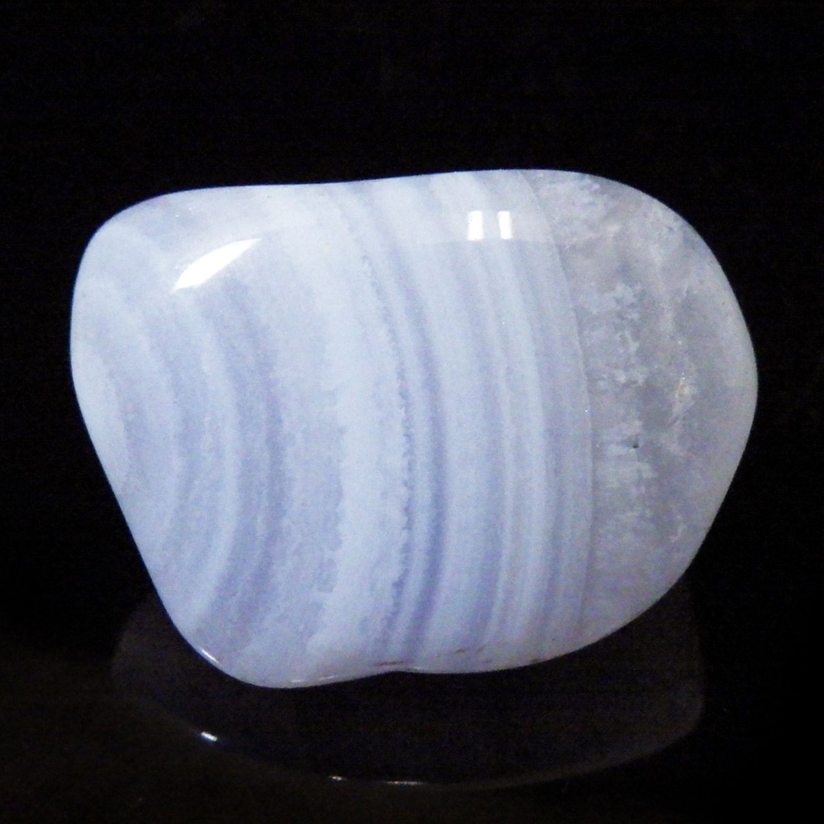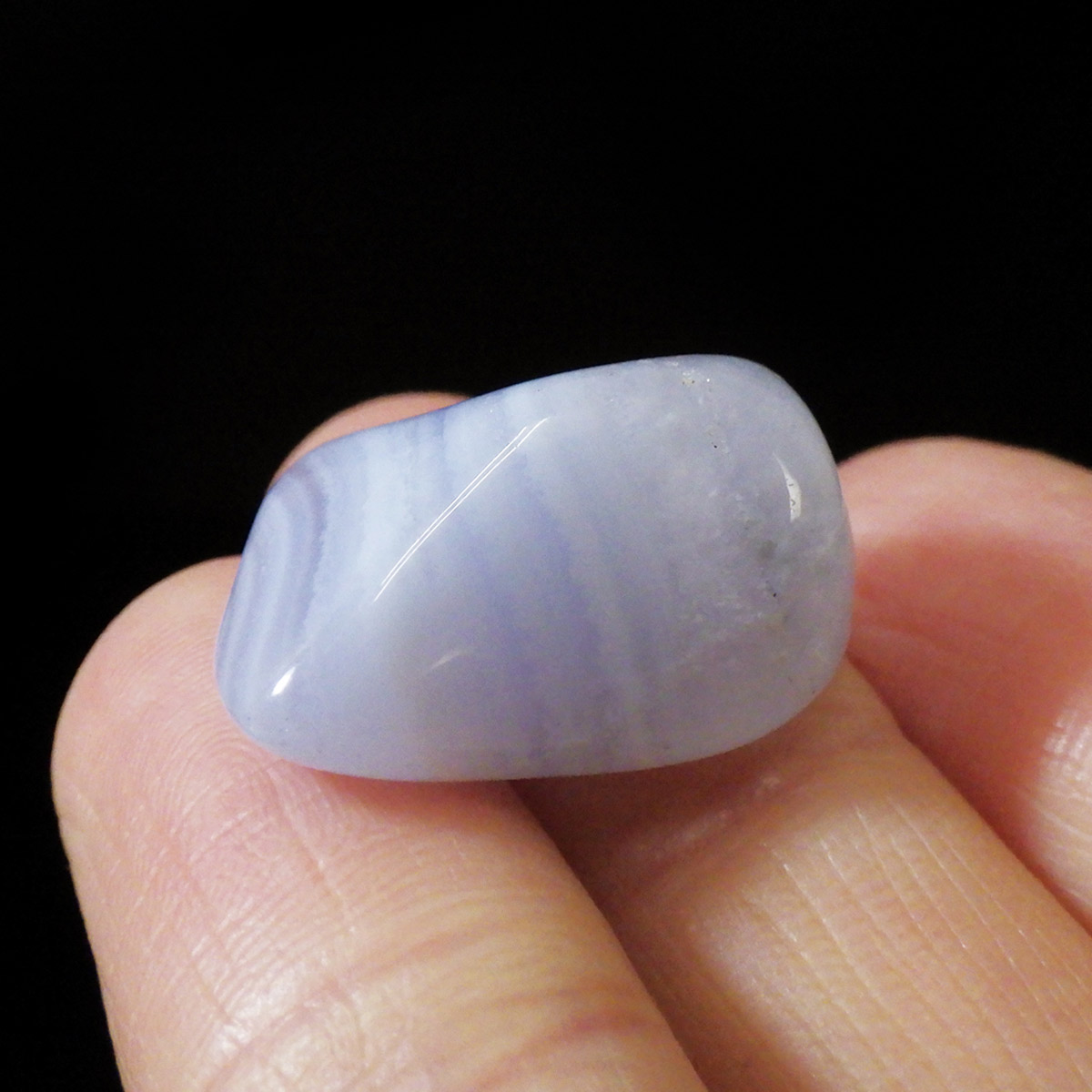 南アフリカ共和国産のブルーレースアゲート、タンブルです。ブルーレースアゲートの和名は「空色縞瑪瑙」。 淡い水色や白色が層状に重なって、まるでレースのように見えることからこの名が付けられました。 近年、縞模様がはっきり見られるブルーレースアゲートの原石が激減しており、今では質の良いものは入手が困難になっています。
