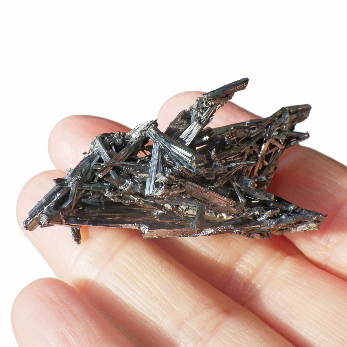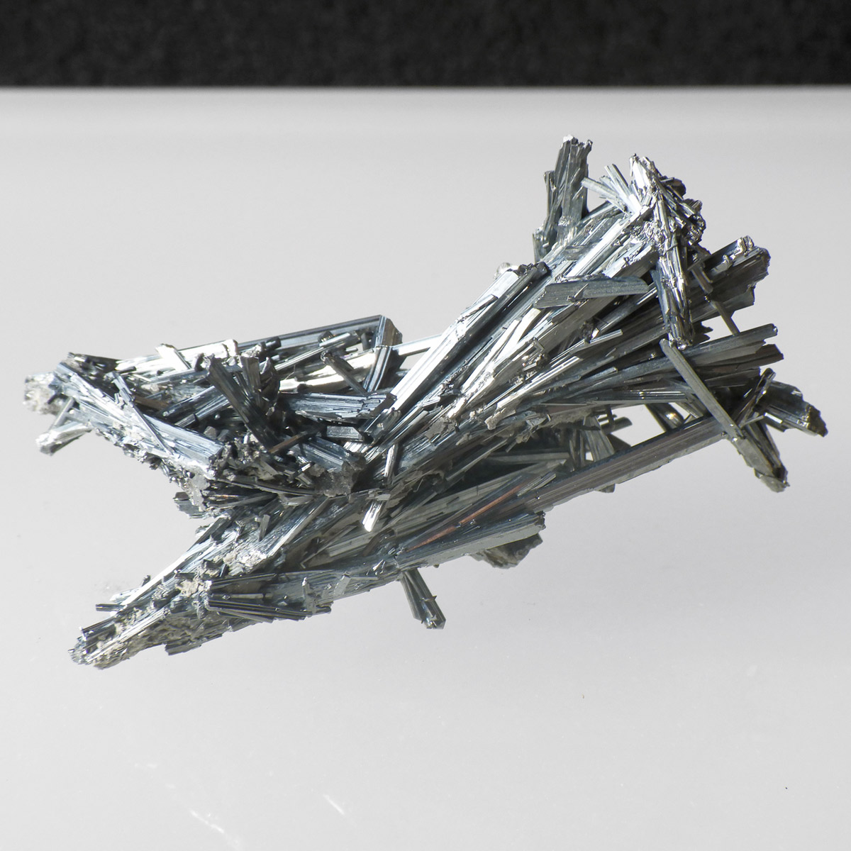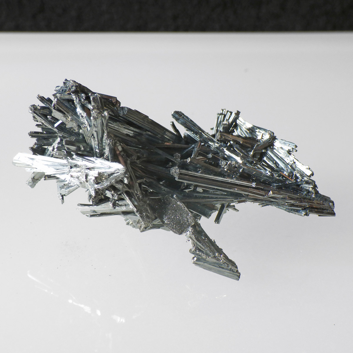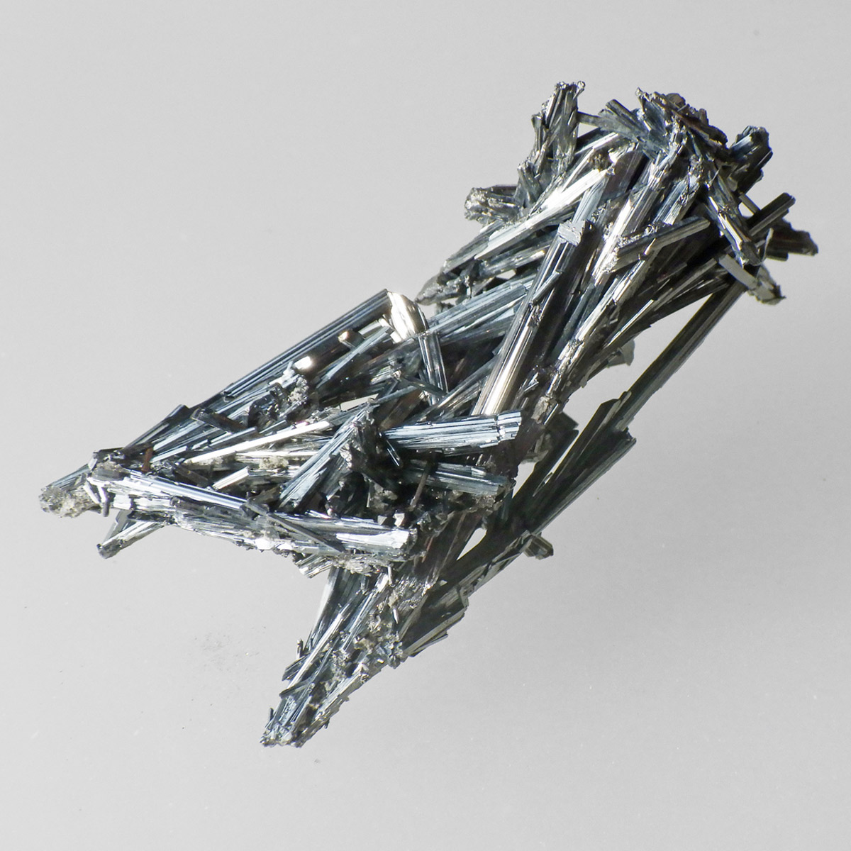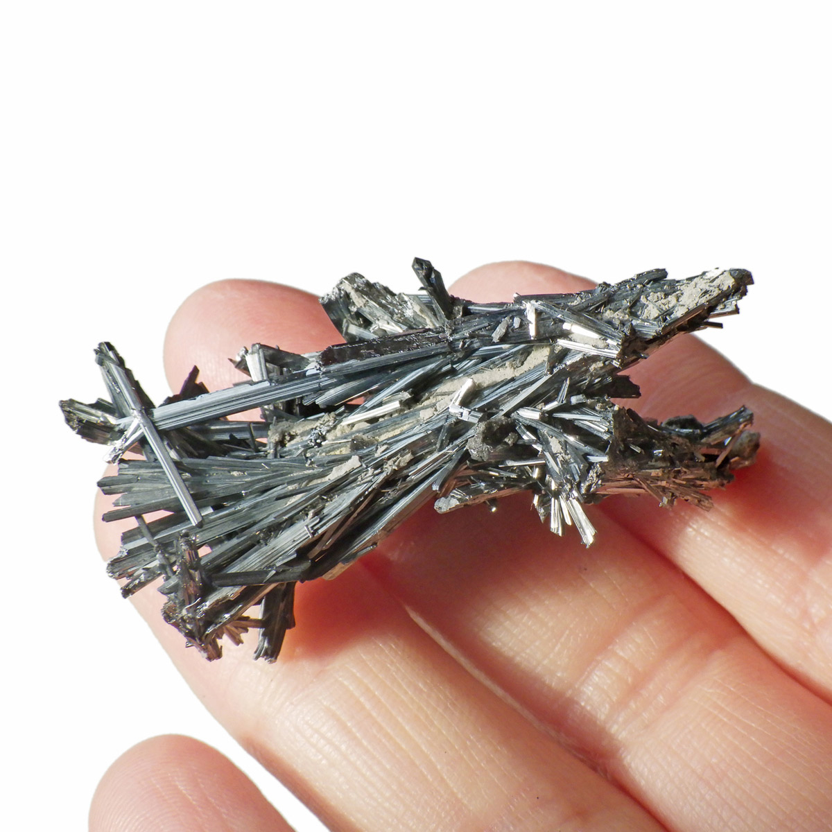 チャイナ産のスティブナイト原石です。和名は輝安鉱。天然のアンチモン化合物。希少鉱物でアンチモン自体はレアメタルに分類されています。シルバーメタルに輝く、金属光沢が非常に美しい鉱物です。硬度は2と低く扱いに注意が必要です。