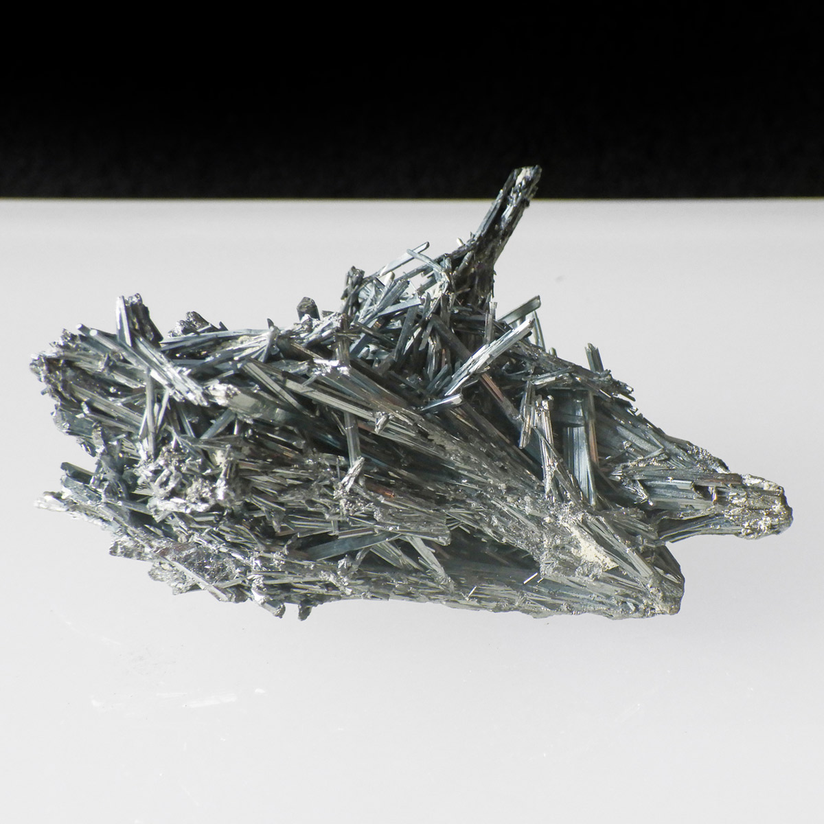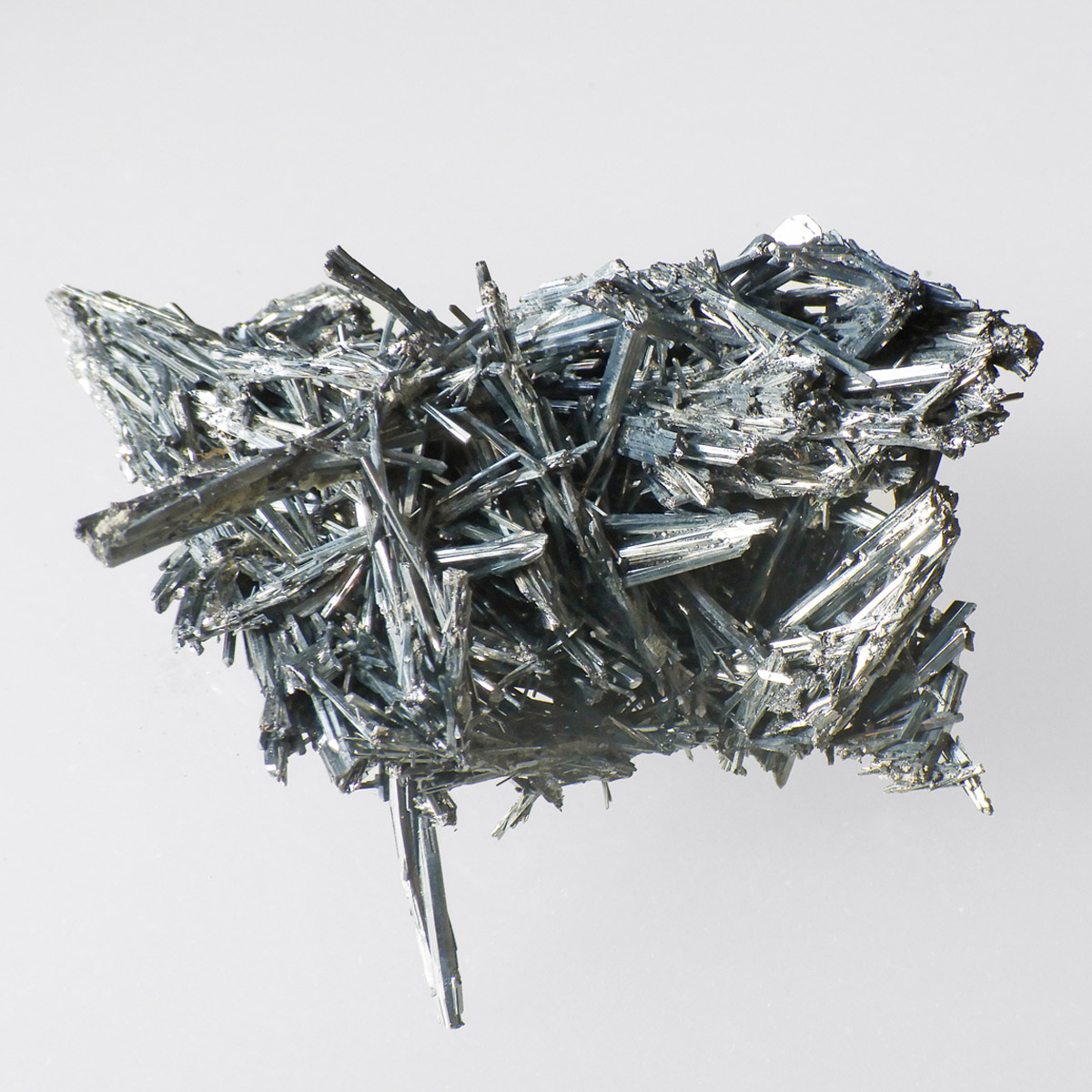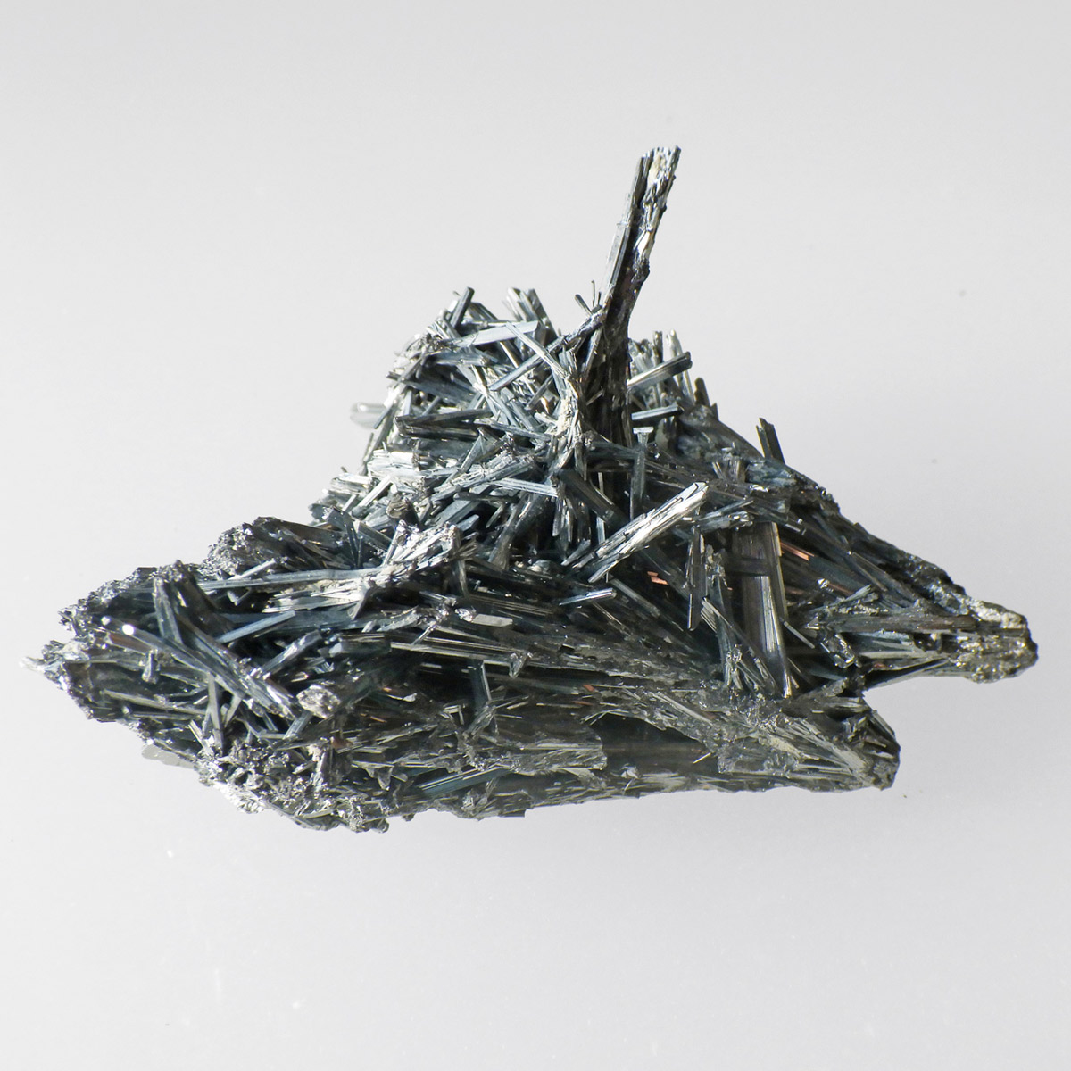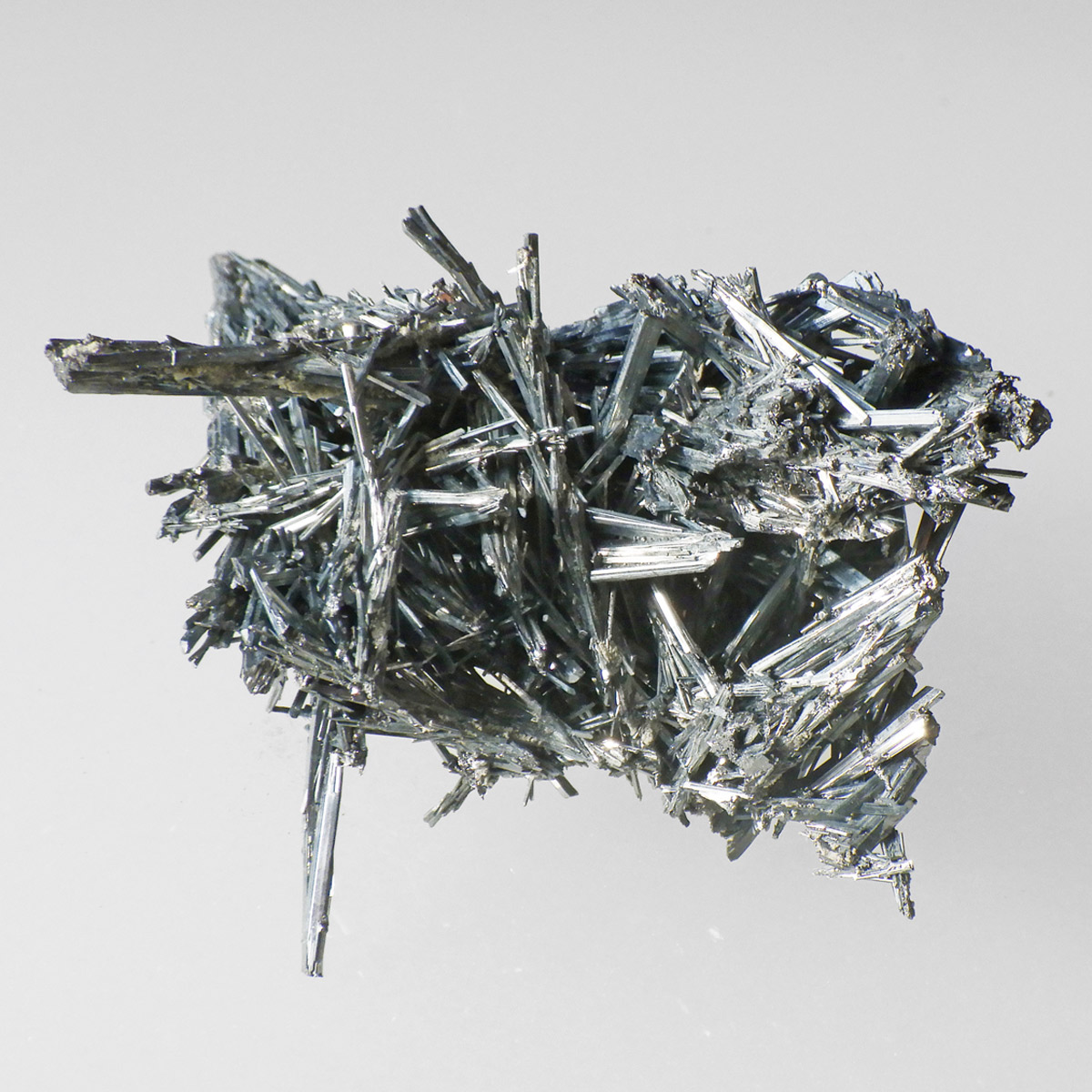 チャイナ産のスティブナイト原石です。和名は輝安鉱。天然のアンチモン化合物。希少鉱物でアンチモン自体はレアメタルに分類されています。シルバーメタルに輝く、金属光沢が非常に美しい鉱物です。硬度は2と低く扱いに注意が必要です。