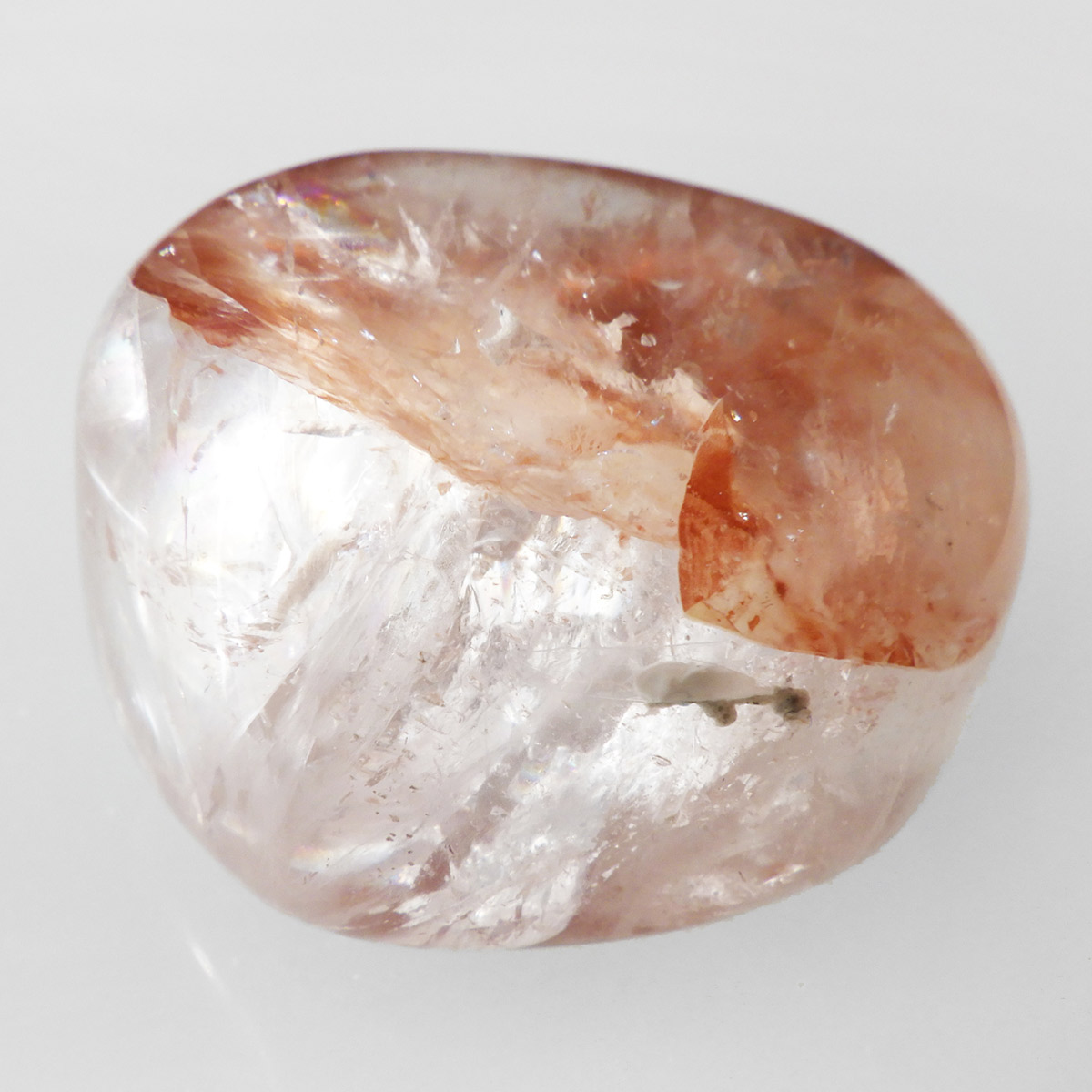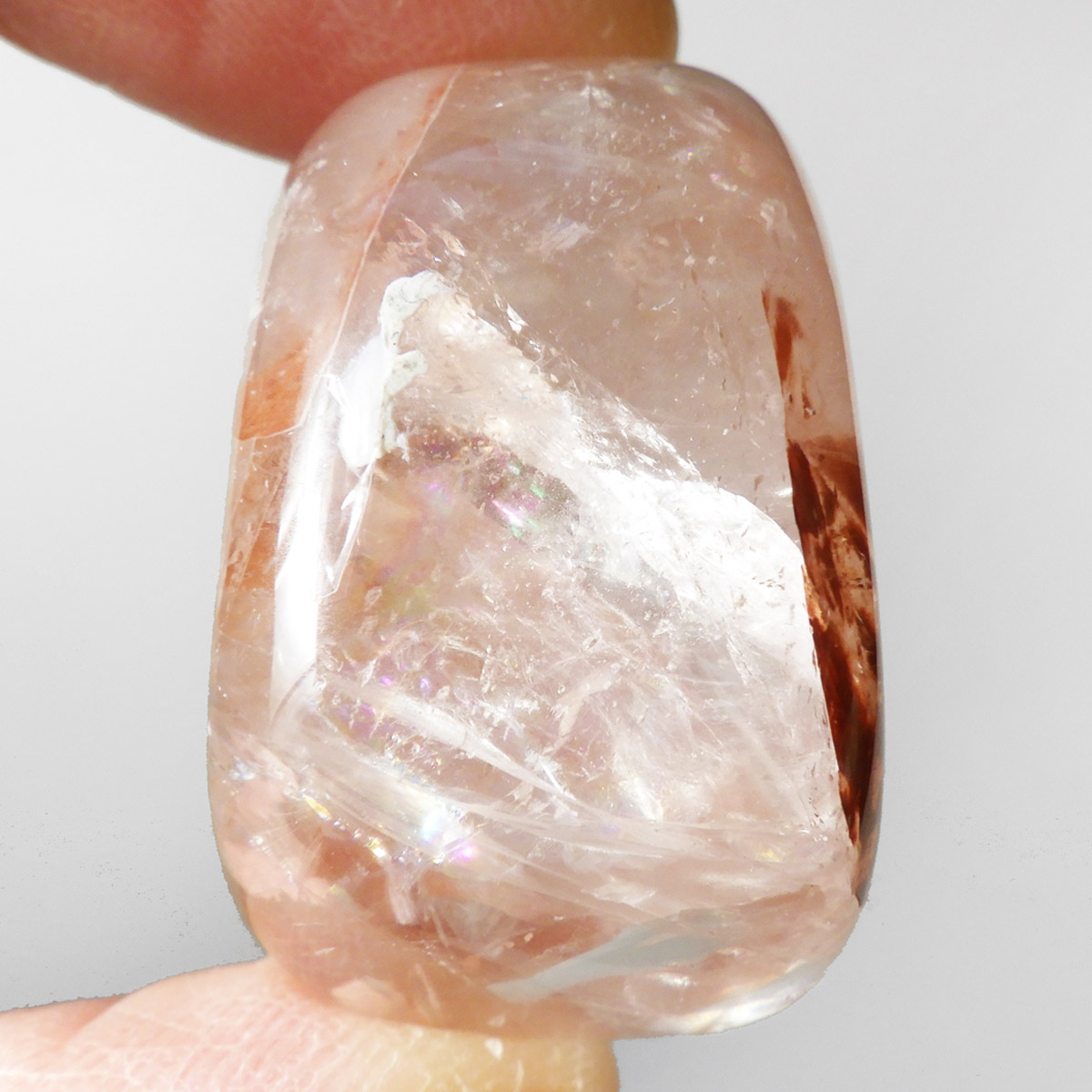 インド産のムーランクォーツ、タンブルです。ムーランクォーツは南インドに産するクォーツで、ヘマタイトによる赤い発色と、オパーライズド(オパール化)された部分がマーブル状に模様を描いています。オパールカルセドニーインクォーツという呼称で流通したこともある人気の石です。エンジェルシリカやジェムシリカといった類の希有な成長を遂げた石になります。