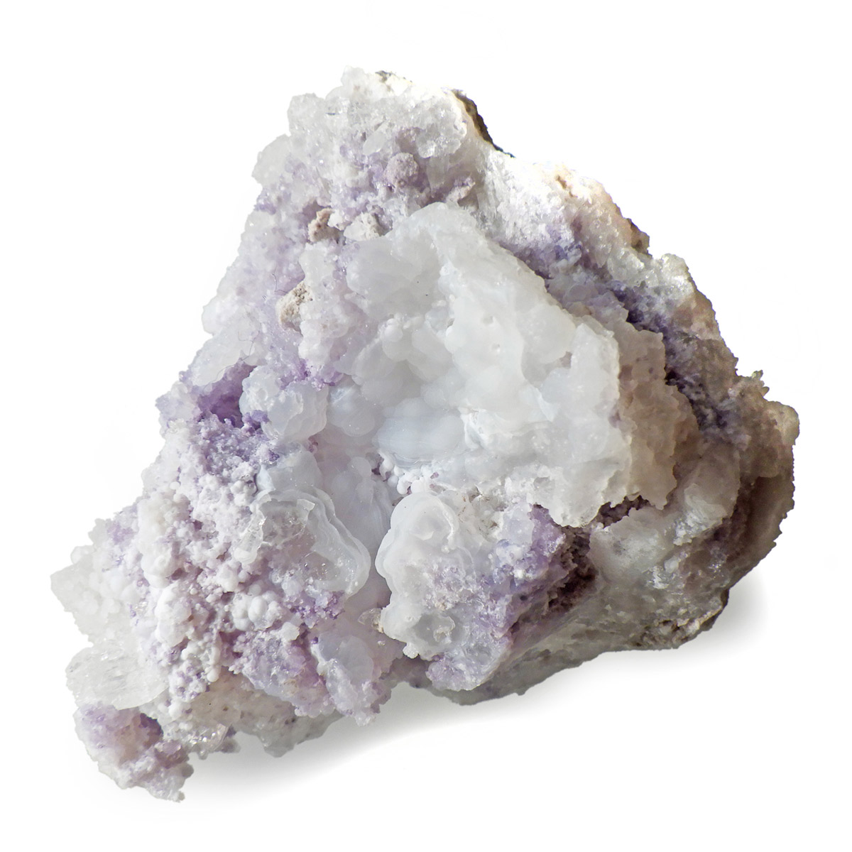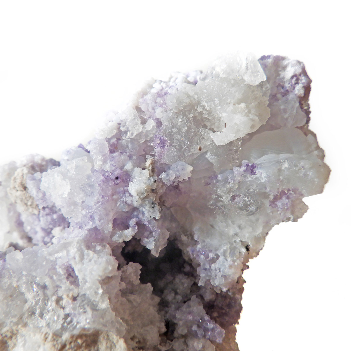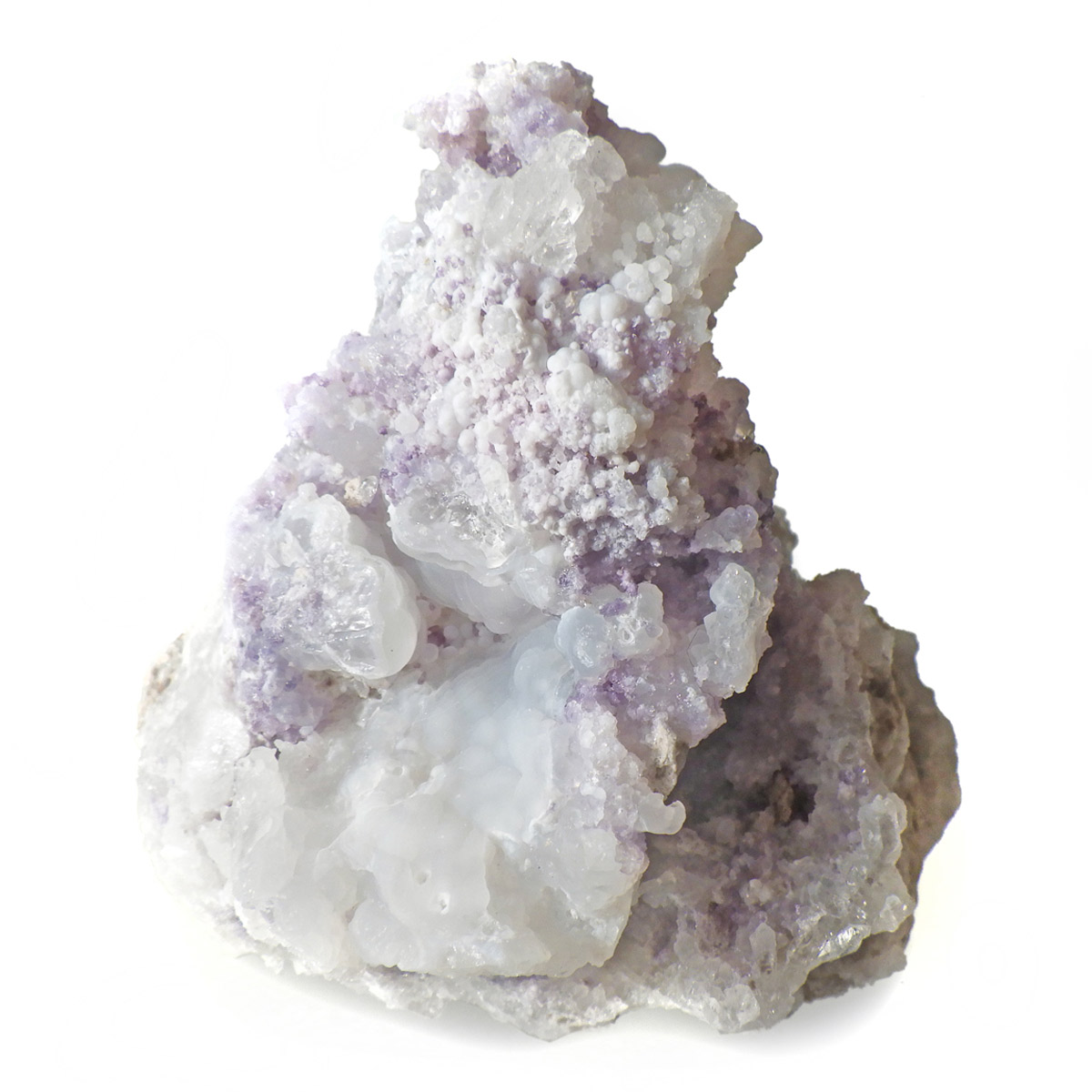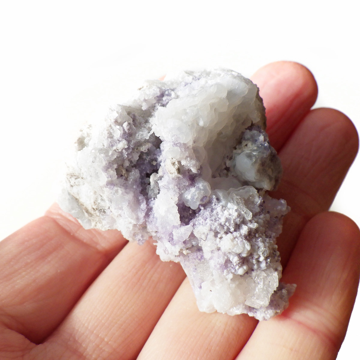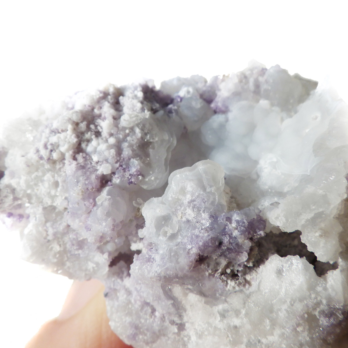 メキシコ産のスピリットフラワージオード原石です。スピリットフラワージオードは新しく発見された特徴的な鉱物でジオード(晶洞)内のカルセドニー、クォーツ、オパールの上にパープルのフローライト成分が乗っかった鉱物になります。モコモコした部分がオパール(ハイアライト)でブラックライトを当てると緑に蛍光します。パープル部分がフローライト成分でブラックライトでパープルに蛍光します。透明な結晶化している部分がクォーツと、蛍光鉱物好き、共生鉱物好き、水晶好き、みんな満足の満腹欲張りセットみたいな面白い鉱物です。