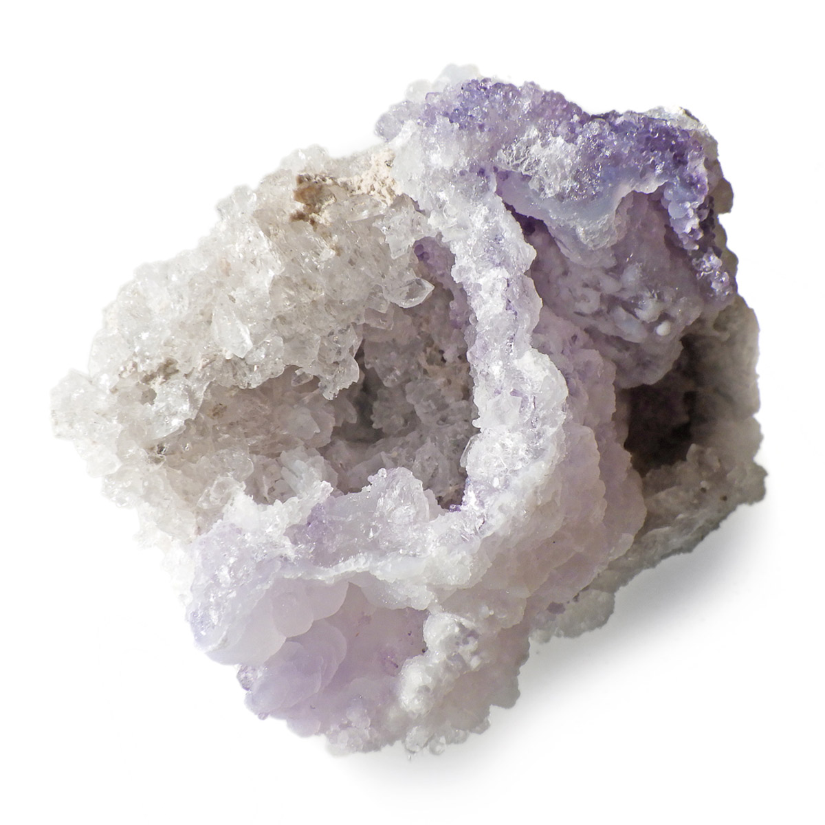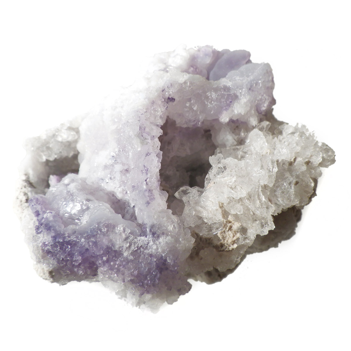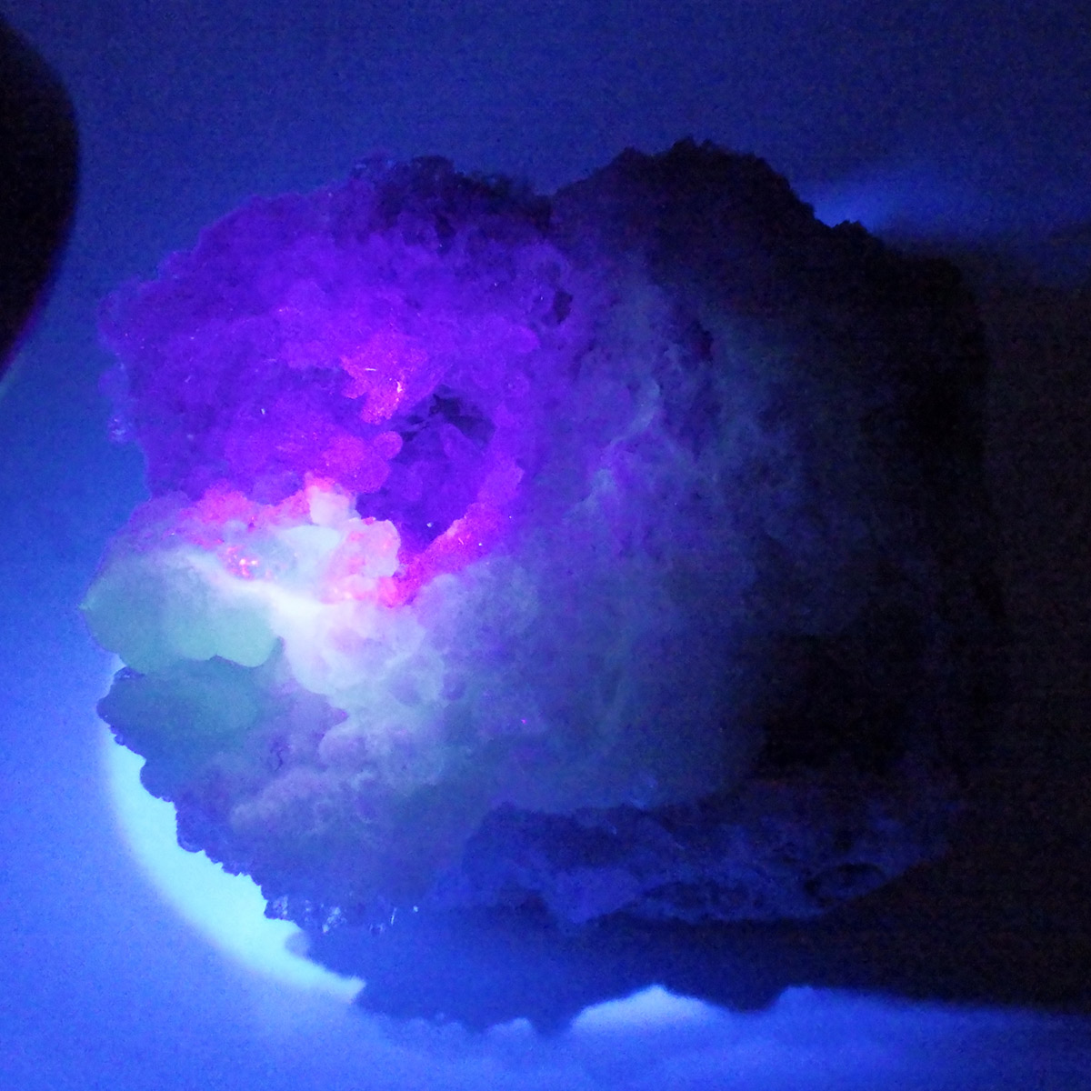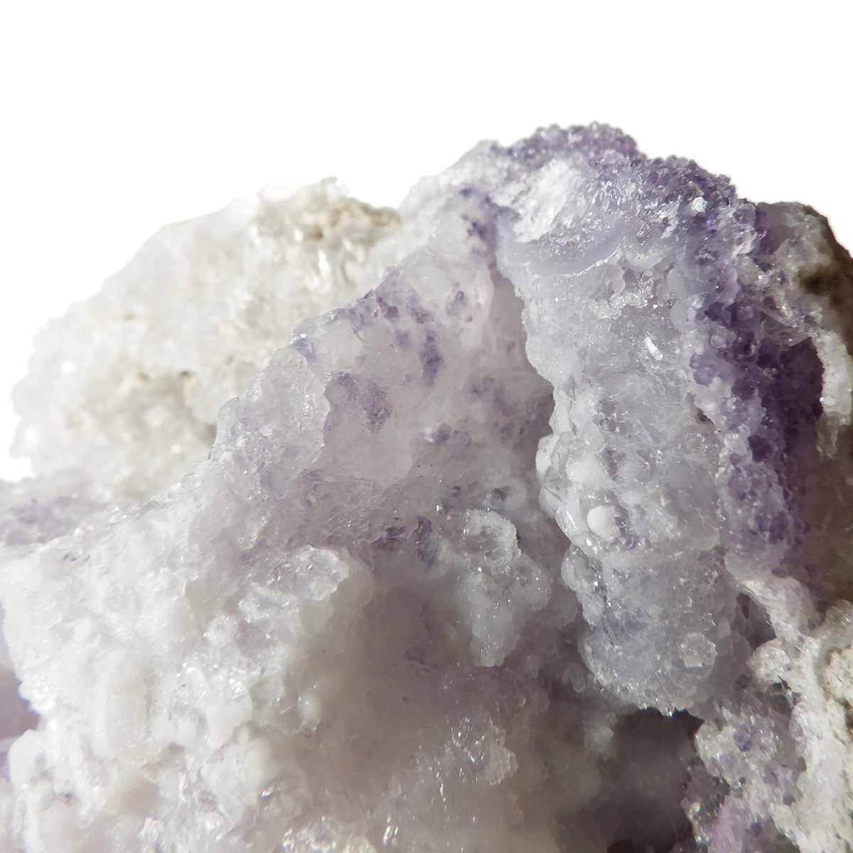 メキシコ産のスピリットフラワージオード原石です。スピリットフラワージオードは新しく発見された特徴的な鉱物でジオード(晶洞)内のカルセドニー、クォーツ、オパールの上にパープルのフローライト成分が乗っかった鉱物になります。モコモコした部分がオパール(ハイアライト)でブラックライトを当てると緑に蛍光します。パープル部分がフローライト成分でブラックライトでパープルに蛍光します。透明な結晶化している部分がクォーツと、蛍光鉱物好き、共生鉱物好き、水晶好き、みんな満足の満腹欲張りセットみたいな面白い鉱物です。