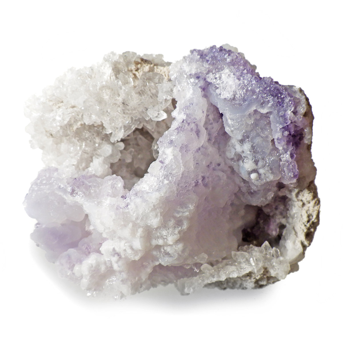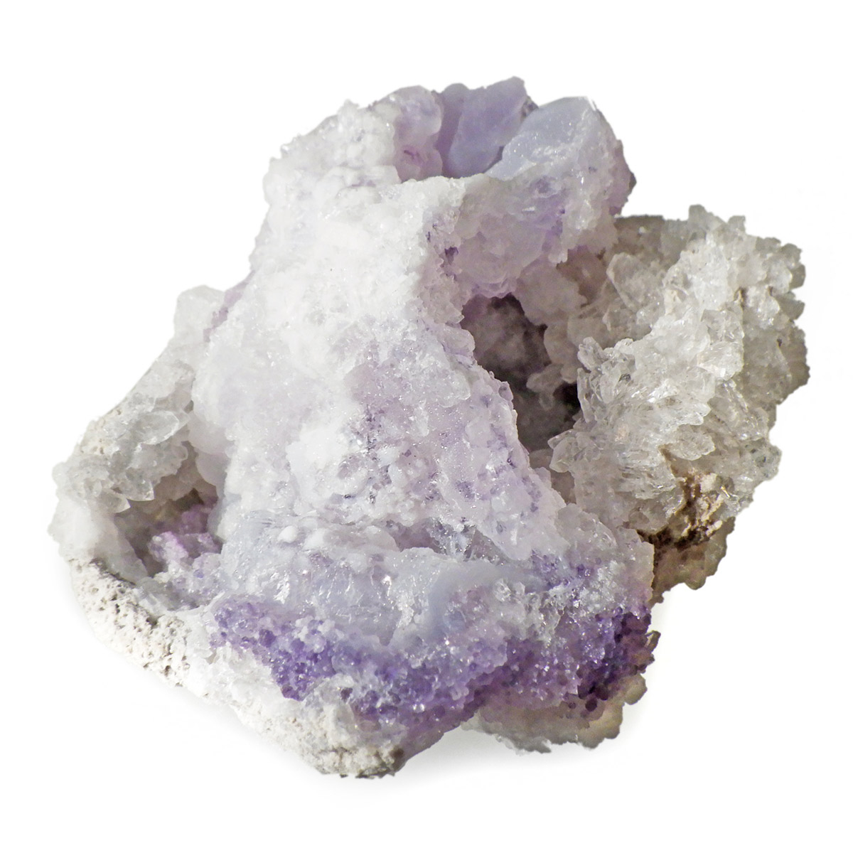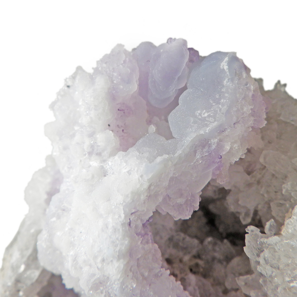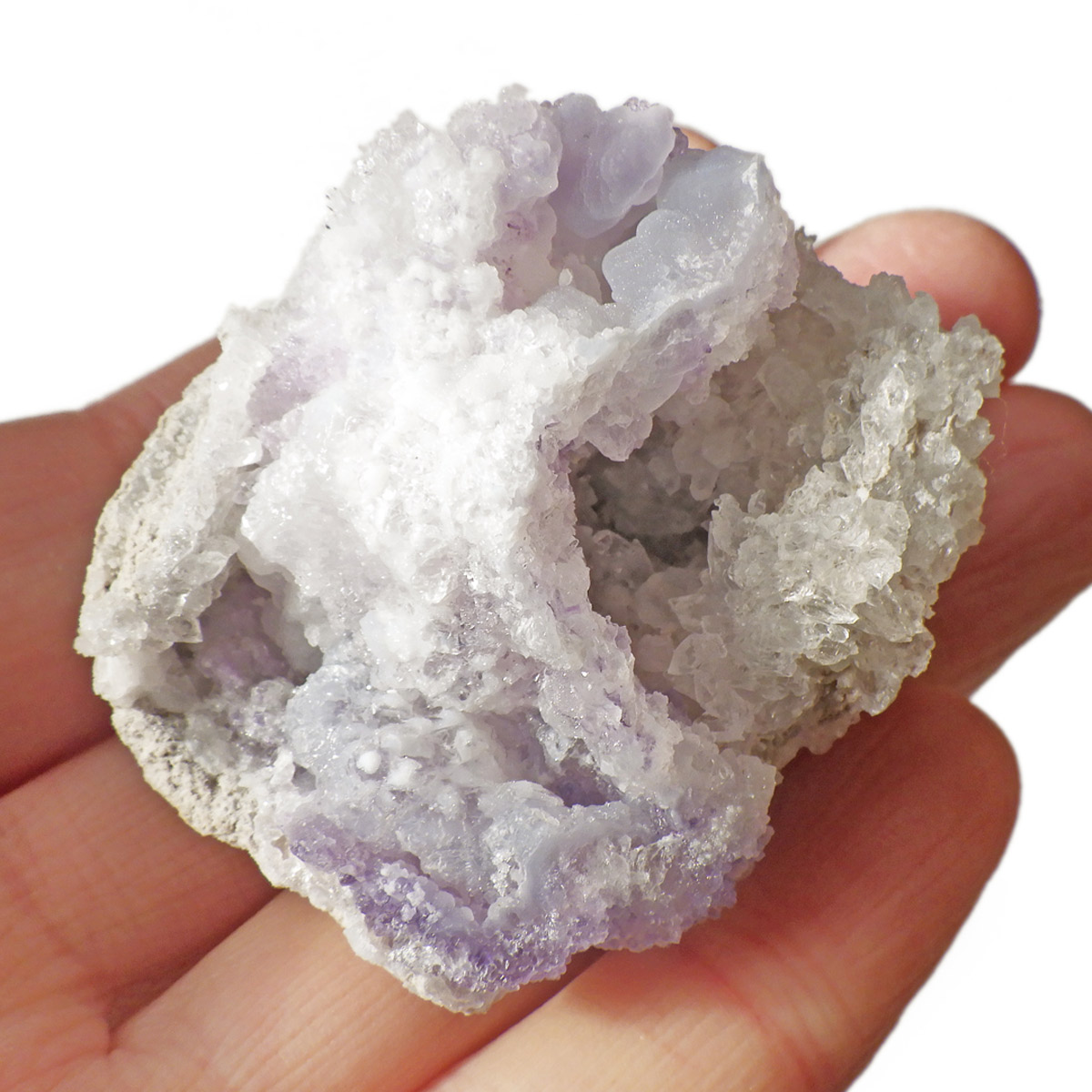 メキシコ産のスピリットフラワージオード原石です。スピリットフラワージオードは新しく発見された特徴的な鉱物でジオード(晶洞)内のカルセドニー、クォーツ、オパールの上にパープルのフローライト成分が乗っかった鉱物になります。モコモコした部分がオパール(ハイアライト)でブラックライトを当てると緑に蛍光します。パープル部分がフローライト成分でブラックライトでパープルに蛍光します。透明な結晶化している部分がクォーツと、蛍光鉱物好き、共生鉱物好き、水晶好き、みんな満足の満腹欲張りセットみたいな面白い鉱物です。