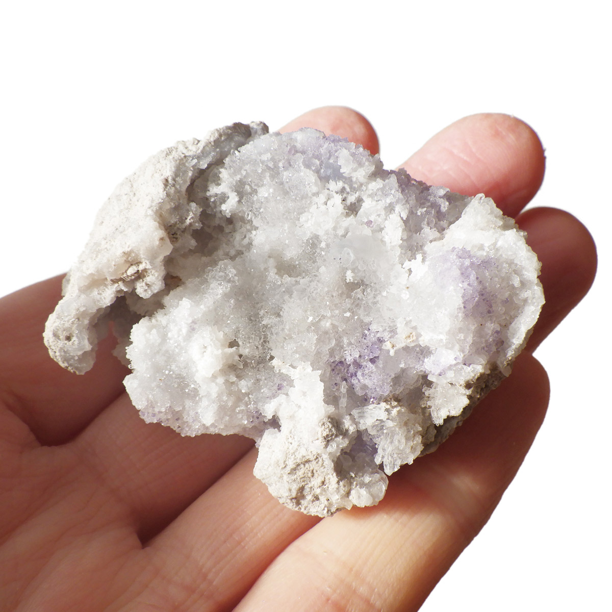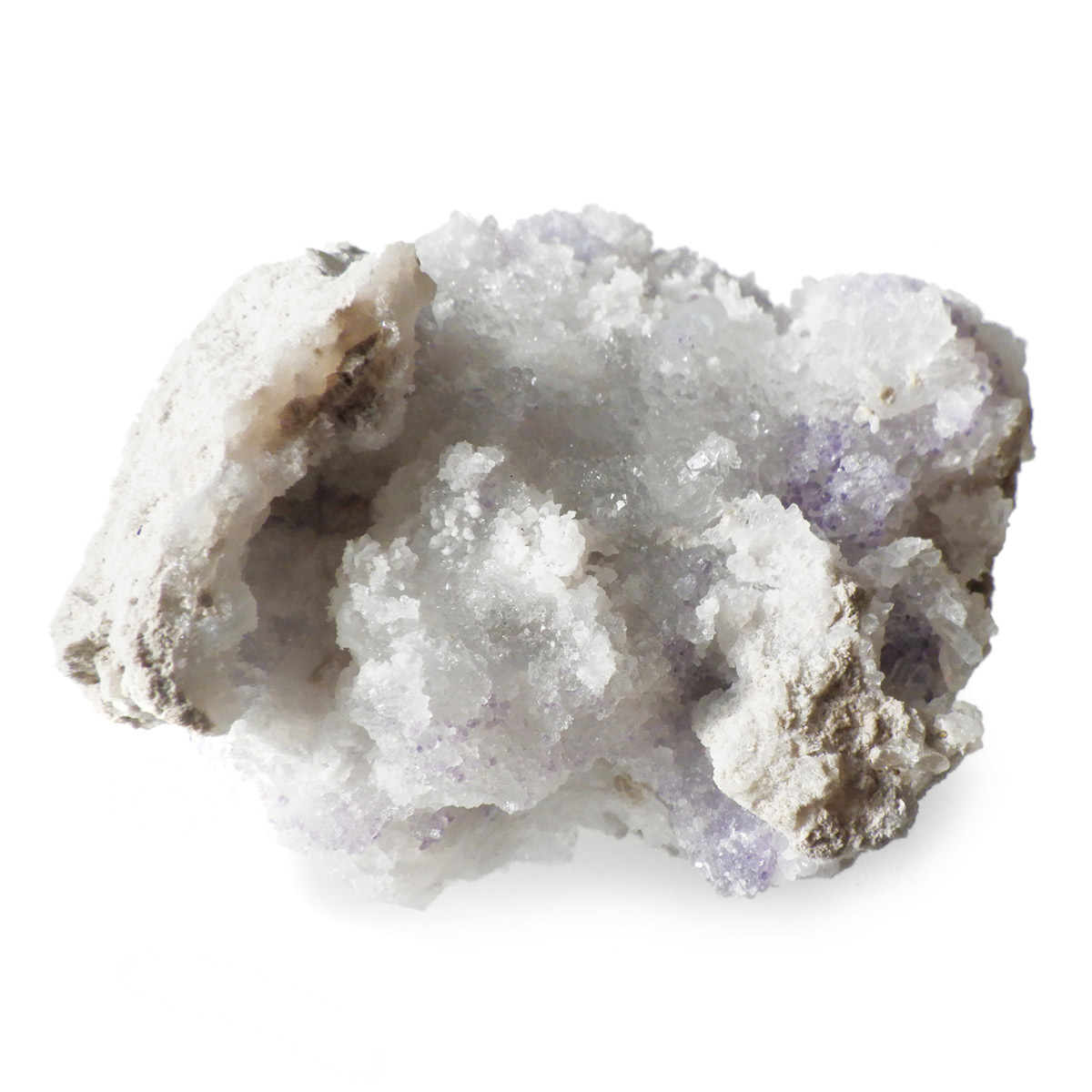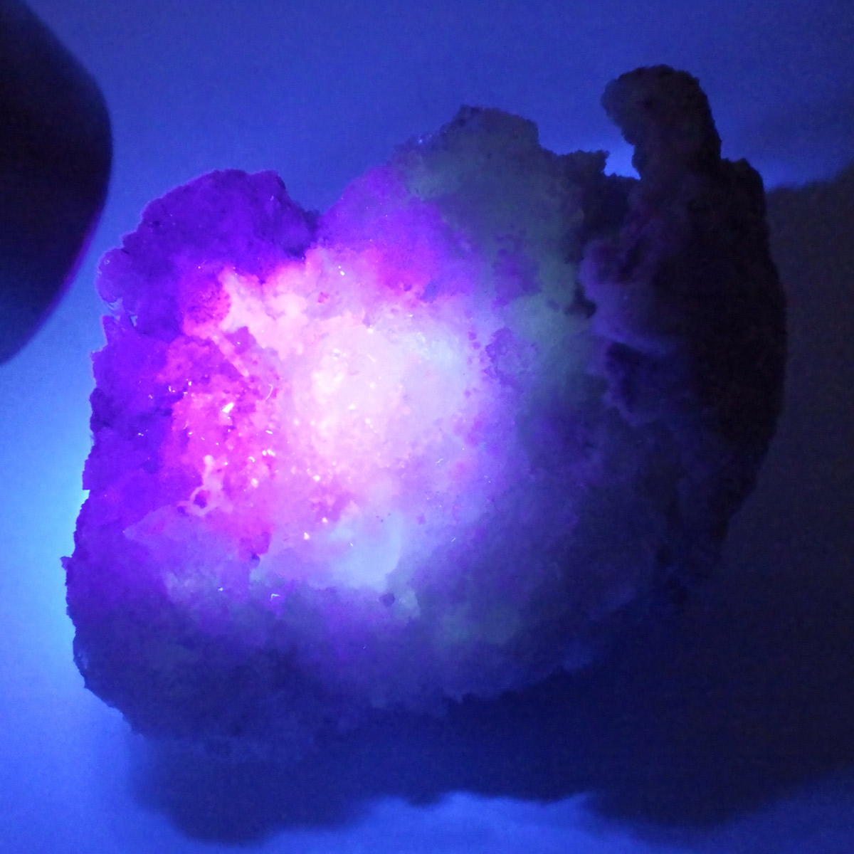 メキシコ産のスピリットフラワージオード原石です。スピリットフラワージオードは新しく発見された特徴的な鉱物でジオード(晶洞)内のカルセドニー、クォーツ、オパールの上にパープルのフローライト成分が乗っかった鉱物になります。モコモコした部分がオパール(ハイアライト)でブラックライトを当てると緑に蛍光します。パープル部分がフローライト成分でブラックライトでパープルに蛍光します。透明な結晶化している部分がクォーツと、蛍光鉱物好き、共生鉱物好き、水晶好き、みんな満足の満腹欲張りセットみたいな面白い鉱物です。