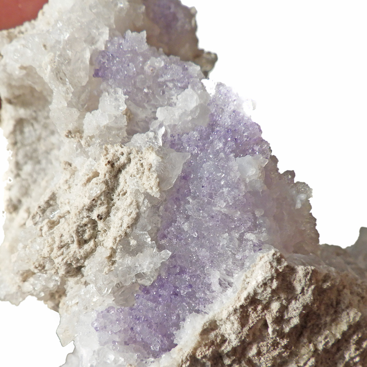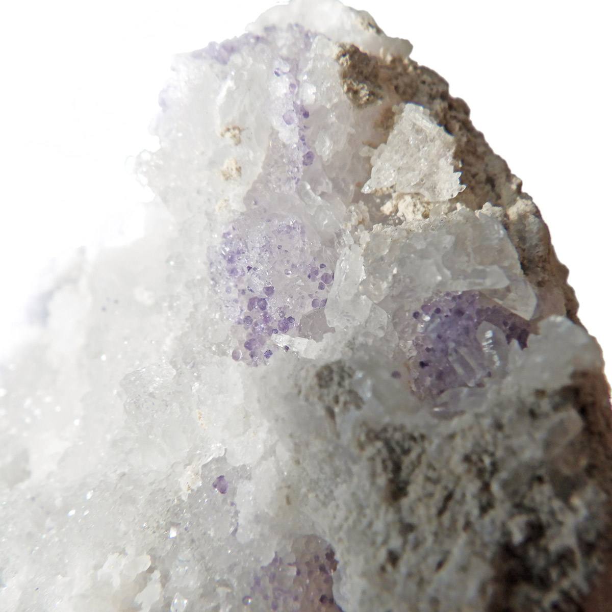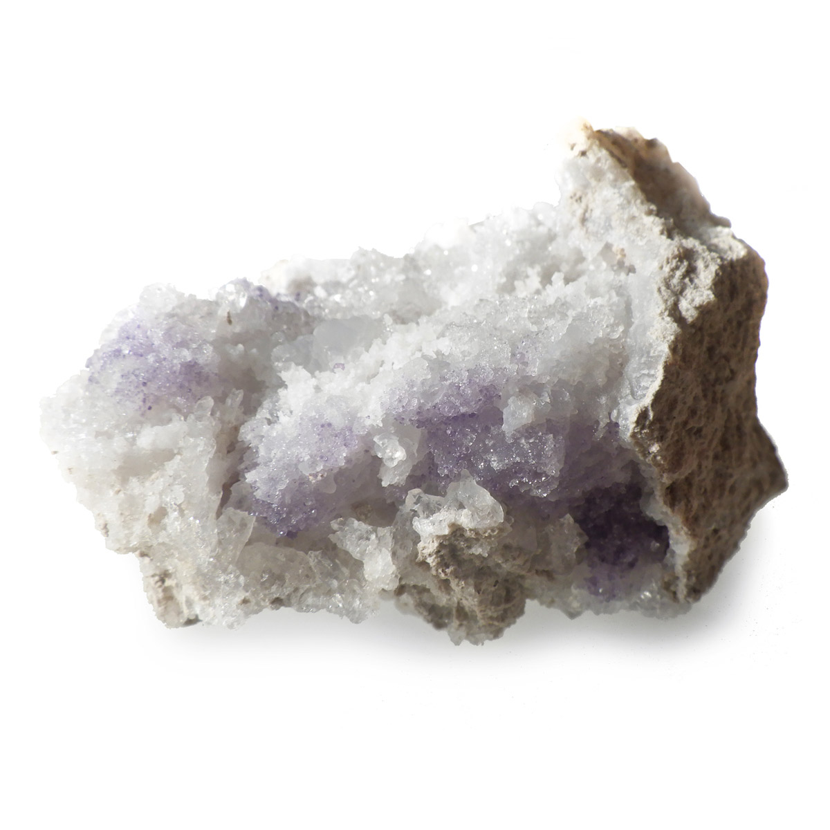 メキシコ産のスピリットフラワージオード原石です。スピリットフラワージオードは新しく発見された特徴的な鉱物でジオード(晶洞)内のカルセドニー、クォーツ、オパールの上にパープルのフローライト成分が乗っかった鉱物になります。モコモコした部分がオパール(ハイアライト)でブラックライトを当てると緑に蛍光します。パープル部分がフローライト成分でブラックライトでパープルに蛍光します。透明な結晶化している部分がクォーツと、蛍光鉱物好き、共生鉱物好き、水晶好き、みんな満足の満腹欲張りセットみたいな面白い鉱物です。
