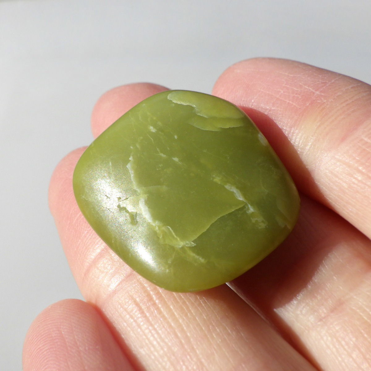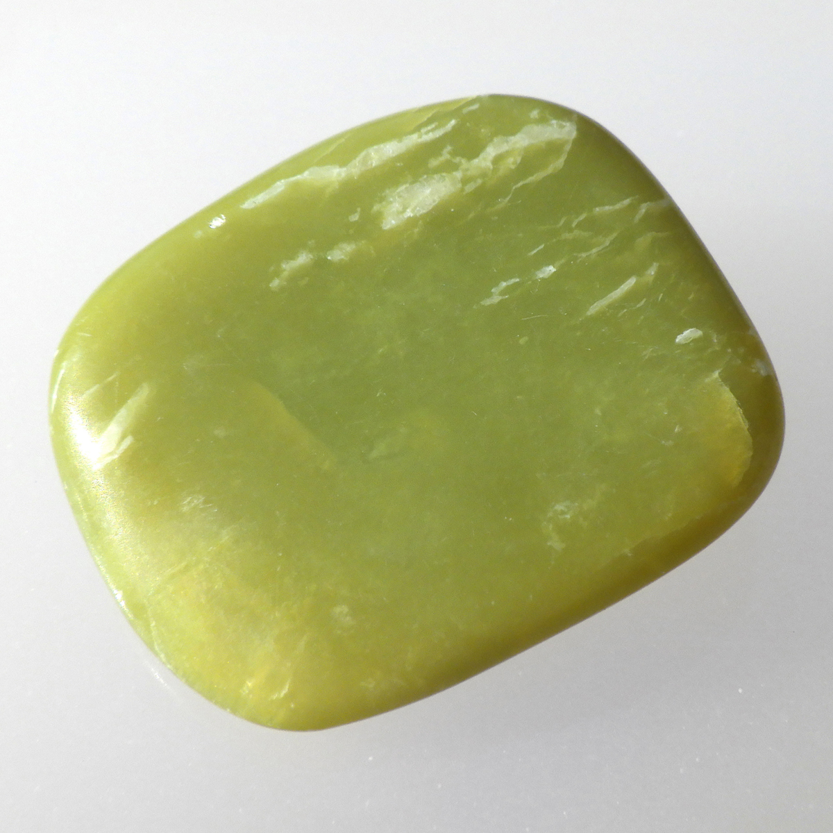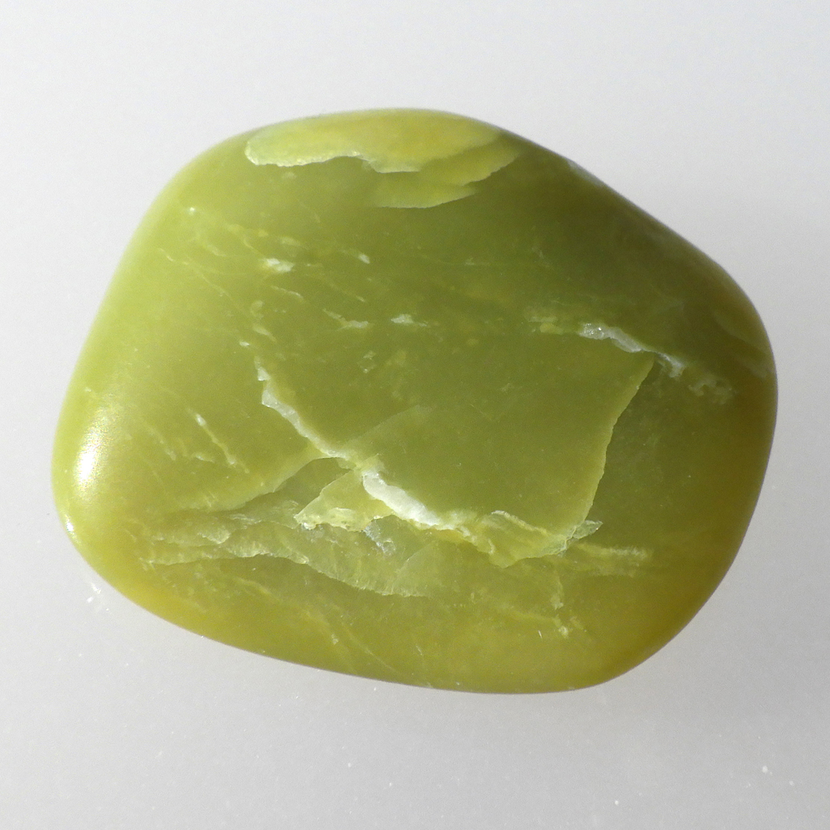 アメリカ・ワシントン州産のワシントンサーペンティン(ヒーラーライト)、タンブルです。 ワシントンサーペンティン(ヒーラーライト)は、明るいライムグリーン色をしており、やわらかな感触があります。 パッと見た感じは黄色の印象が強いと思いますが、良く見てみると黄色ではなくもっと複雑で独特の色合いをしていることが分かります。 アメリカの北西部で新しく発見されたケイ酸マグネシウムで、マグネサイト鉱脈から、マグネサイトと一緒に発掘されます。