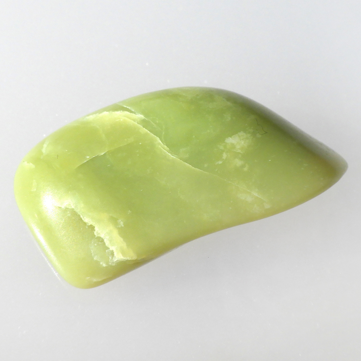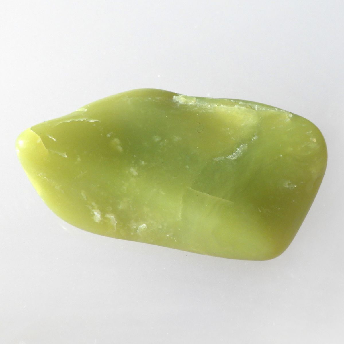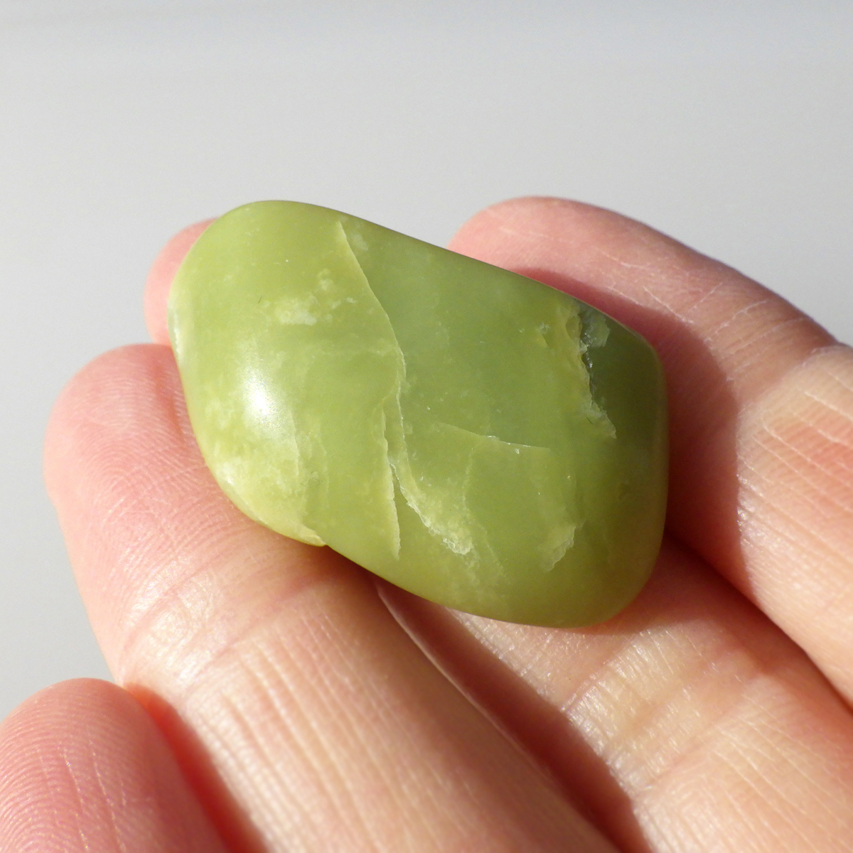 アメリカ・ワシントン州産のワシントンサーペンティン(ヒーラーライト)、タンブルです。 ワシントンサーペンティン(ヒーラーライト)は、明るいライムグリーン色をしており、やわらかな感触があります。 パッと見た感じは黄色の印象が強いと思いますが、良く見てみると黄色ではなくもっと複雑で独特の色合いをしていることが分かります。 アメリカの北西部で新しく発見されたケイ酸マグネシウムで、マグネサイト鉱脈から、マグネサイトと一緒に発掘されます。