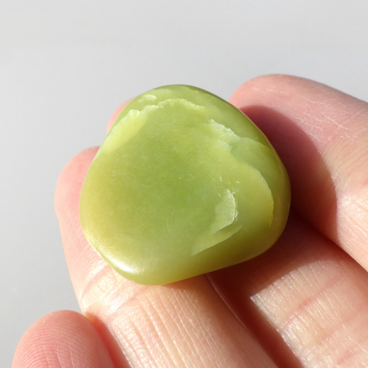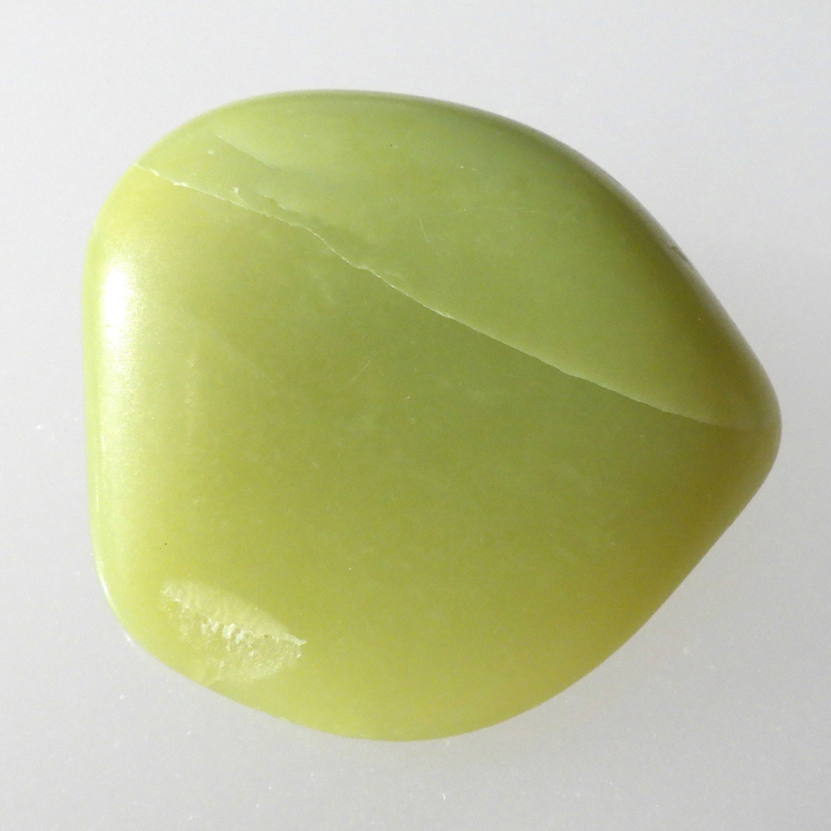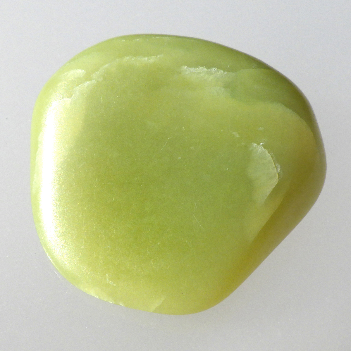 アメリカ・ワシントン州産のワシントンサーペンティン(ヒーラーライト)、タンブルです。 ワシントンサーペンティン(ヒーラーライト)は、明るいライムグリーン色をしており、やわらかな感触があります。 パッと見た感じは黄色の印象が強いと思いますが、良く見てみると黄色ではなくもっと複雑で独特の色合いをしていることが分かります。 アメリカの北西部で新しく発見されたケイ酸マグネシウムで、マグネサイト鉱脈から、マグネサイトと一緒に発掘されます。