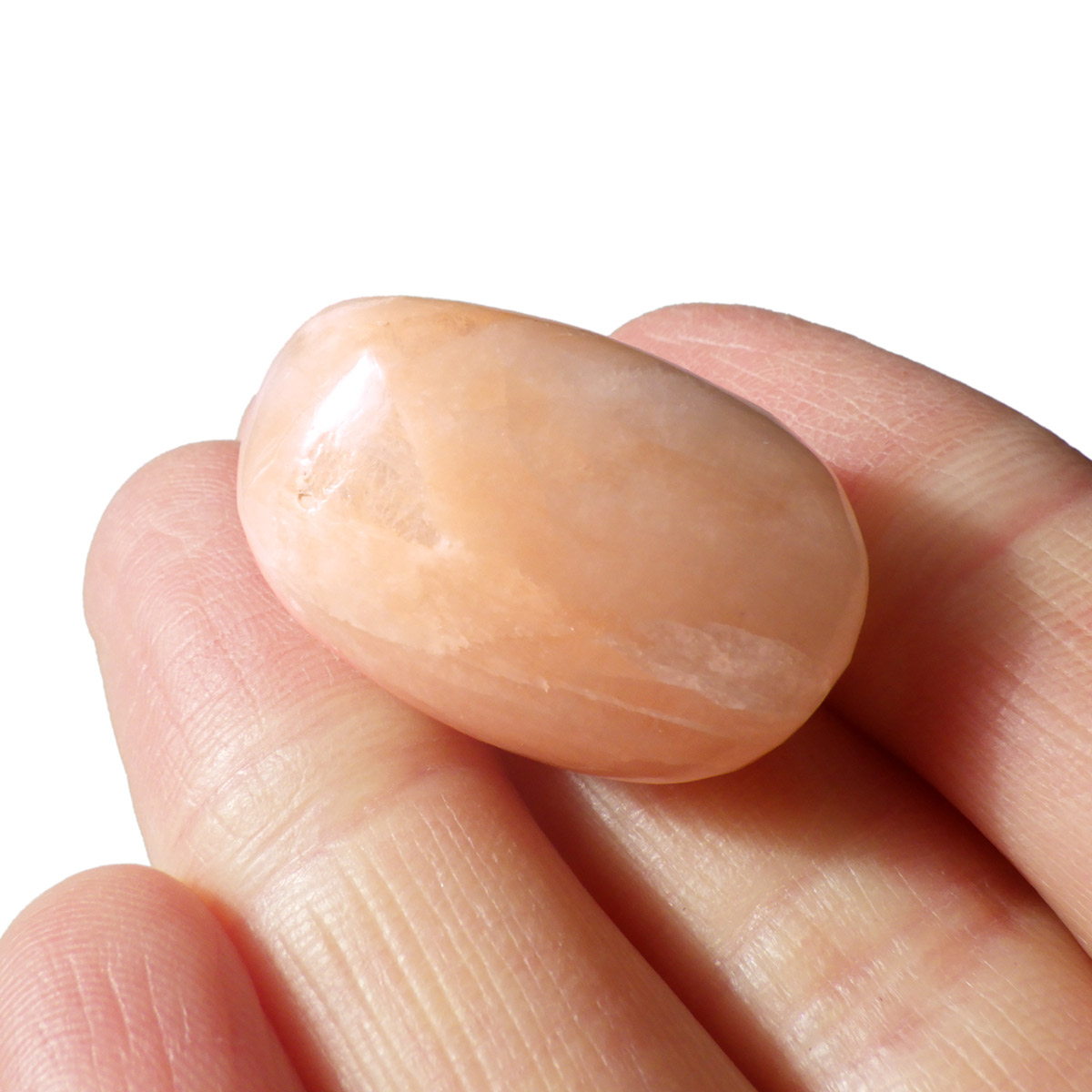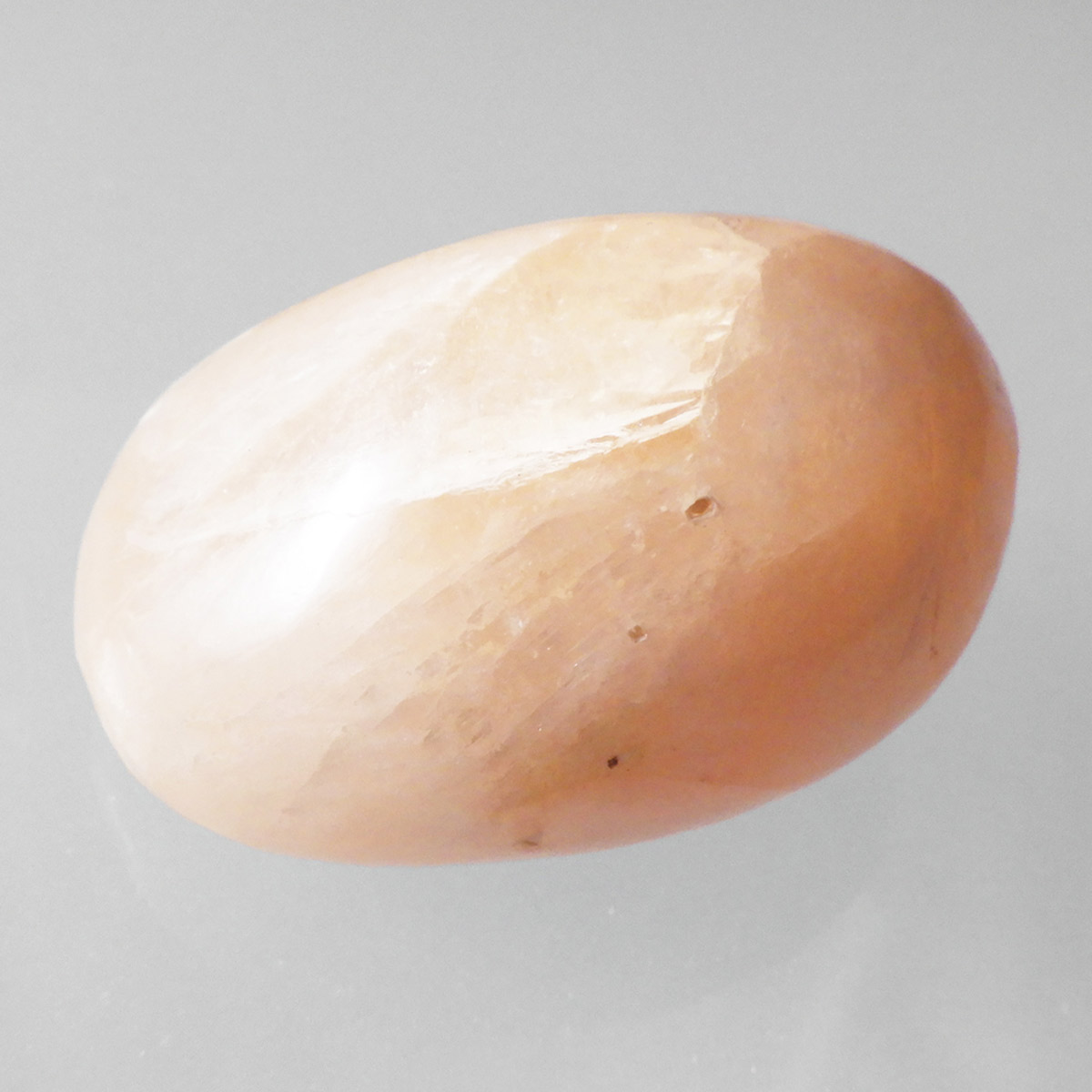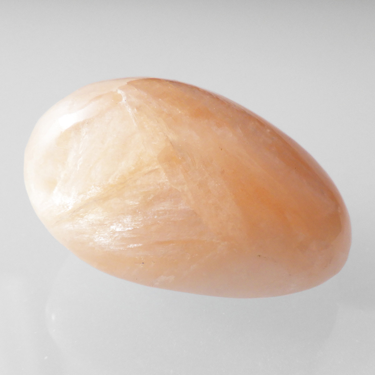 インド産のスティルバイト、タンブルです。 和名は束沸石。スティルバイトはナトリウムとカルシウムの含水アルミノケイ酸塩です。この鉱物が示すガラス光沢~真珠光沢にちなんで、ギリシャ語で「輝く」を意味する言葉をとって命名されました。「気高さ」の石言葉を持つスティルバイトは、なめらかなシルクのような美しい光沢が特徴です。天然石の中でもかなり貴重なレアストーンです。