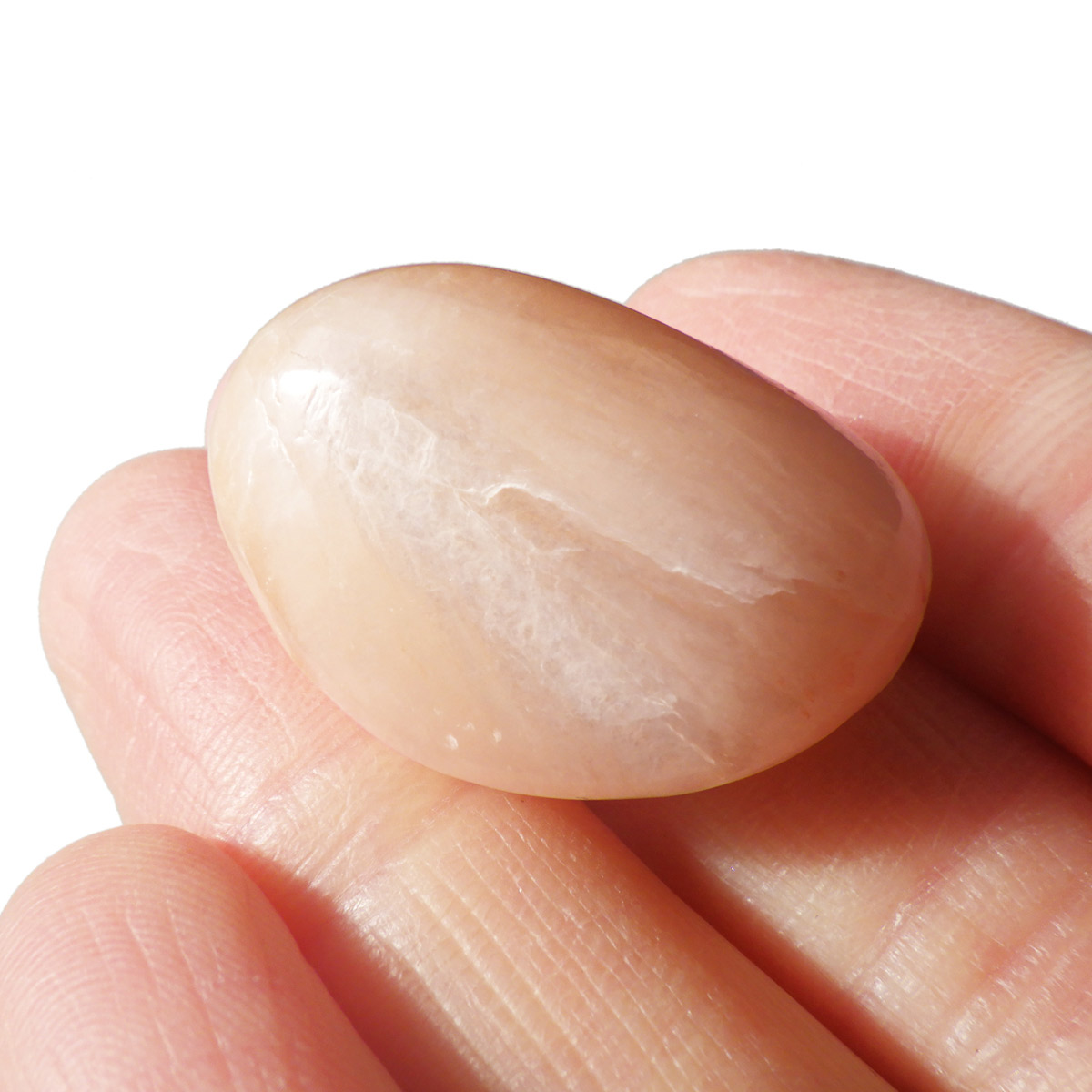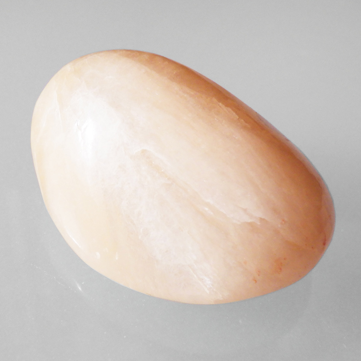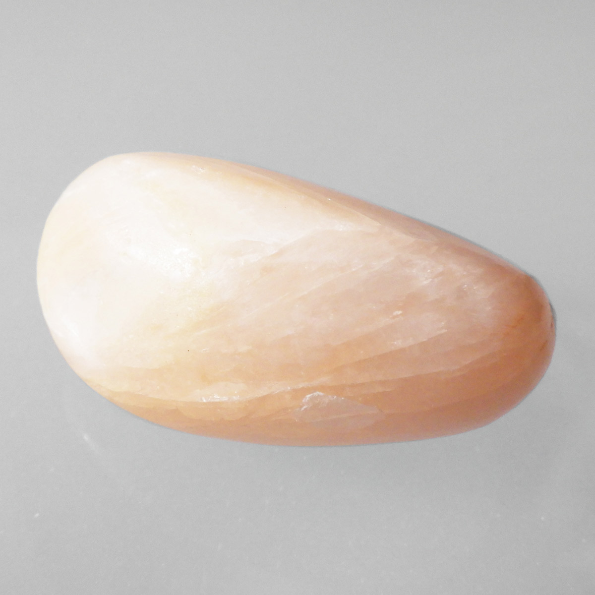 インド産のスティルバイト、タンブルです。 和名は束沸石。スティルバイトはナトリウムとカルシウムの含水アルミノケイ酸塩です。この鉱物が示すガラス光沢~真珠光沢にちなんで、ギリシャ語で「輝く」を意味する言葉をとって命名されました。「気高さ」の石言葉を持つスティルバイトは、なめらかなシルクのような美しい光沢が特徴です。天然石の中でもかなり貴重なレアストーンです。