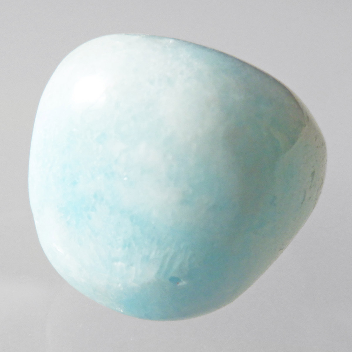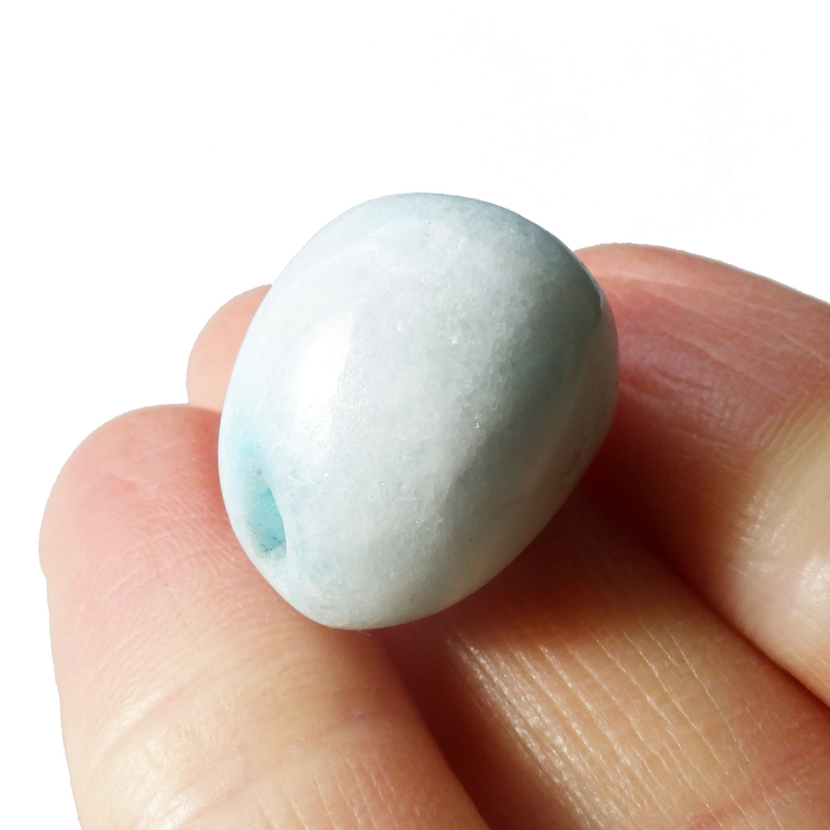 チャイナ産のブルーアラゴナイト、タンブルです。アラゴナイトといえば、黄色が主流ですが、青色のブルーアラゴナイトは流通量が少なくレアな石とされています。