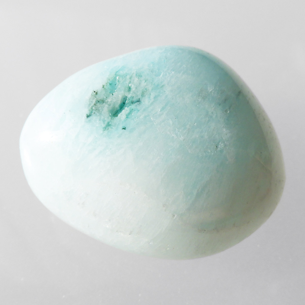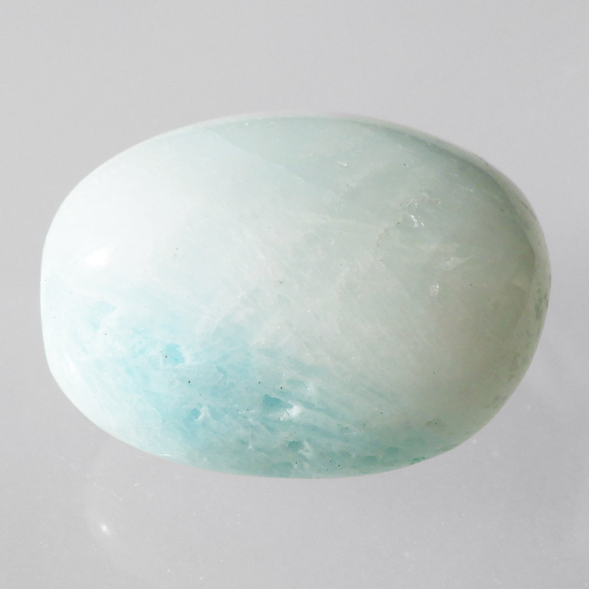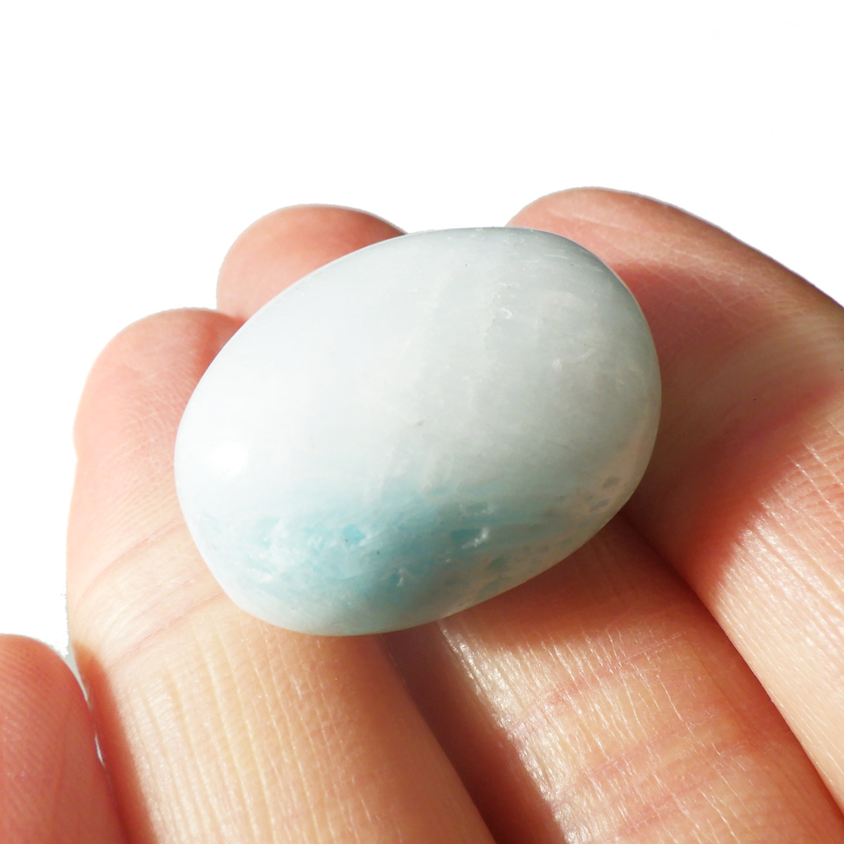 チャイナ産のブルーアラゴナイト、タンブルです。アラゴナイトといえば、黄色が主流ですが、青色のブルーアラゴナイトは流通量が少なくレアな石とされています。