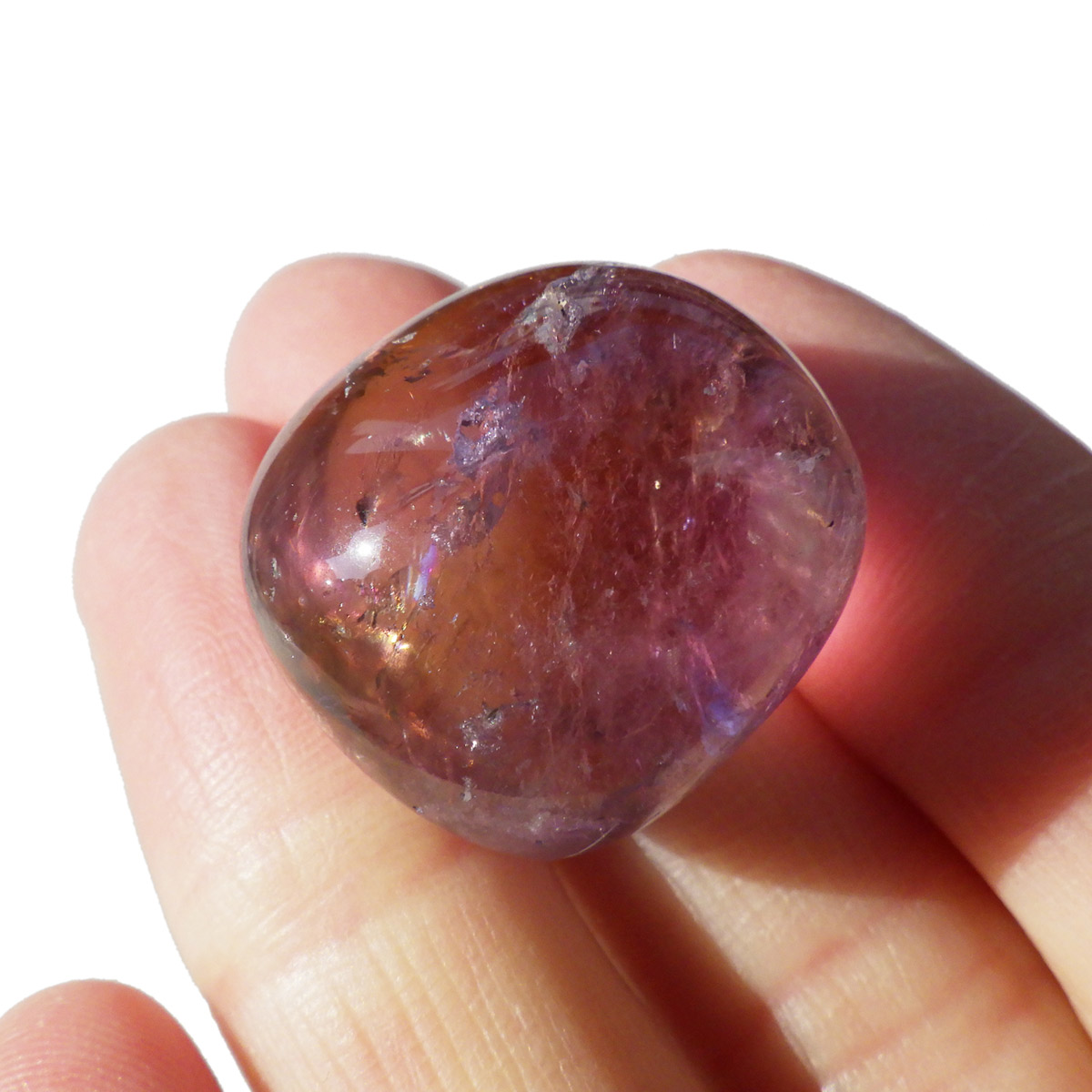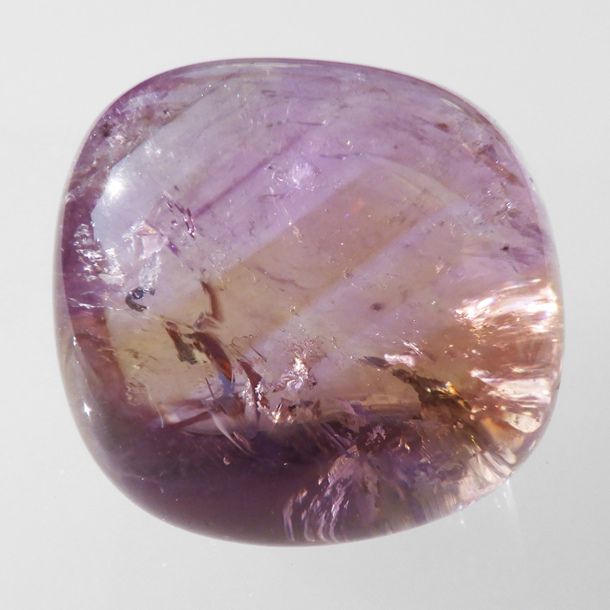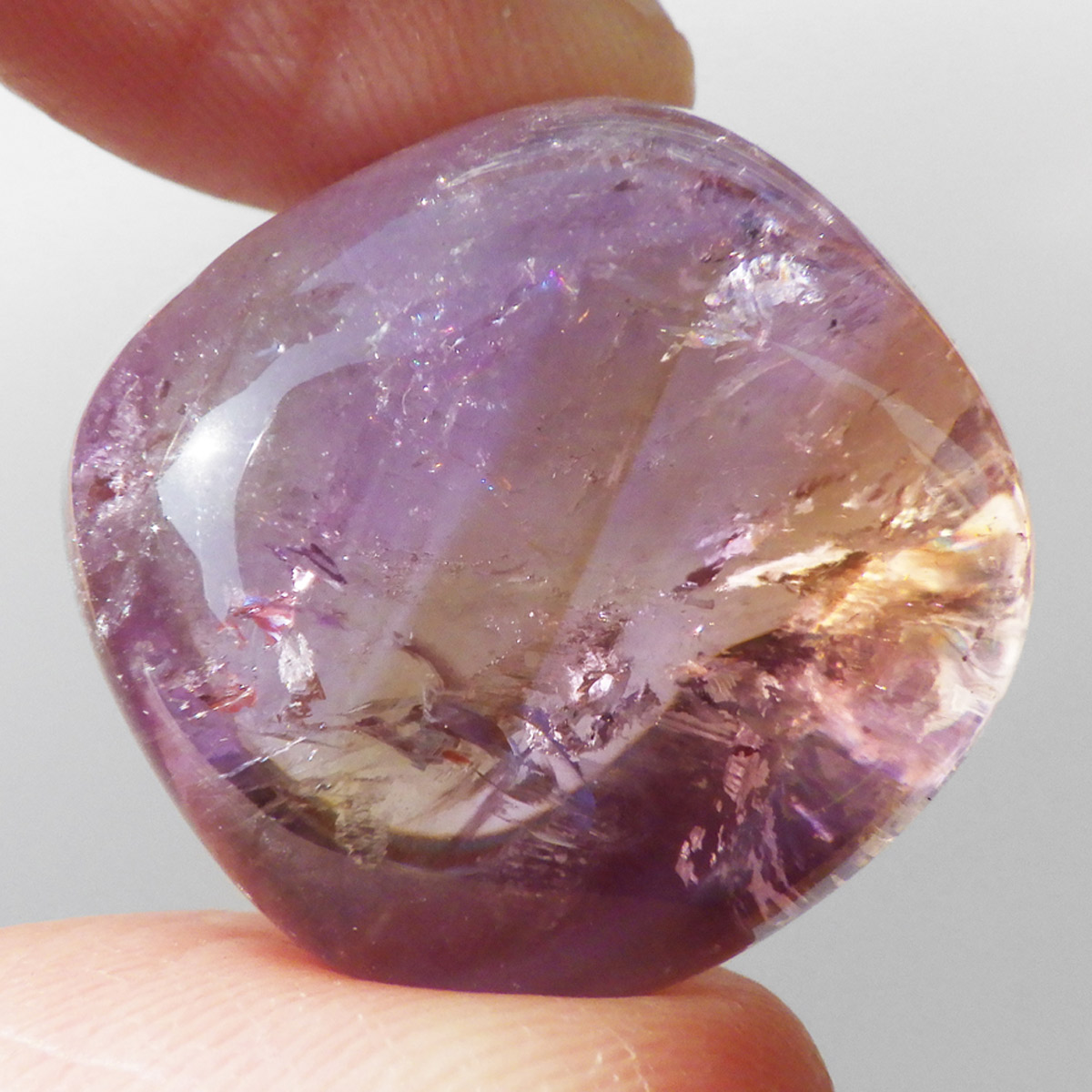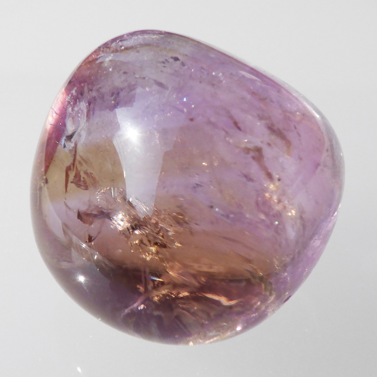 高品質ボリビア産アメトリンのタンブルです。アメトリンはアメジストとシトリンが混ざり合った石です。天然のアメトリンは極々限定された条件下でしか生成されません。透明度も抜群で、濃いアメジストとシトリンのカラーが大変美しいです。水晶の透明部分も見られ、透明〜パープル〜イエロー〜へのグラデーションは、まさに息を飲むほど美しいです。また、アメトリンを照らす光の種類や、タンブルの角度によって、濃く見えたり薄く見えたり、青っぽく見えたり赤っぽく見えたり、見ていて飽きることがありません。アメジストとシトリンの二つの顔を併せ持った魅力的な水晶です。
