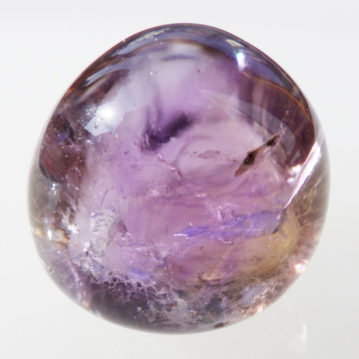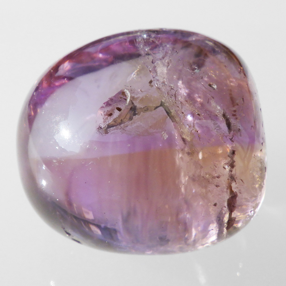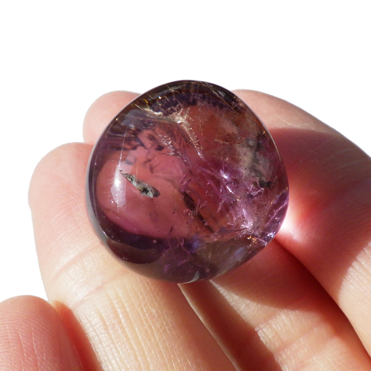 高品質ボリビア産アメトリンのタンブルです。アメトリンはアメジストとシトリンが混ざり合った石です。天然のアメトリンは極々限定された条件下でしか生成されません。透明度も抜群で、濃いアメジストとシトリンのカラーが大変美しいです。水晶の透明部分も見られ、透明〜パープル〜イエロー〜へのグラデーションは、まさに息を飲むほど美しいです。また、アメトリンを照らす光の種類や、タンブルの角度によって、濃く見えたり薄く見えたり、青っぽく見えたり赤っぽく見えたり、見ていて飽きることがありません。アメジストとシトリンの二つの顔を併せ持った魅力的な水晶です。