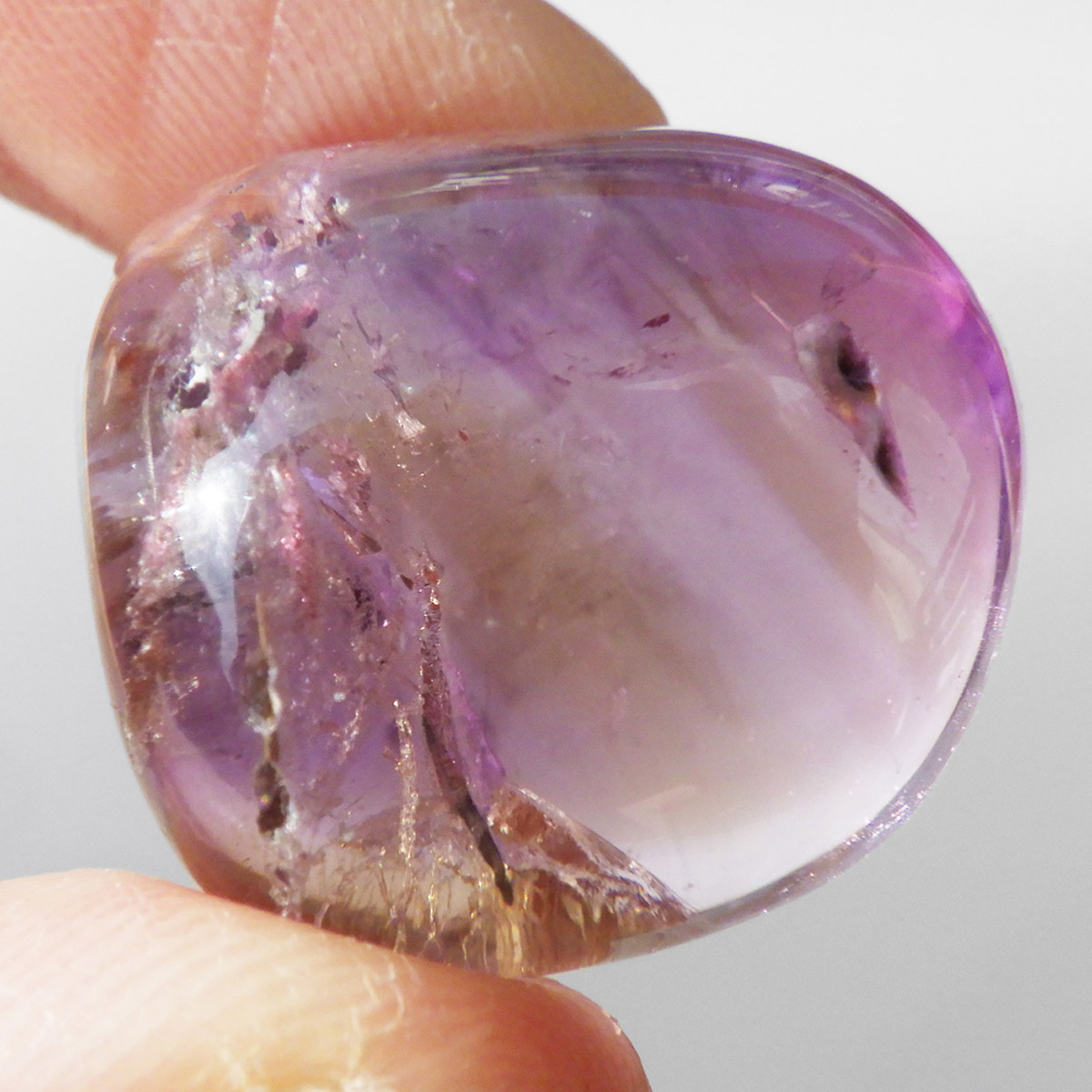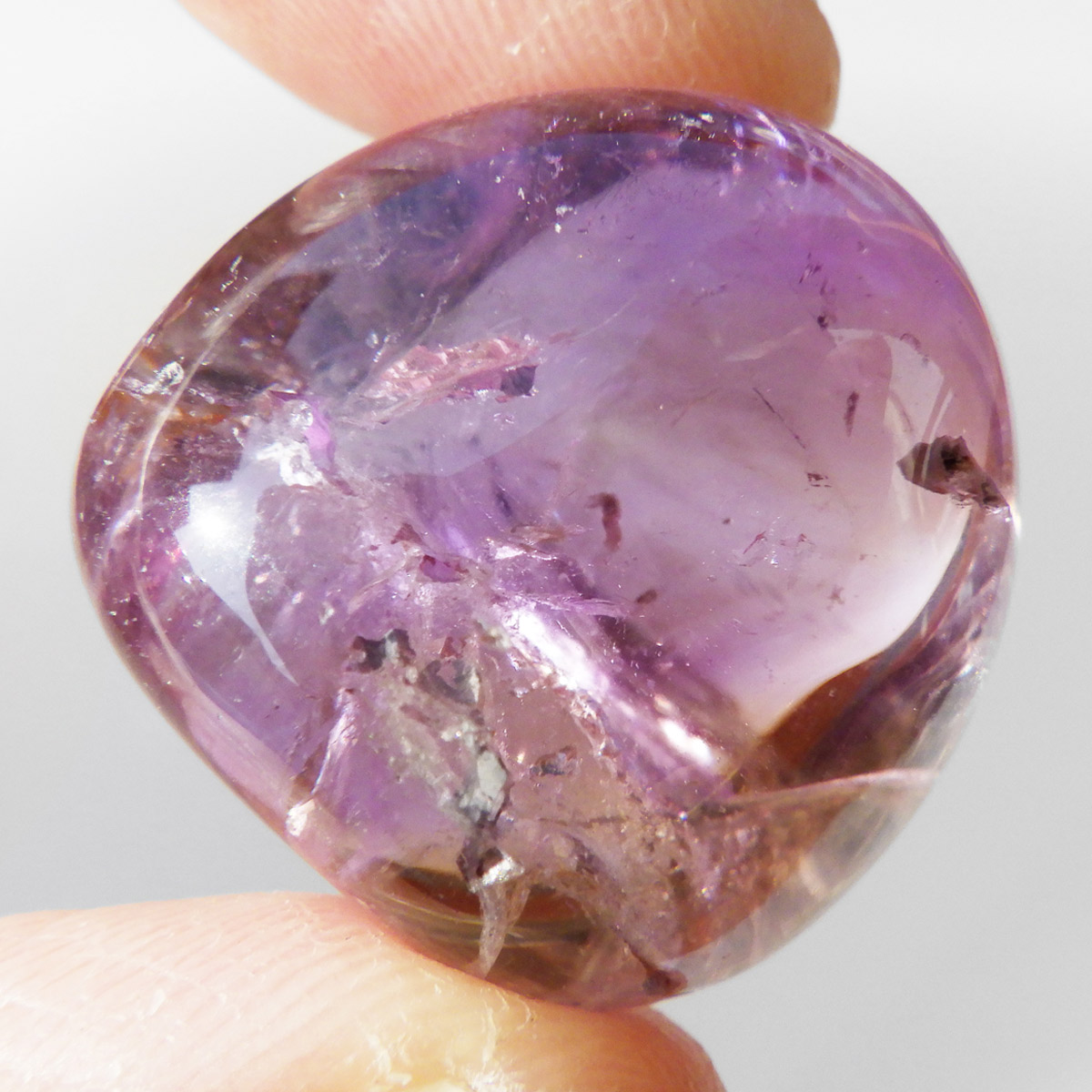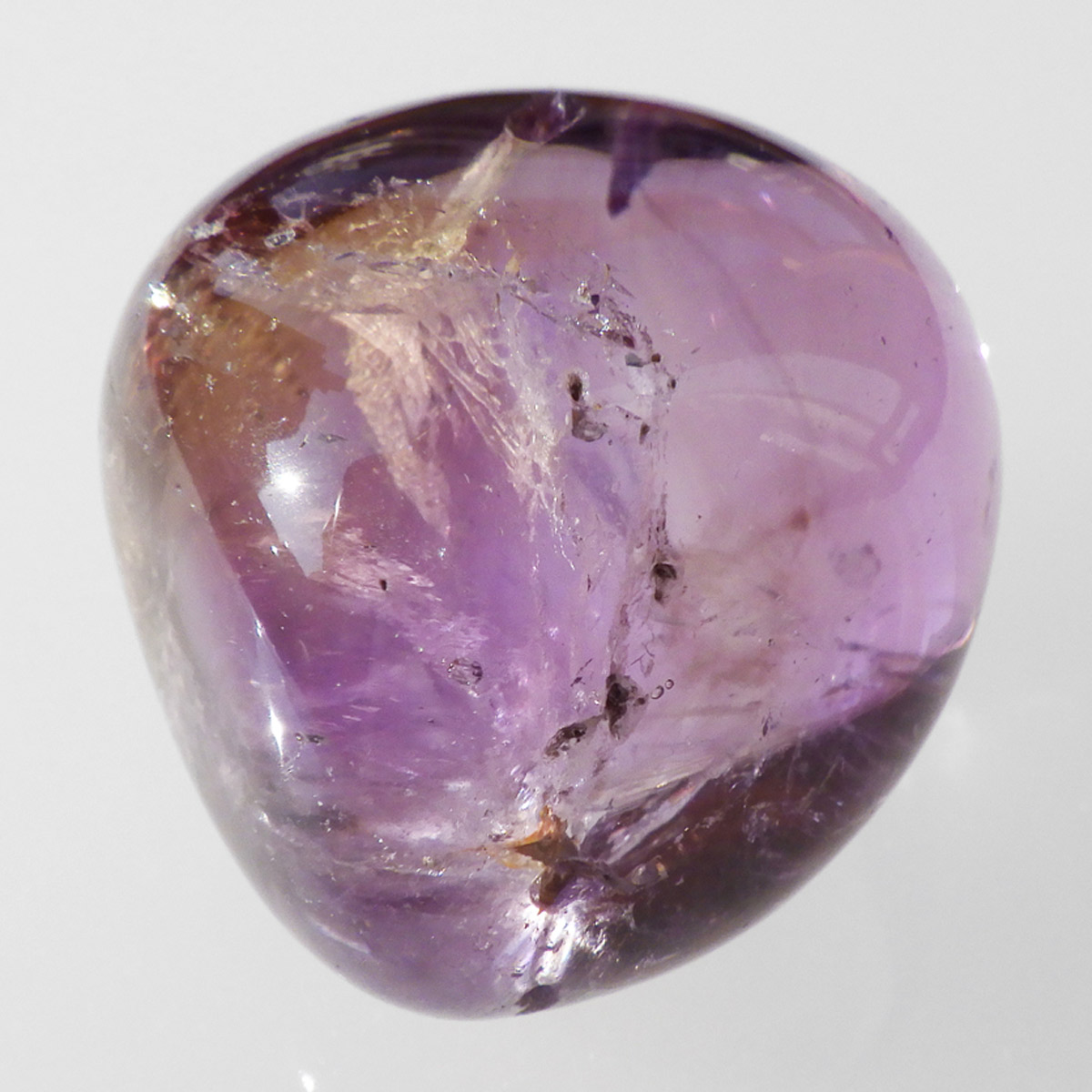 高品質ボリビア産アメトリンのタンブルです。アメトリンはアメジストとシトリンが混ざり合った石です。天然のアメトリンは極々限定された条件下でしか生成されません。透明度も抜群で、濃いアメジストとシトリンのカラーが大変美しいです。水晶の透明部分も見られ、透明〜パープル〜イエロー〜へのグラデーションは、まさに息を飲むほど美しいです。また、アメトリンを照らす光の種類や、タンブルの角度によって、濃く見えたり薄く見えたり、青っぽく見えたり赤っぽく見えたり、見ていて飽きることがありません。アメジストとシトリンの二つの顔を併せ持った魅力的な水晶です。