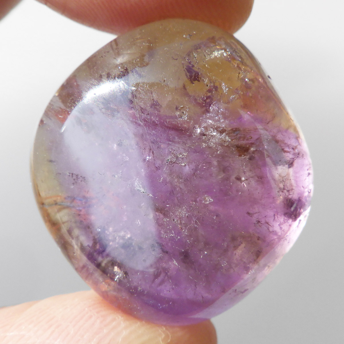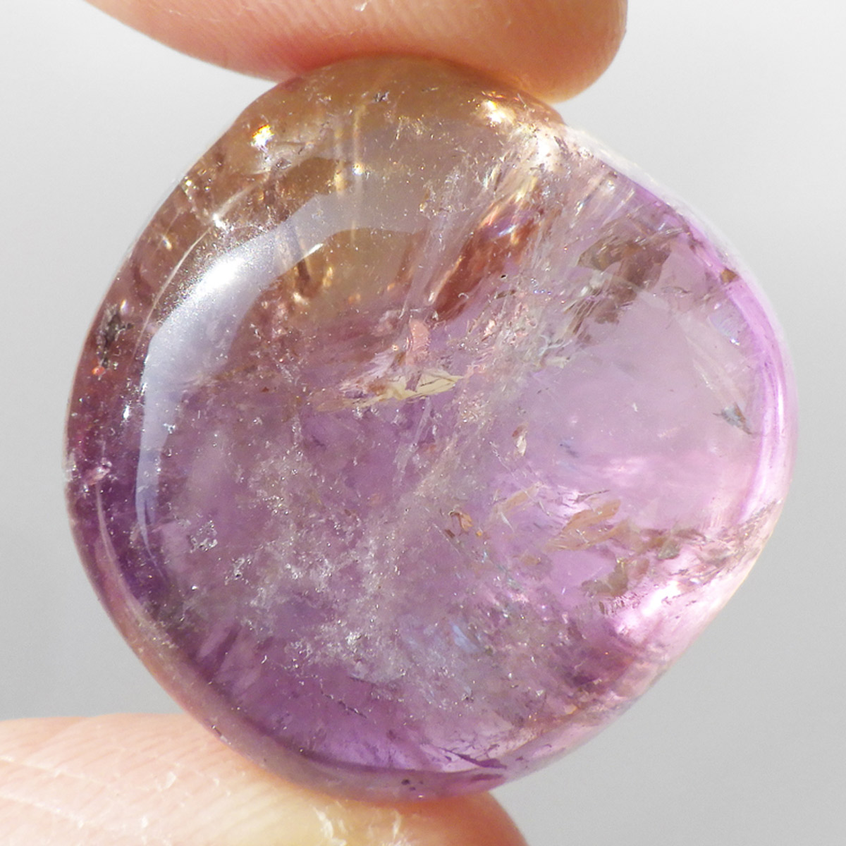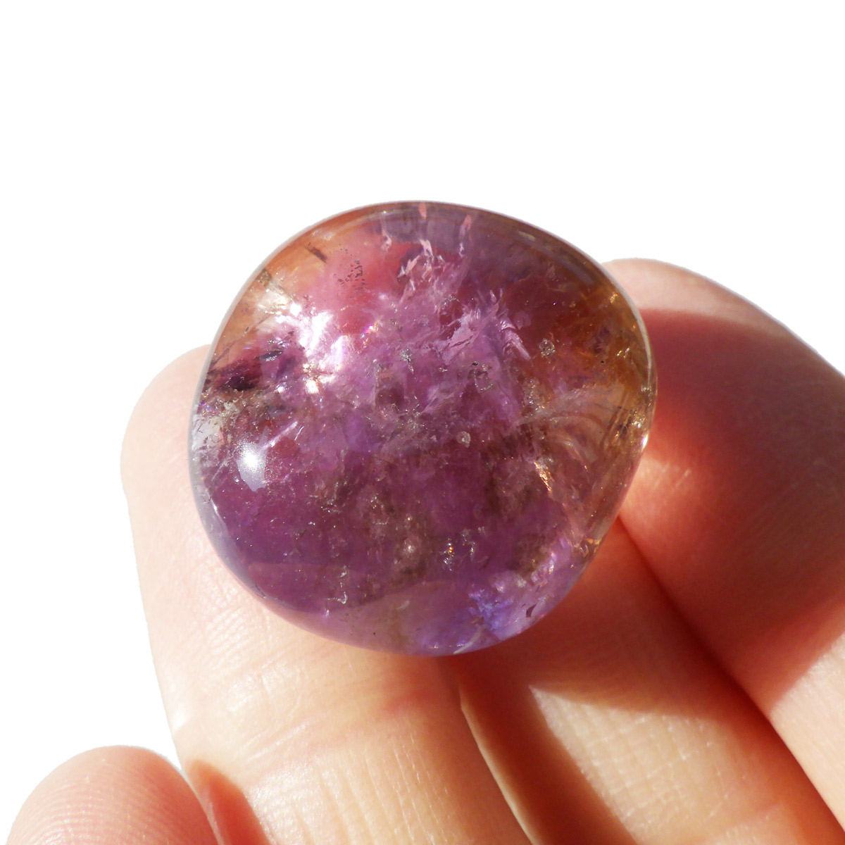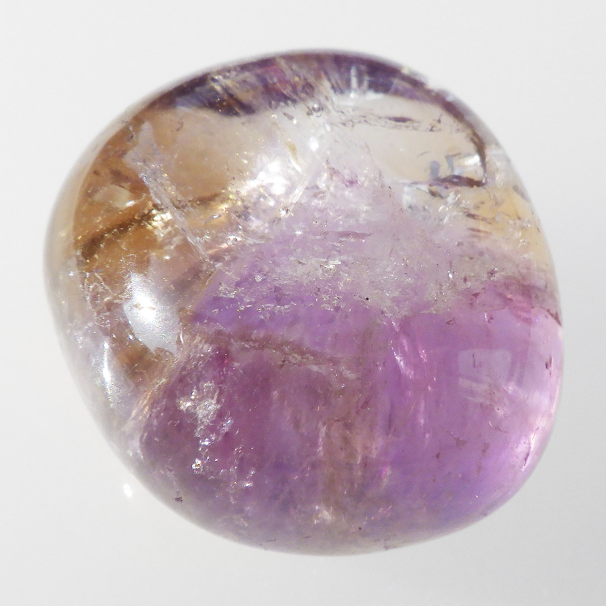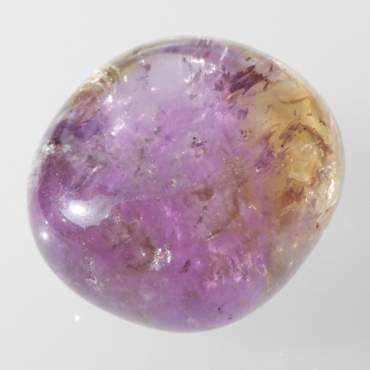 高品質ボリビア産アメトリンのタンブルです。アメトリンはアメジストとシトリンが混ざり合った石です。天然のアメトリンは極々限定された条件下でしか生成されません。透明度も抜群で、濃いアメジストとシトリンのカラーが大変美しいです。水晶の透明部分も見られ、透明〜パープル〜イエロー〜へのグラデーションは、まさに息を飲むほど美しいです。また、アメトリンを照らす光の種類や、タンブルの角度によって、濃く見えたり薄く見えたり、青っぽく見えたり赤っぽく見えたり、見ていて飽きることがありません。アメジストとシトリンの二つの顔を併せ持った魅力的な水晶です。