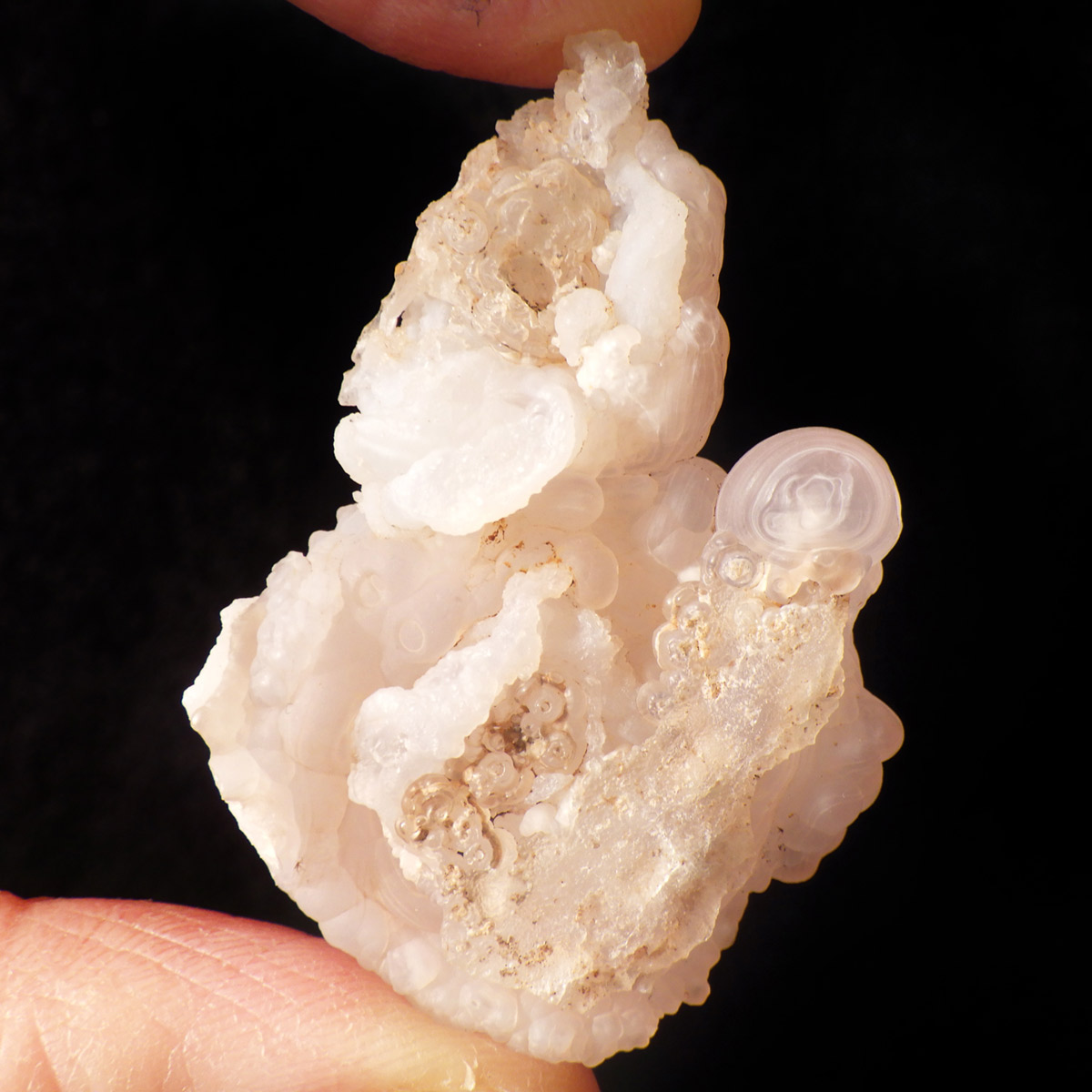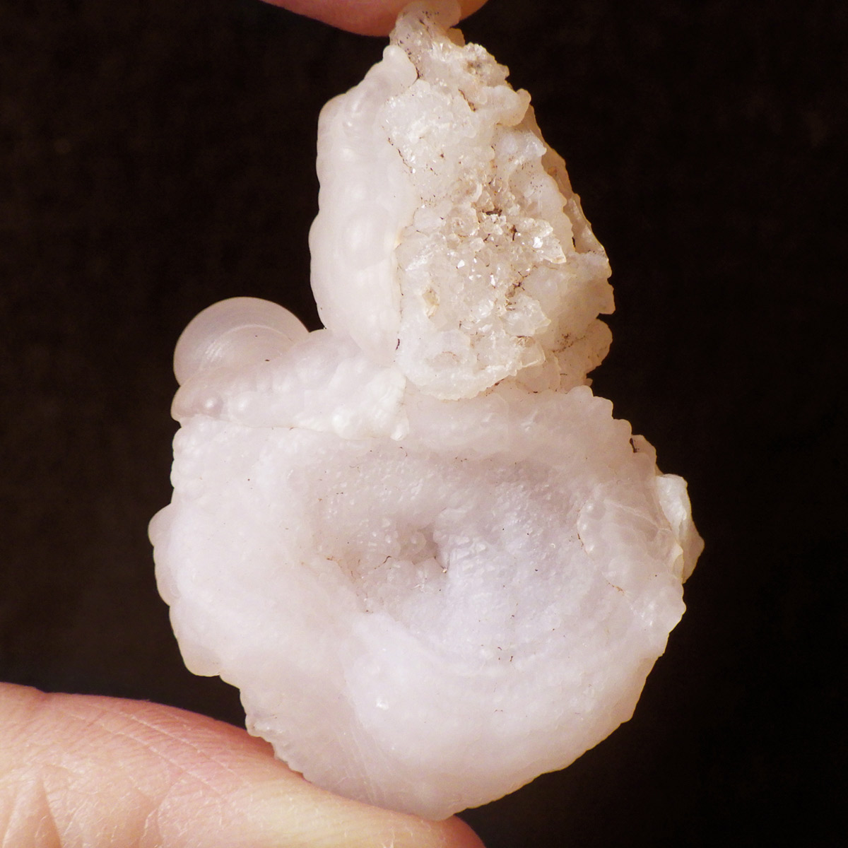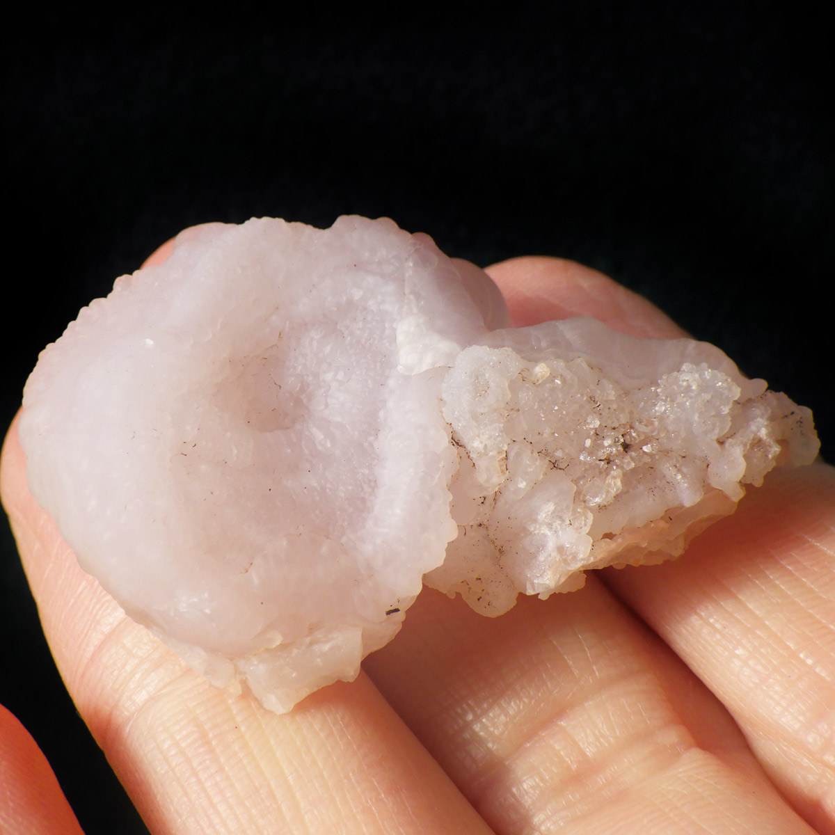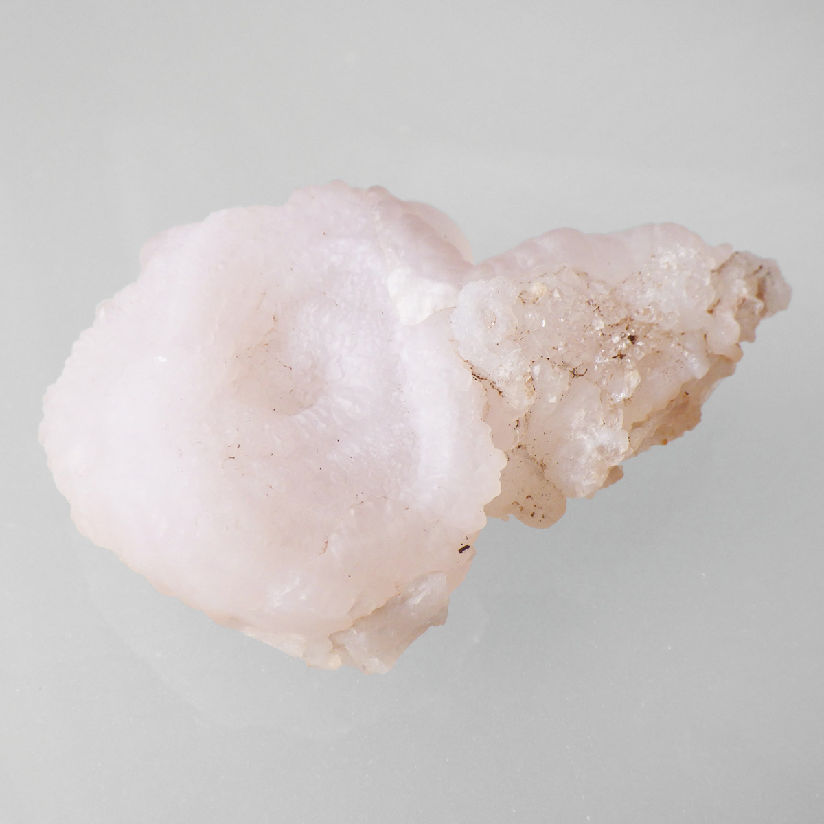 アメリカの南西部にあるニューメキシコ州産のピンクカルセドニー原石です。カルセドニーは色が多彩でカーネリアンやクリソプレーズ、アゲート、水晶などと同じ珪酸塩鉱物。カルセドニーは石英の微細結晶の集合体で透明に結晶化すると水晶になります。こちらはピンクカルセドニーですのでローズクォーツに近い鉱物になるかと思いますが、透明ではなく半透明でマットな見た目をしています。モコっとした姿がかわいらしく、優しいピンクに色付いたカルセドニーです。