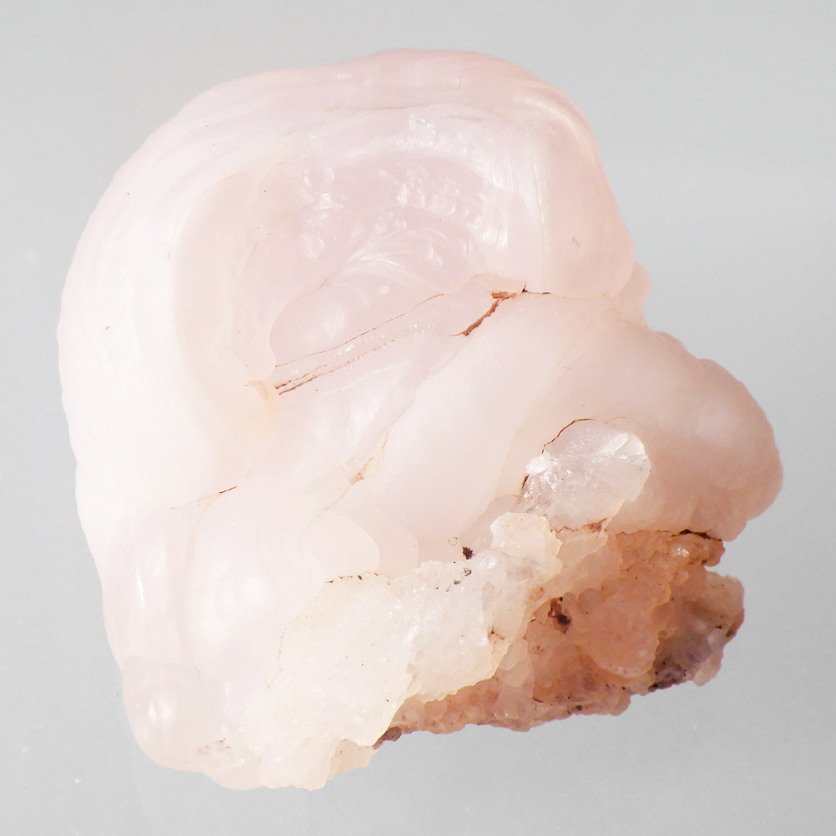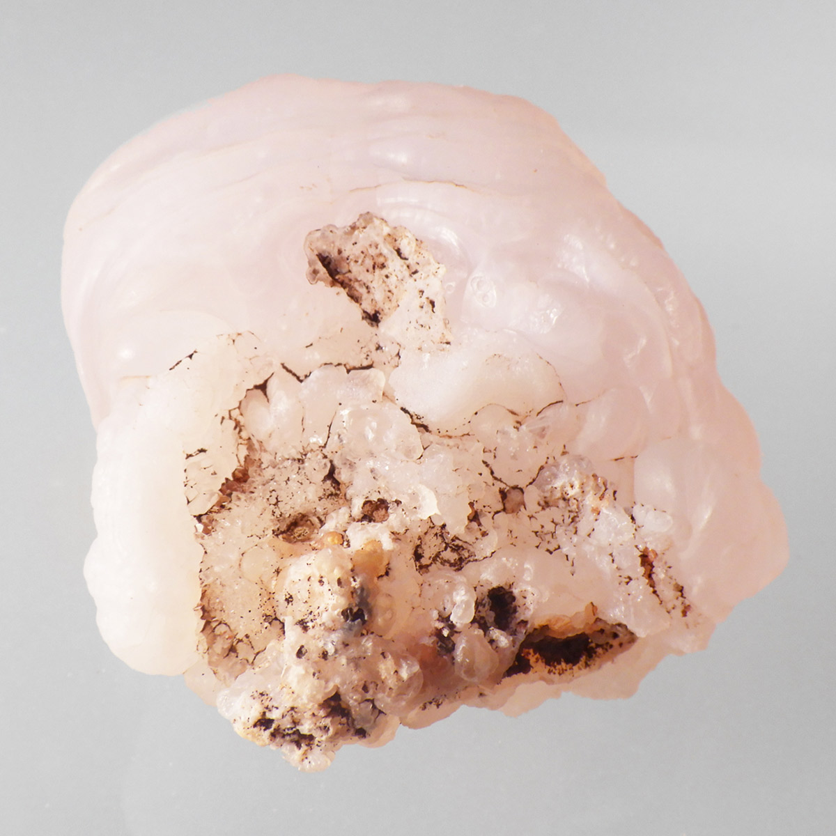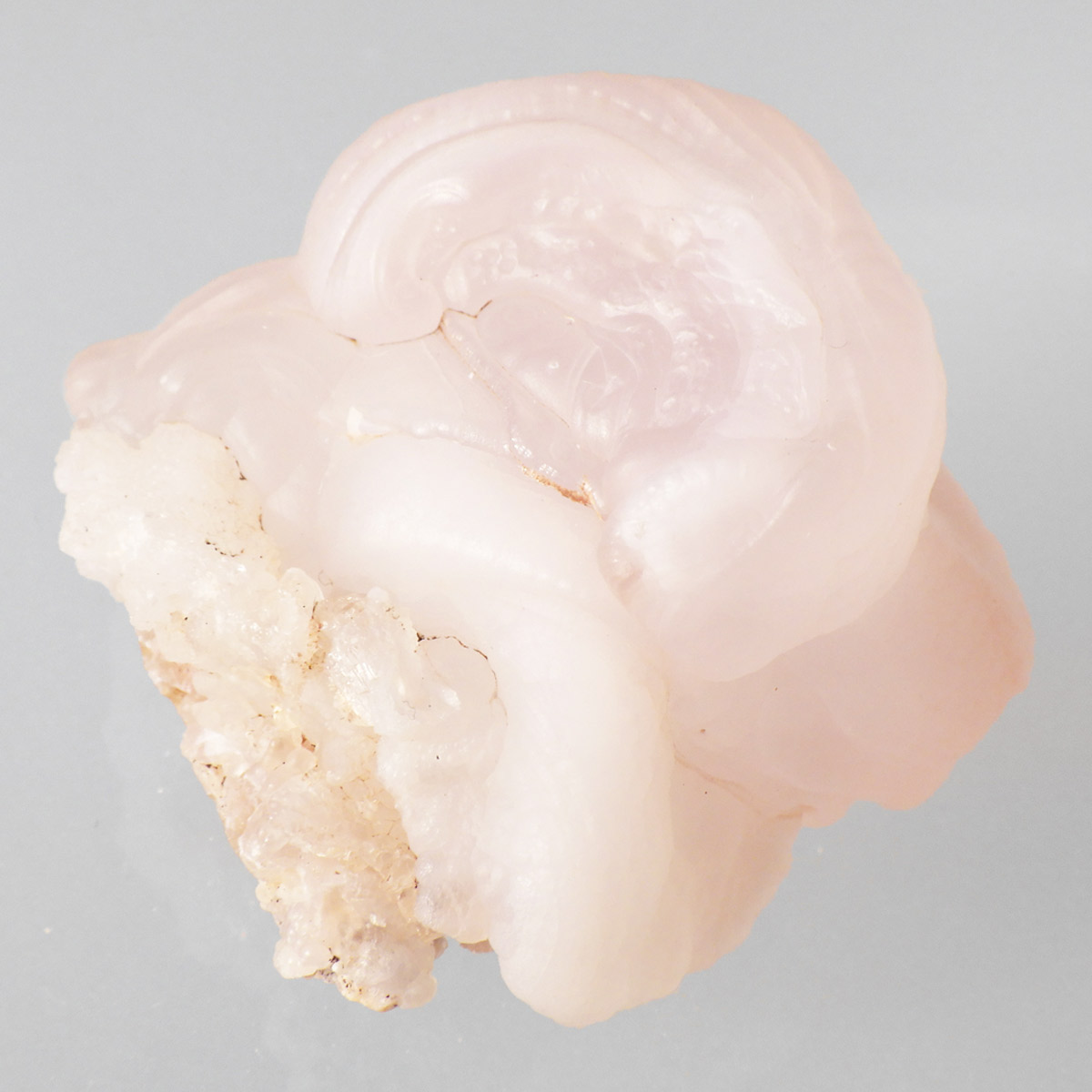 アメリカの南西部にあるニューメキシコ州産のピンクカルセドニー原石です。カルセドニーは色が多彩でカーネリアンやクリソプレーズ、アゲート、水晶などと同じ珪酸塩鉱物。カルセドニーは石英の微細結晶の集合体で透明に結晶化すると水晶になります。こちらはピンクカルセドニーですのでローズクォーツに近い鉱物になるかと思いますが、透明ではなく半透明でマットな見た目をしています。モコっとした姿がかわいらしく、優しいピンクに色付いたカルセドニーです。