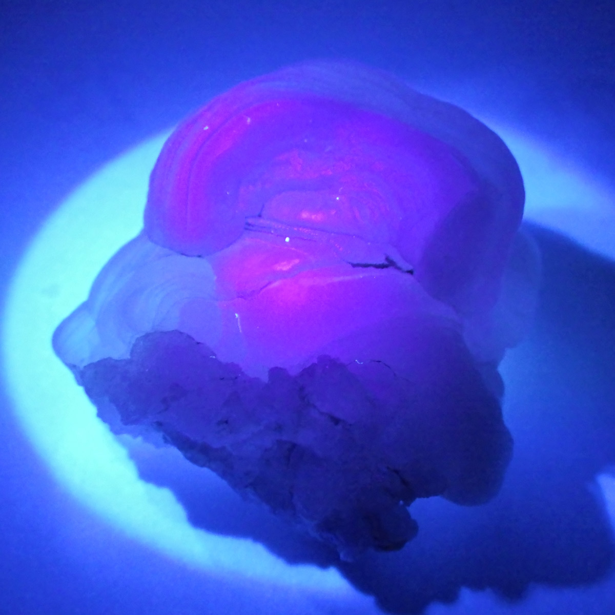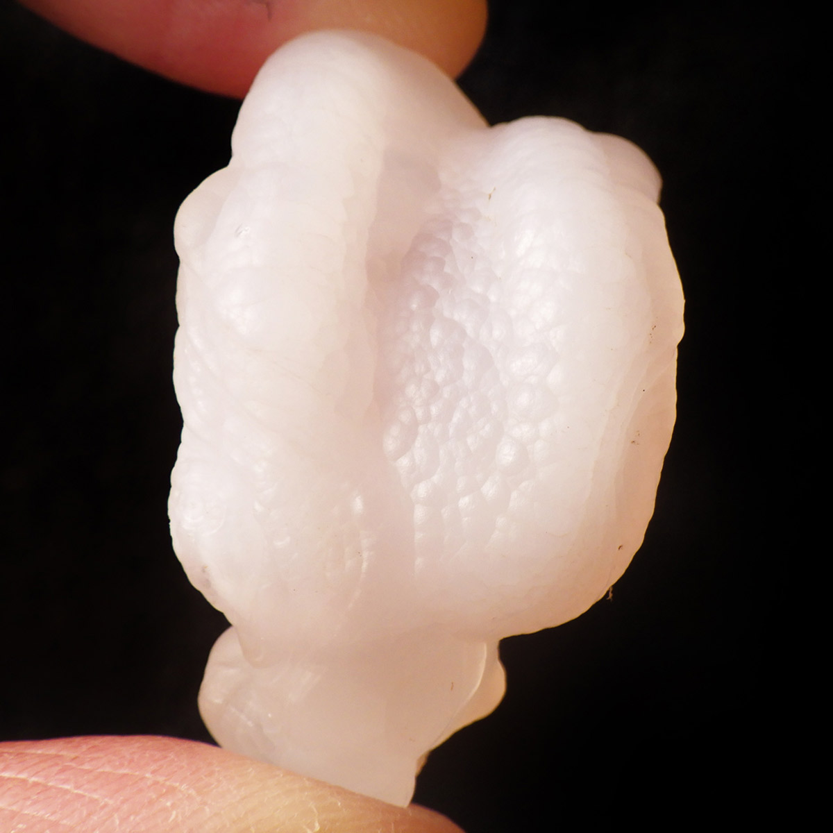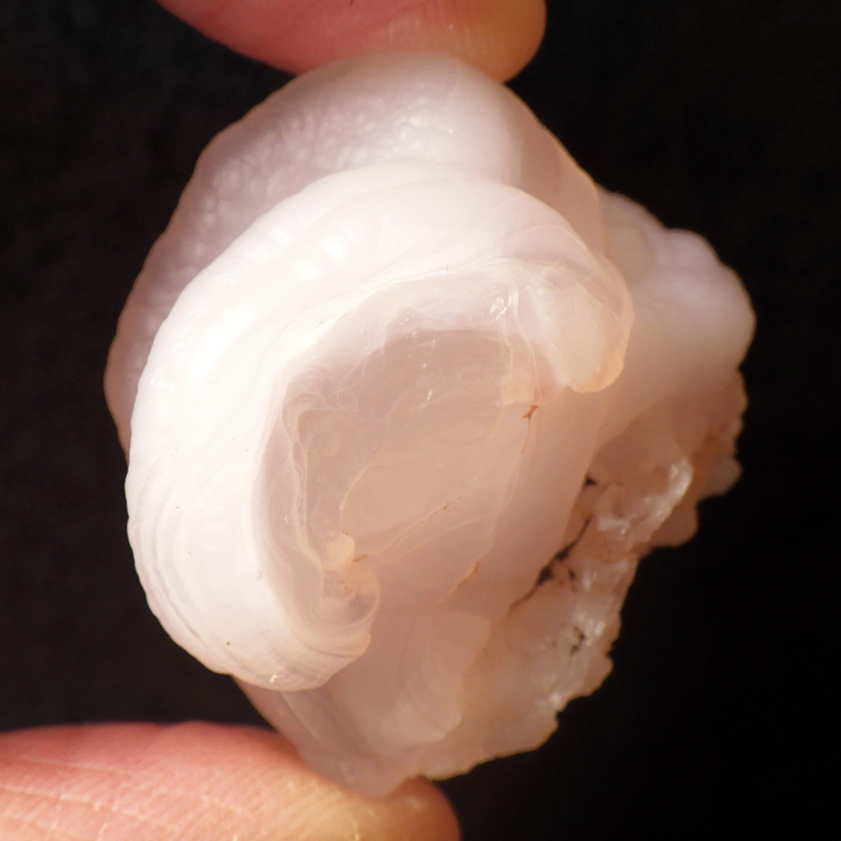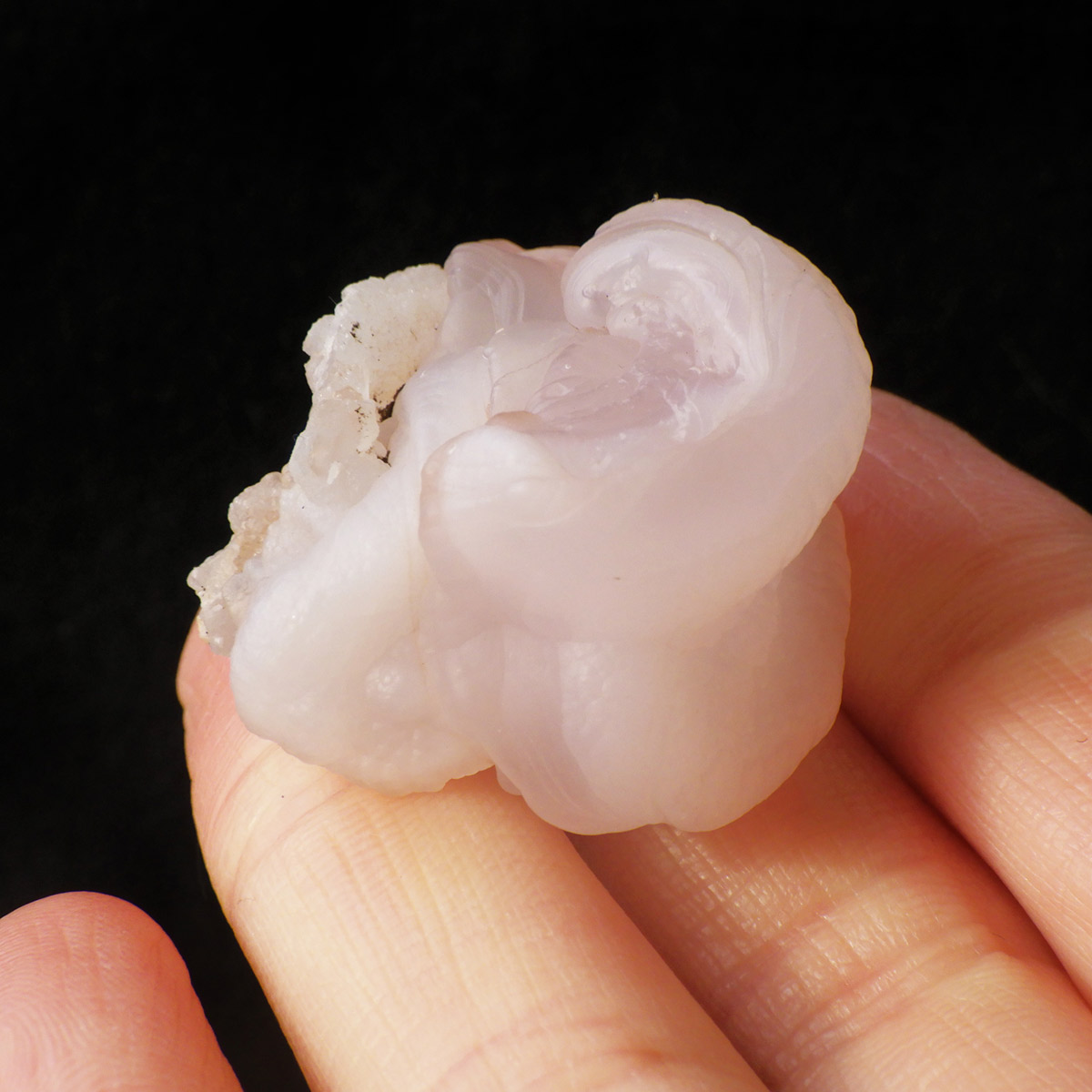 アメリカの南西部にあるニューメキシコ州産のピンクカルセドニー原石です。カルセドニーは色が多彩でカーネリアンやクリソプレーズ、アゲート、水晶などと同じ珪酸塩鉱物。カルセドニーは石英の微細結晶の集合体で透明に結晶化すると水晶になります。こちらはピンクカルセドニーですのでローズクォーツに近い鉱物になるかと思いますが、透明ではなく半透明でマットな見た目をしています。モコっとした姿がかわいらしく、優しいピンクに色付いたカルセドニーです。