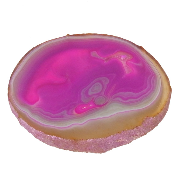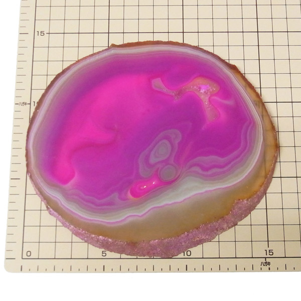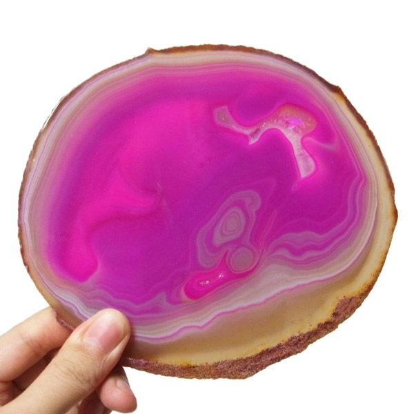 ブラジル産メノウを染色し、薄くスライスした色鮮やかなメノウスライスです。カラーはピンク、大きさは特大サイズです。
