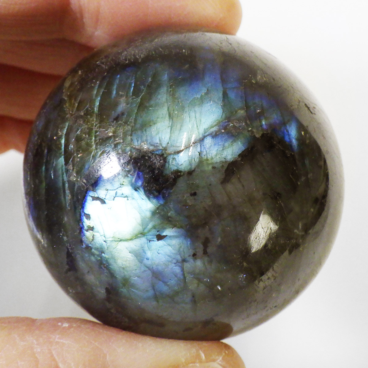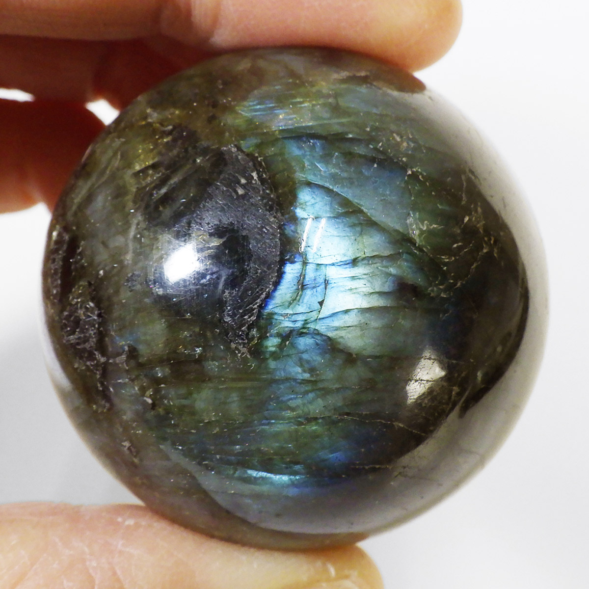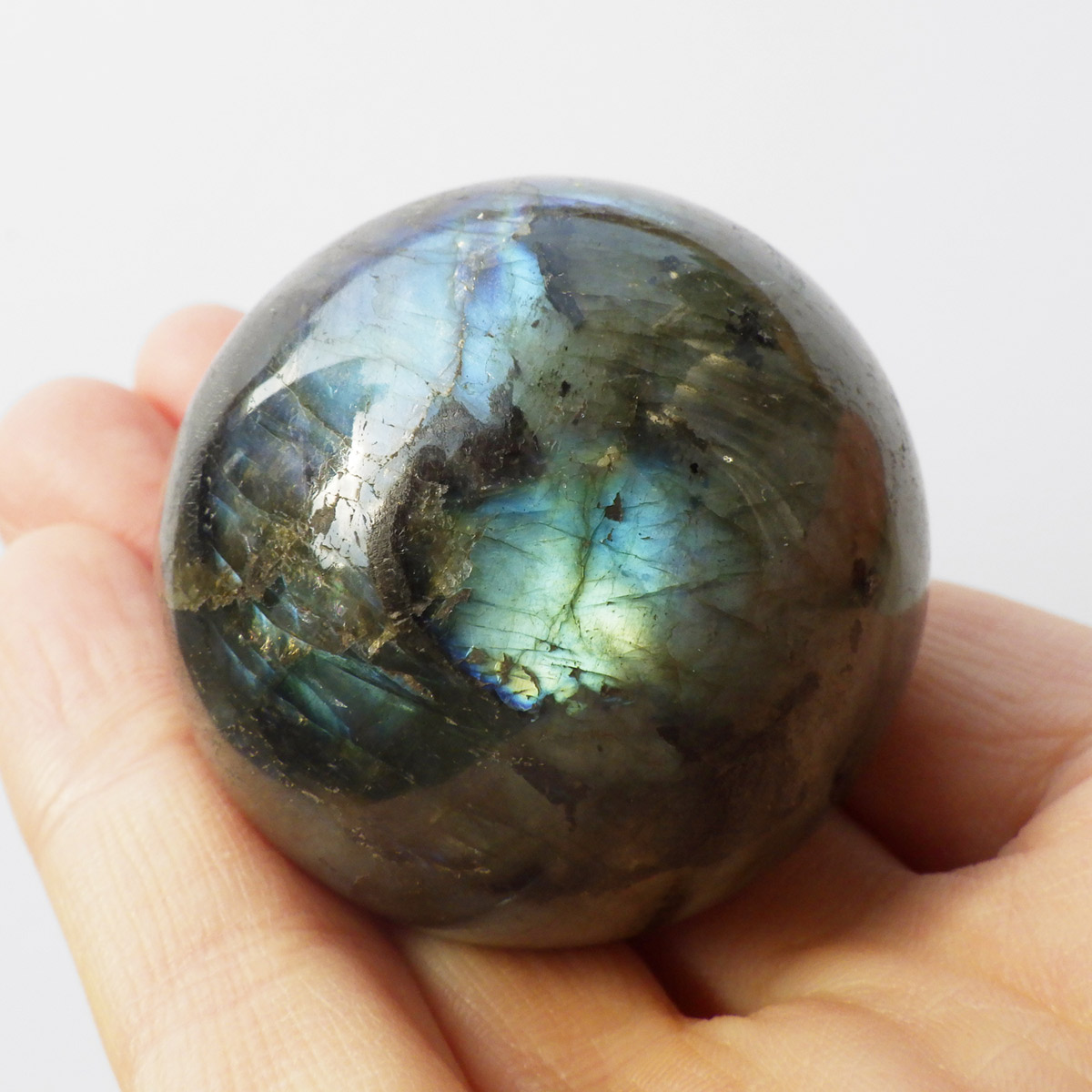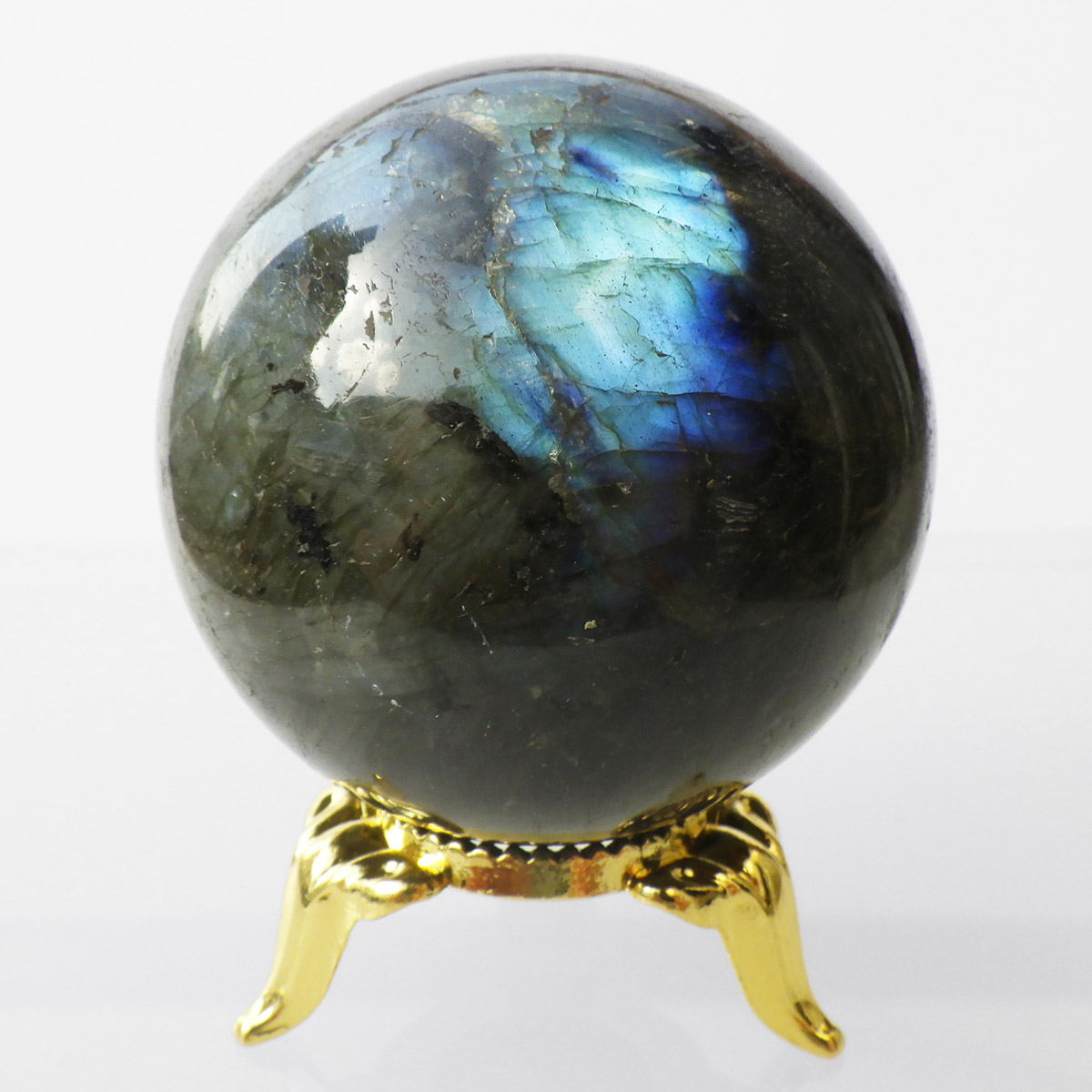 マダガスカル産のラブラドライト スフィアです。 見る角度によってオーロラのような色彩を変える美しい光を持つのが特徴です。 このラブラドライトは、石自体が濃いグレーからグリーンのような美しい色合いで、そこに鮮やかな輝きが浮かび上がります。「アゲハ蝶の羽」に例えられる事もある美しいブルーです。