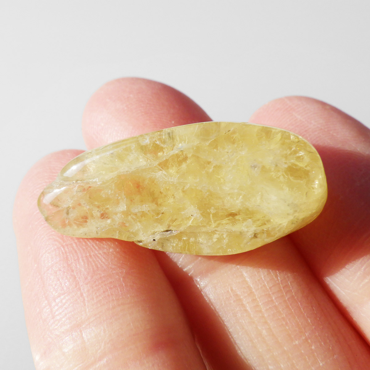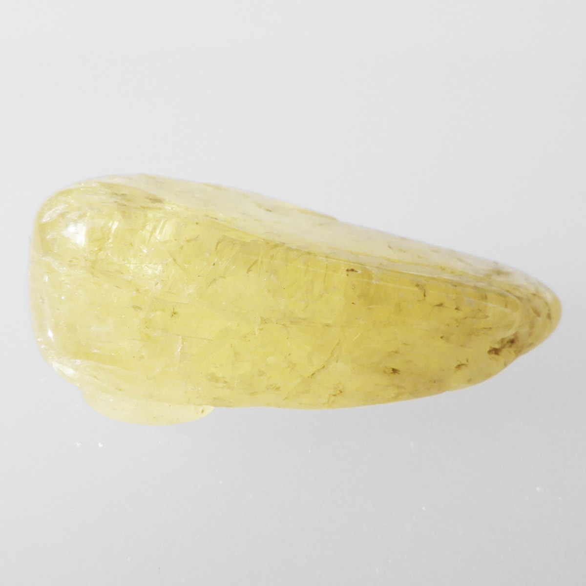 タンザニア産のゴールデンダンビュライト、タンブルです。ダンビュライトと言えば、透明度の高い結晶や、薄いピンク色の結晶がよく知られています。 光の反射が強く、屈折率が高いことから、良質な原石をカットすると水晶やトパーズよりも透明で澄んでいて、かつてダイアモンドの代用品として利用されていたこともあります。ところが、タンザニア産のダンビュライトは 明るいイエローの発色で、塊状で産するのが特徴です。