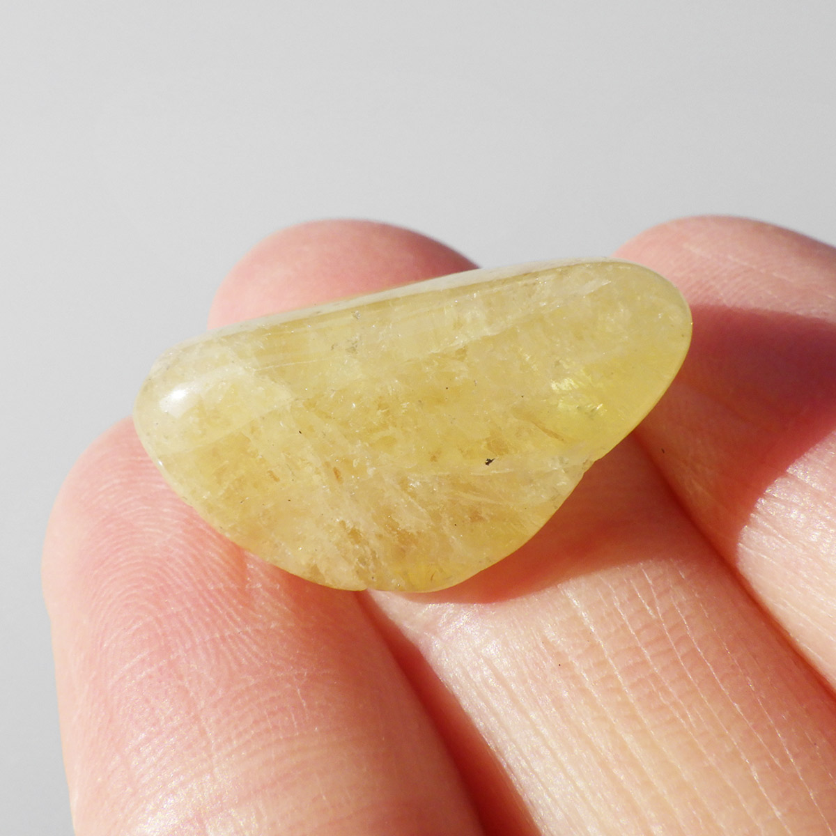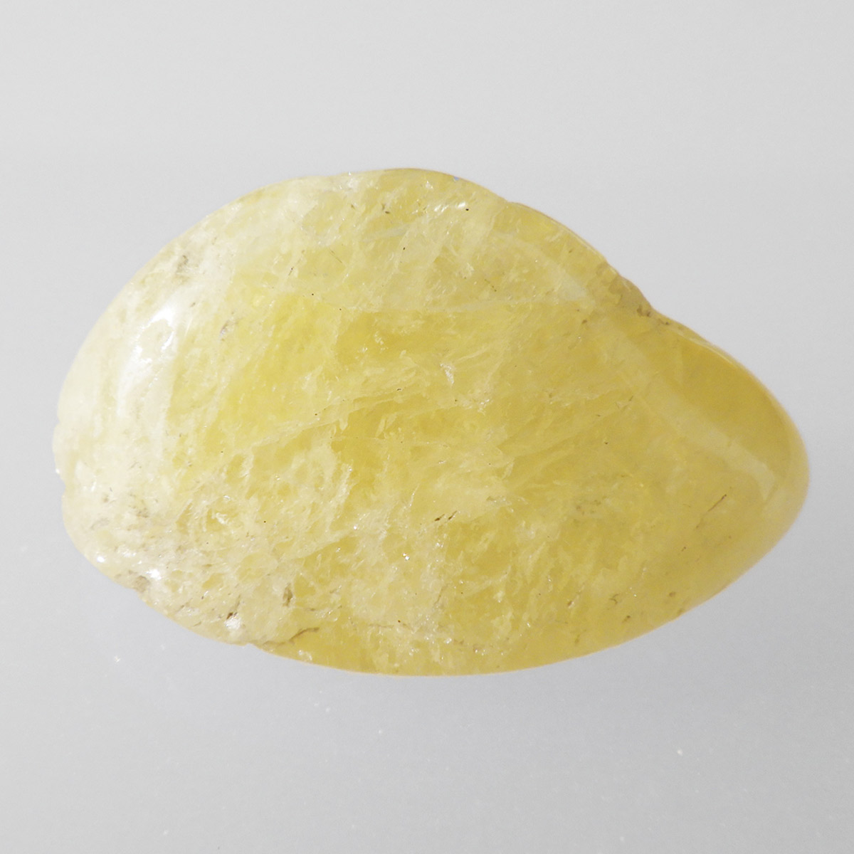 タンザニア産のゴールデンダンビュライト、タンブルです。ダンビュライトと言えば、透明度の高い結晶や、薄いピンク色の結晶がよく知られています。 光の反射が強く、屈折率が高いことから、良質な原石をカットすると水晶やトパーズよりも透明で澄んでいて、かつてダイアモンドの代用品として利用されていたこともあります。ところが、タンザニア産のダンビュライトは 明るいイエローの発色で、塊状で産するのが特徴です。