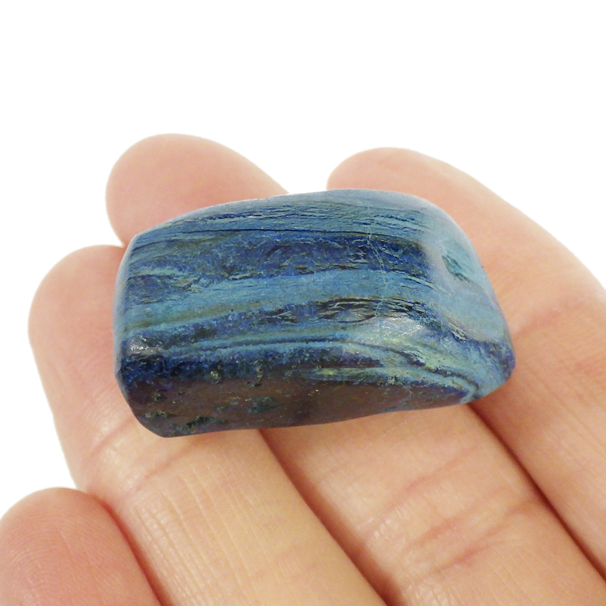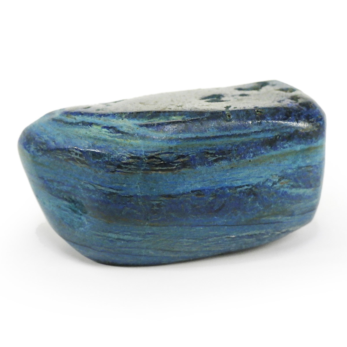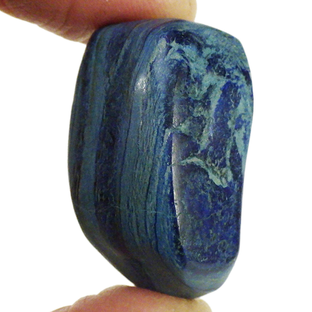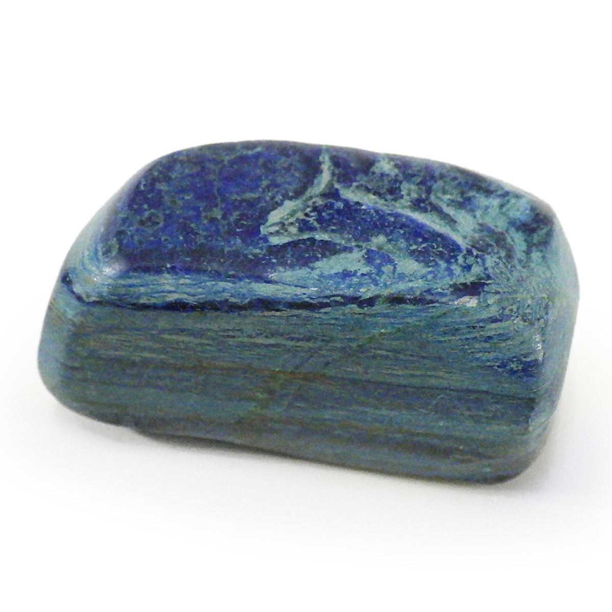モロッコ産のアズライト、タンブルです。モロッコ産のアズライトは高品質なものが多く、混じりっ気のない綺麗なアズライトが産出されます。アズライト自体は産出量が少ない為、希少価値が高い石です。濃いアズライトブルーにマラカイトグリーンがアクセントで美しさはトップクラスです。