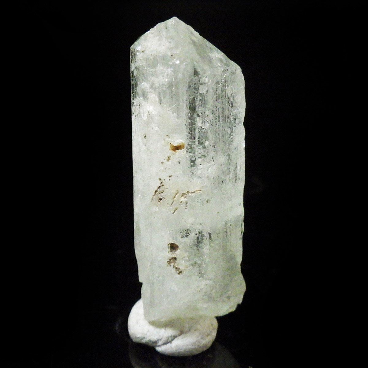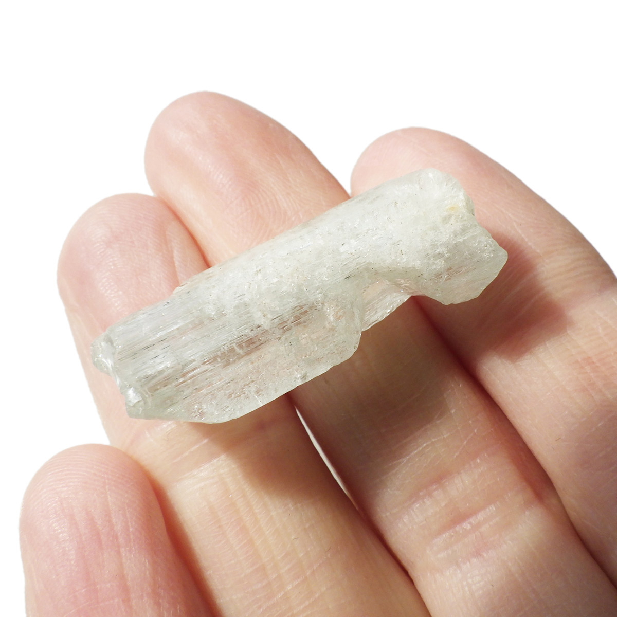 ブラジル産のアクアマリン原石です。 鉱物学上ではベリル、和名では緑柱石に分類され、混入元素によって多彩に変化します。エメラルドやヘリオドール、モルガナイトと同じ種類で、黄褐色~緑色、淡青色、帯黄色などがあります。花崗岩質岩やそのペグマタイト脈、雲母片岩、片麻岩の副成分鉱物として産出します。欧米ではアクアマリンを「天使の石」と呼ぶそうです。
