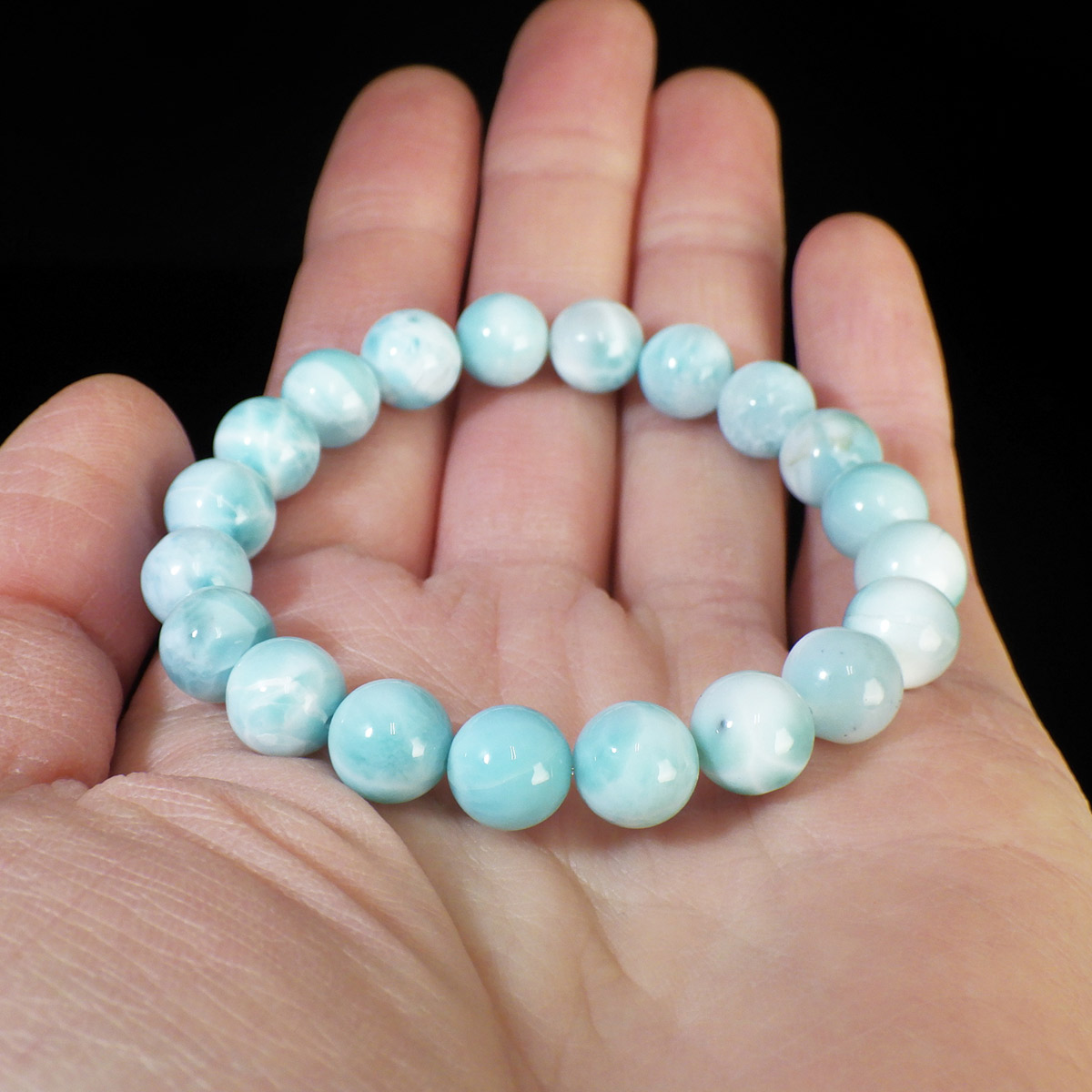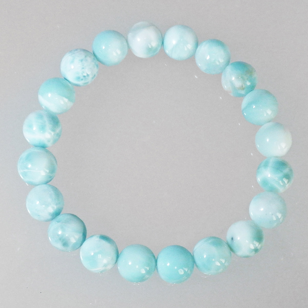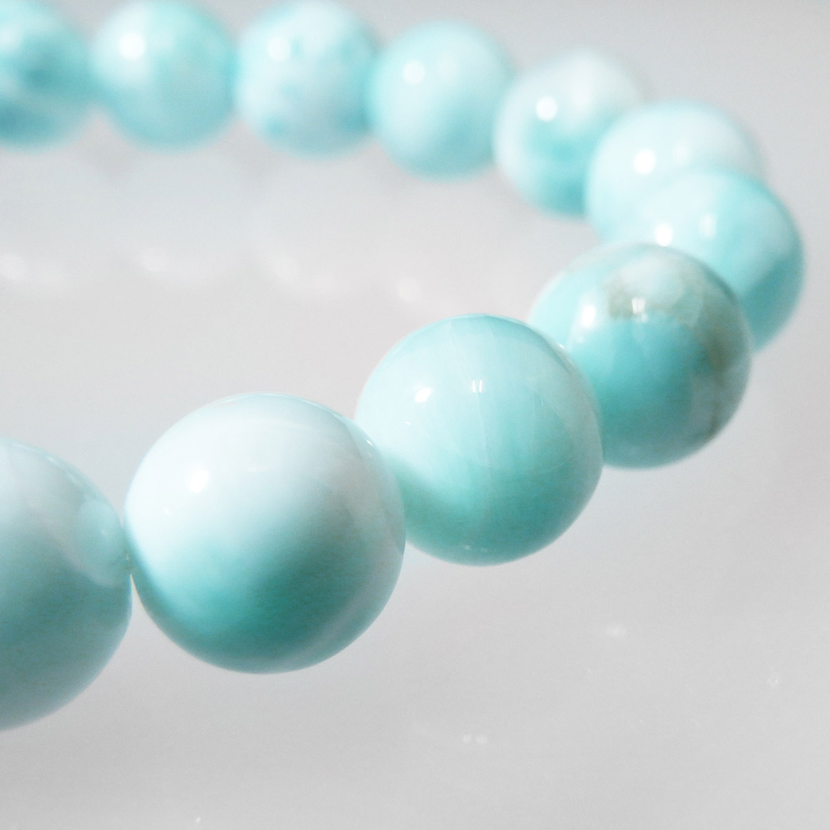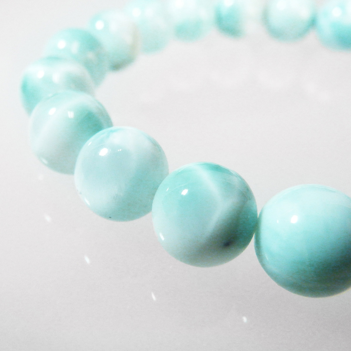 茶・黒い模様などほとんど見られない最高級クラスのラリマーブレスレットです。均一で発色の良い整った色合いのみのラリマーで揃えており、澄み渡るカリビアンブルーとホワイトの模様がきれいに入っています。鉱物名はブルーペクトライトといい、カリブ海三大宝石の一つであり、世界三大ヒーリングストーンでもあります。