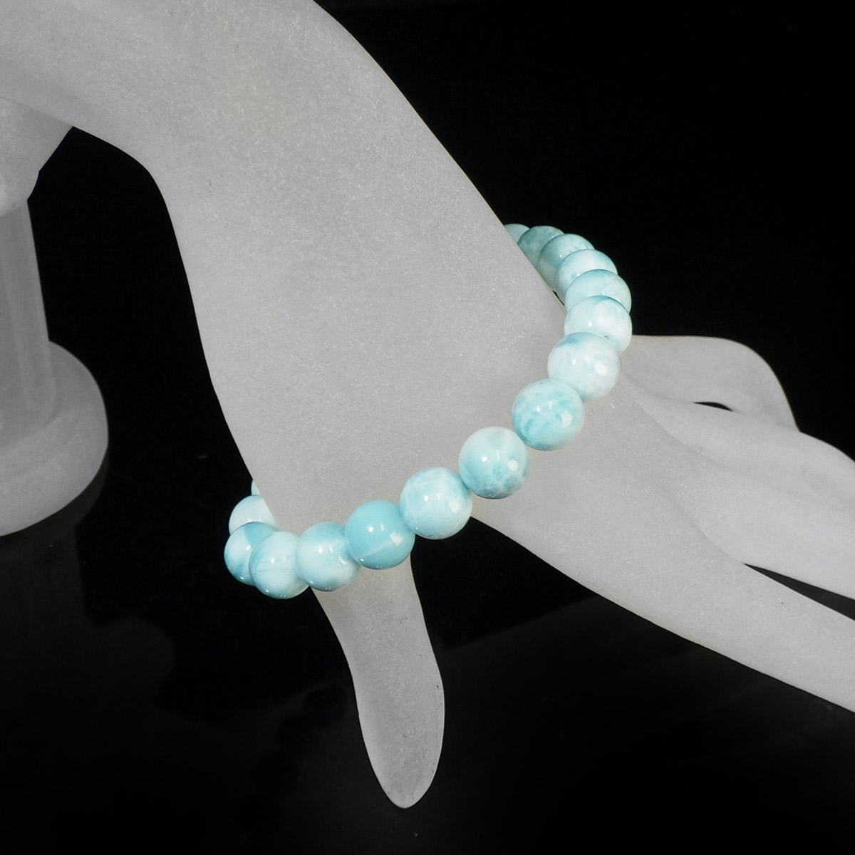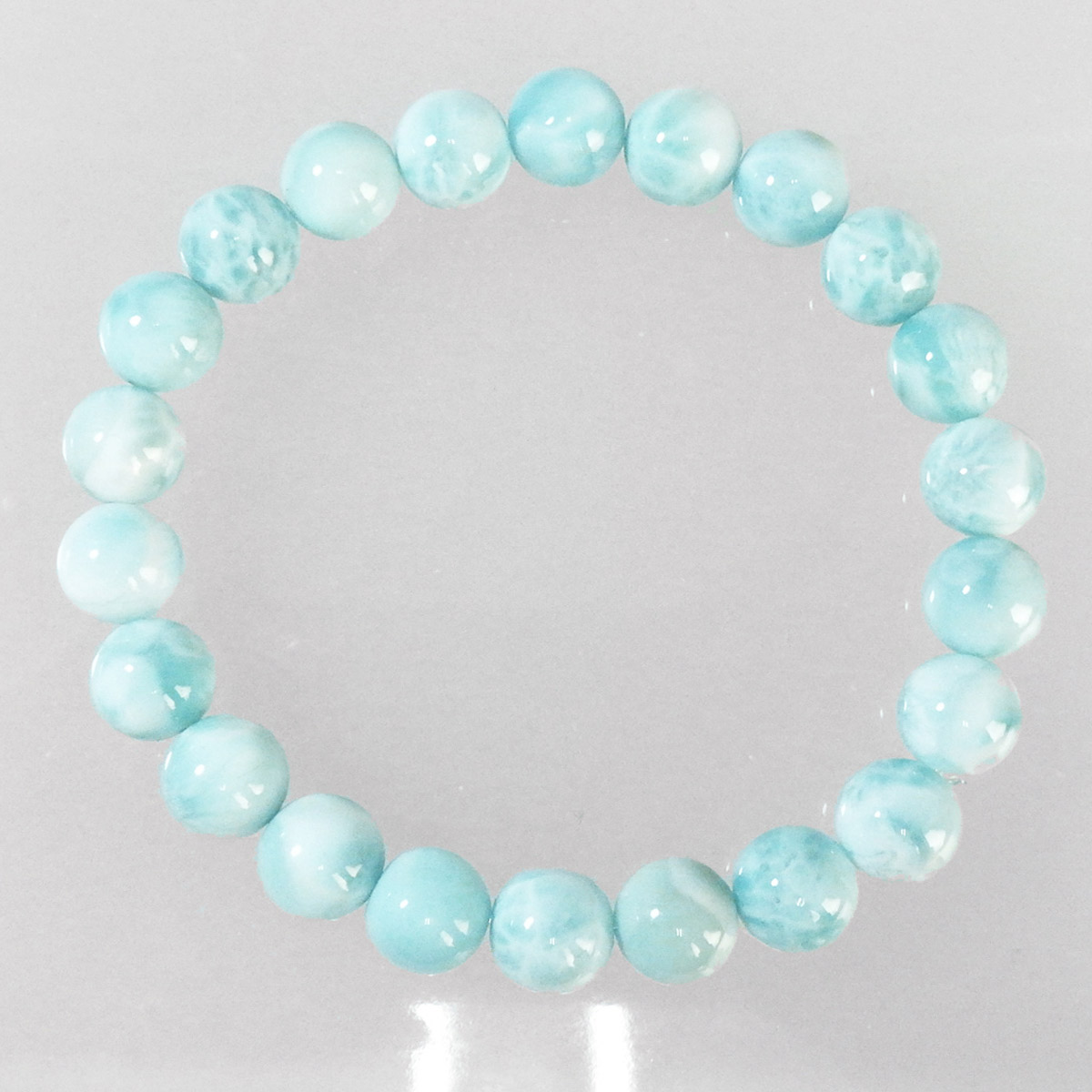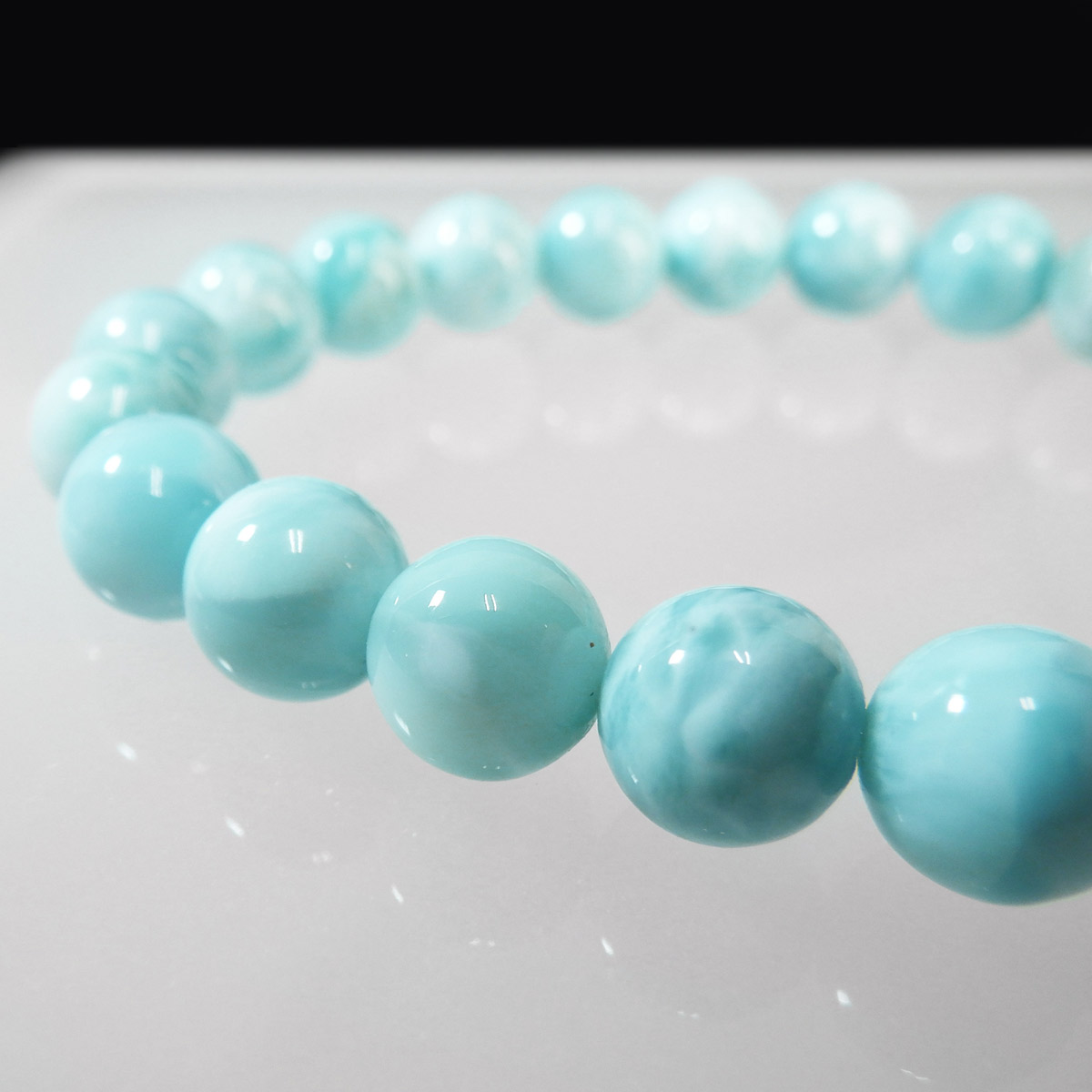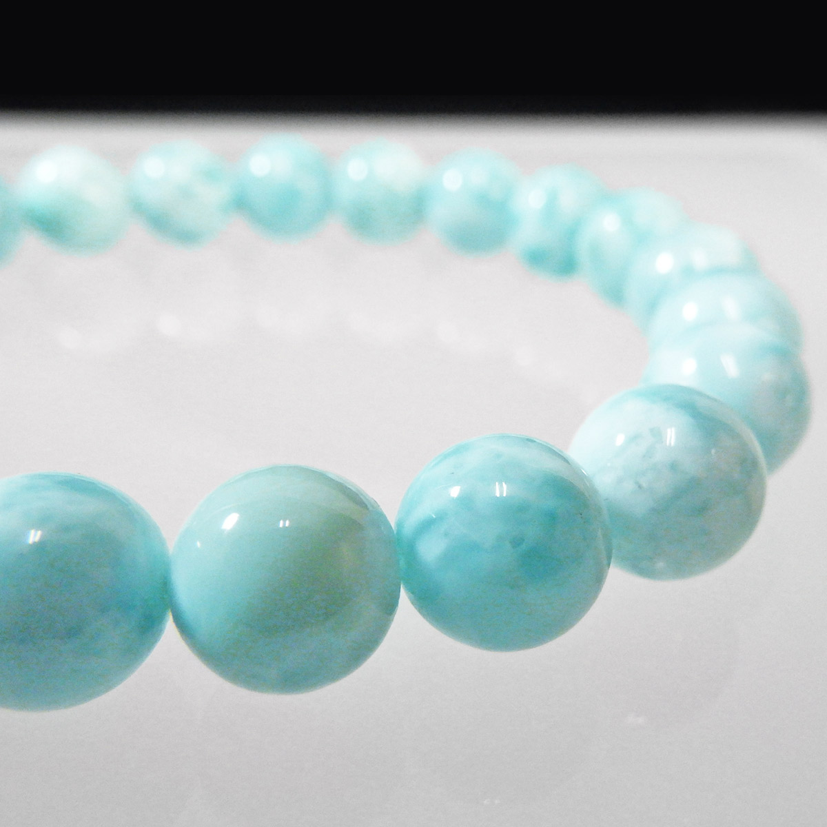 茶・黒い模様などほとんど見られない最高級クラスのラリマーブレスレットです。均一で発色の良い整った色合いのみのラリマーで揃えており、澄み渡るカリビアンブルーとホワイトの模様がきれいに入っています。鉱物名はブルーペクトライトといい、カリブ海三大宝石の一つであり、世界三大ヒーリングストーンでもあります。