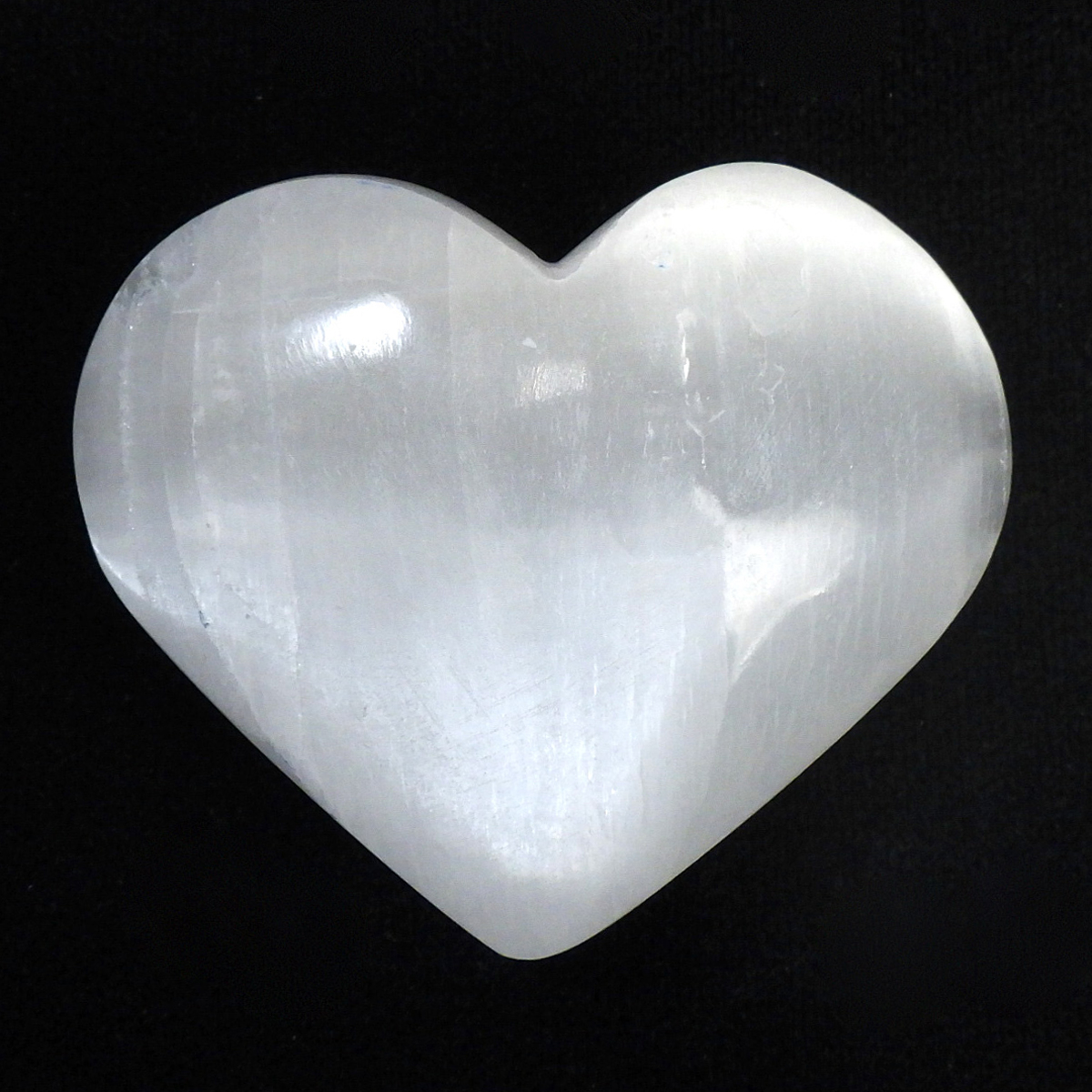 モロッコ産のセレナイトで出来たハート型の置物です。 ジプサム(石膏)の透明度が高いものを、セレナイト(透石膏)といいます。大きく美しい結晶はかつて「聖母マリアのガラス」と呼ばれ、窓ガラスに利用されることもあったそうです。マットな質感が特徴的で、セレナイトのシルキーな光沢が幻想的です。 水分や油脂が苦手な石なので、取り扱いには注意が必要です。