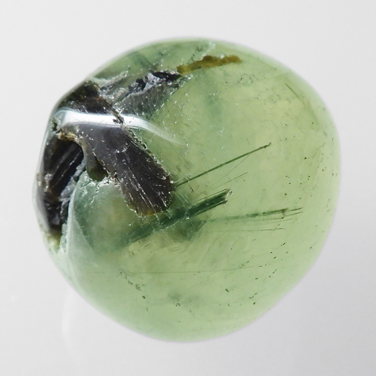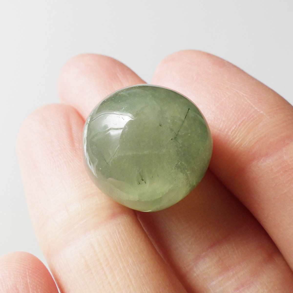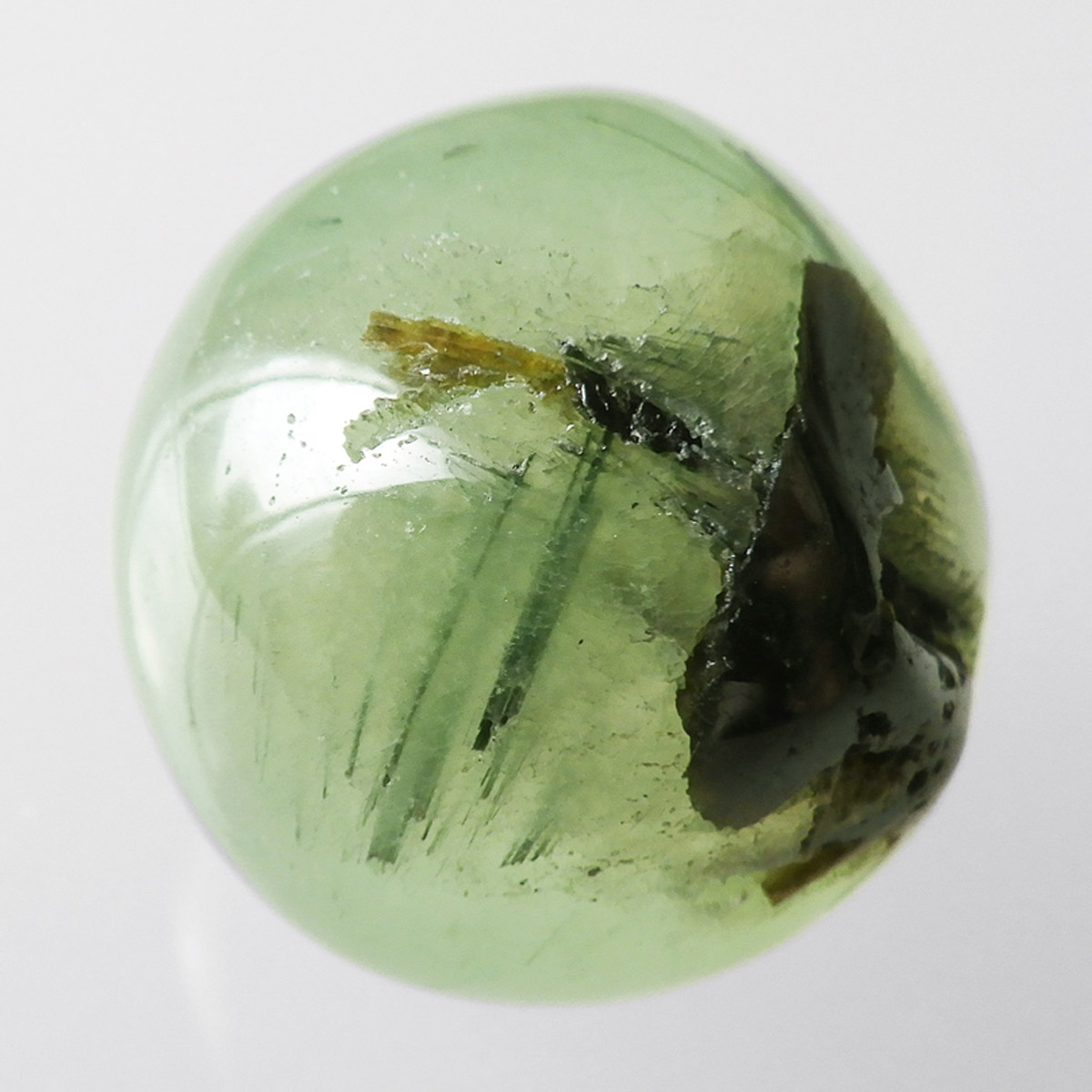西アフリカに位置するマリ共和国産のプレナイト、タンブルです。和名でぶどう石(葡萄石)と呼ばれており、プレナイトの多くはぶどうの房のような形状で産出します。透明感のあるグリーンの色彩が特徴で深緑の針状鉱物のエピドートを内包しています。