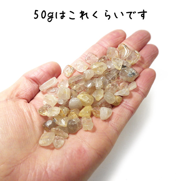 ルチルクォーツのさざれ石50gセットです。 水晶の内部に針状のルチルがインクリュージョンされた水晶をルチルクォーツと呼んでいます。金運といえば1番にこの石といわれるほど人気のあるパワーストーンです。 手ごろな大きさの器に入れて、アクセサリーや石を休ませる「パワーストーン置き場」としてお使い頂けます。