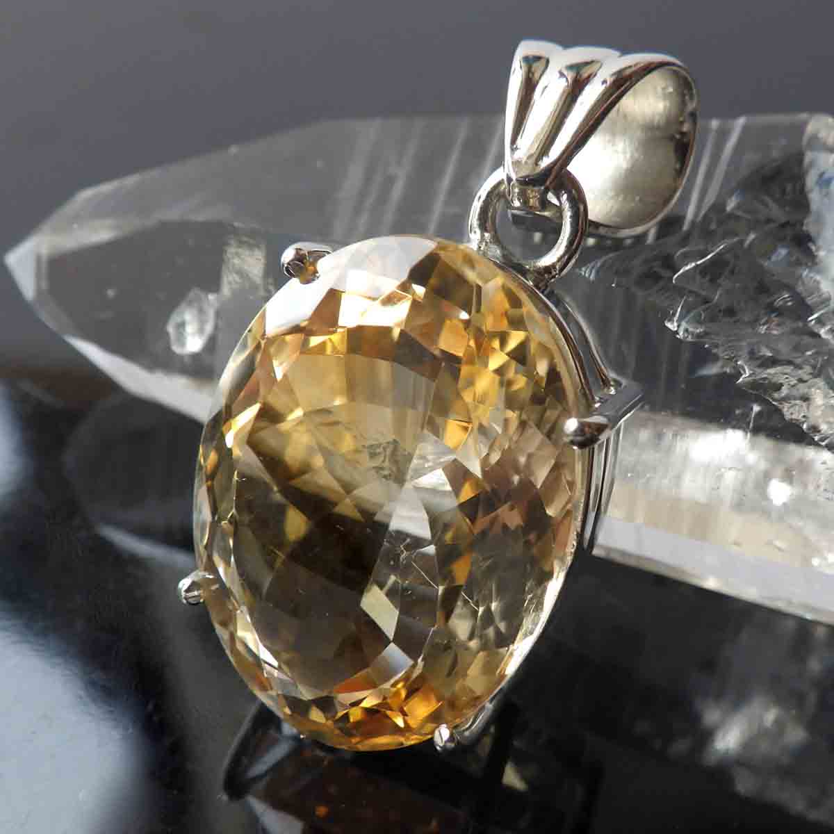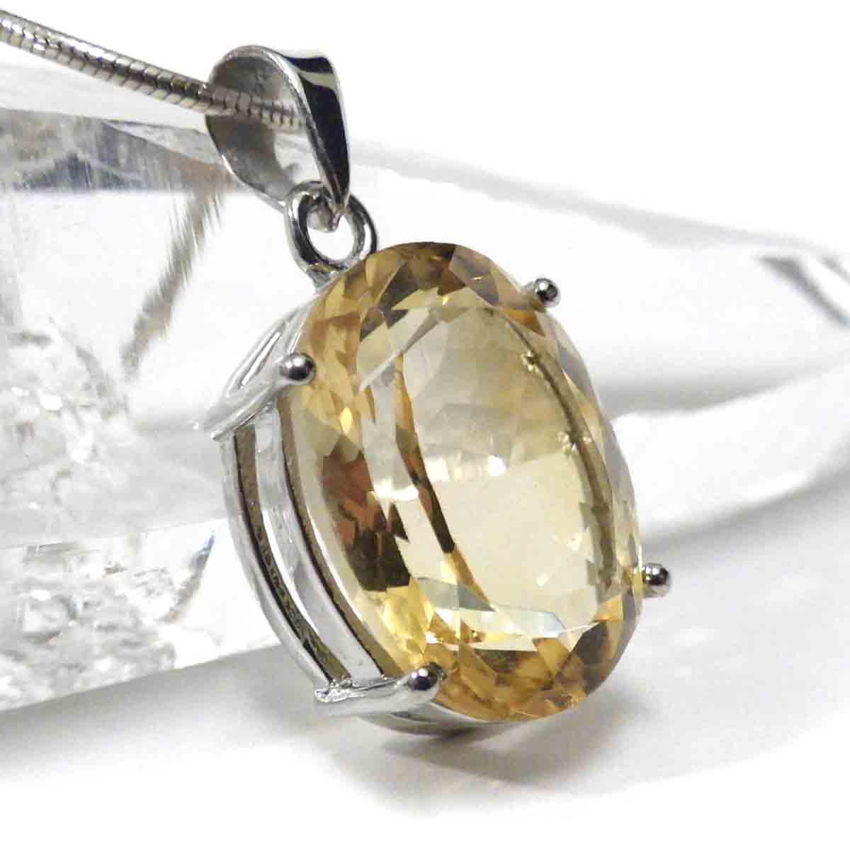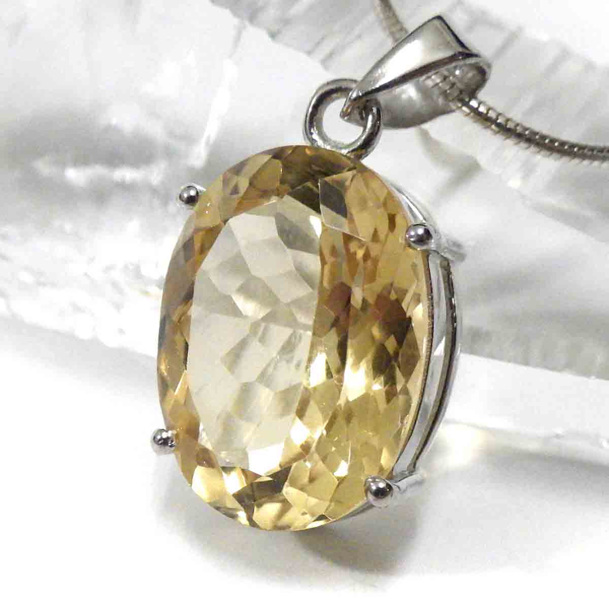 ブラジル産オーバルファセットカットのシトリンペンダントトップです。 宝石質で透明度が高く、発色も素晴らしく、自然な癒されるイエローの良質なシトリンです。オーバルファセットカットとは、楕円形の多面体カットのことで、シトリンの美しさを最大限に引き出しています。※チェーンは別売りです。