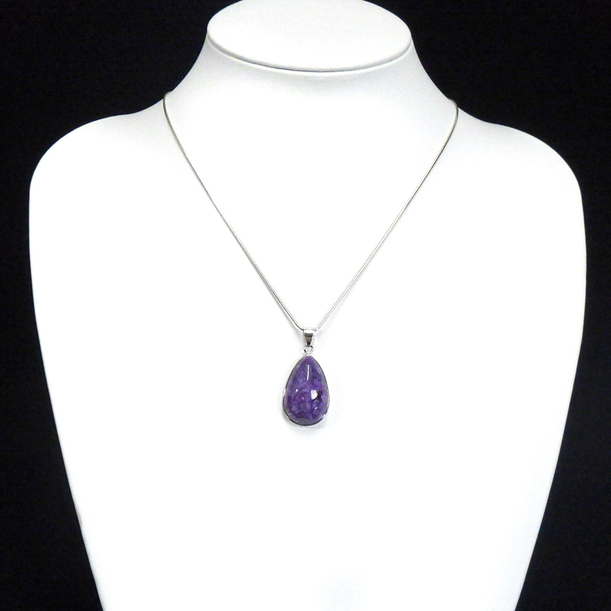 3大ヒーリングストーンの1つチャロアイトを贅沢に使用し、ぷっくりとしたしずく形に仕上げています。 落ち着いた紫色・白色のマーブル模様・黒点のマッチングがとても美しく魅力的なペンダントトップです。