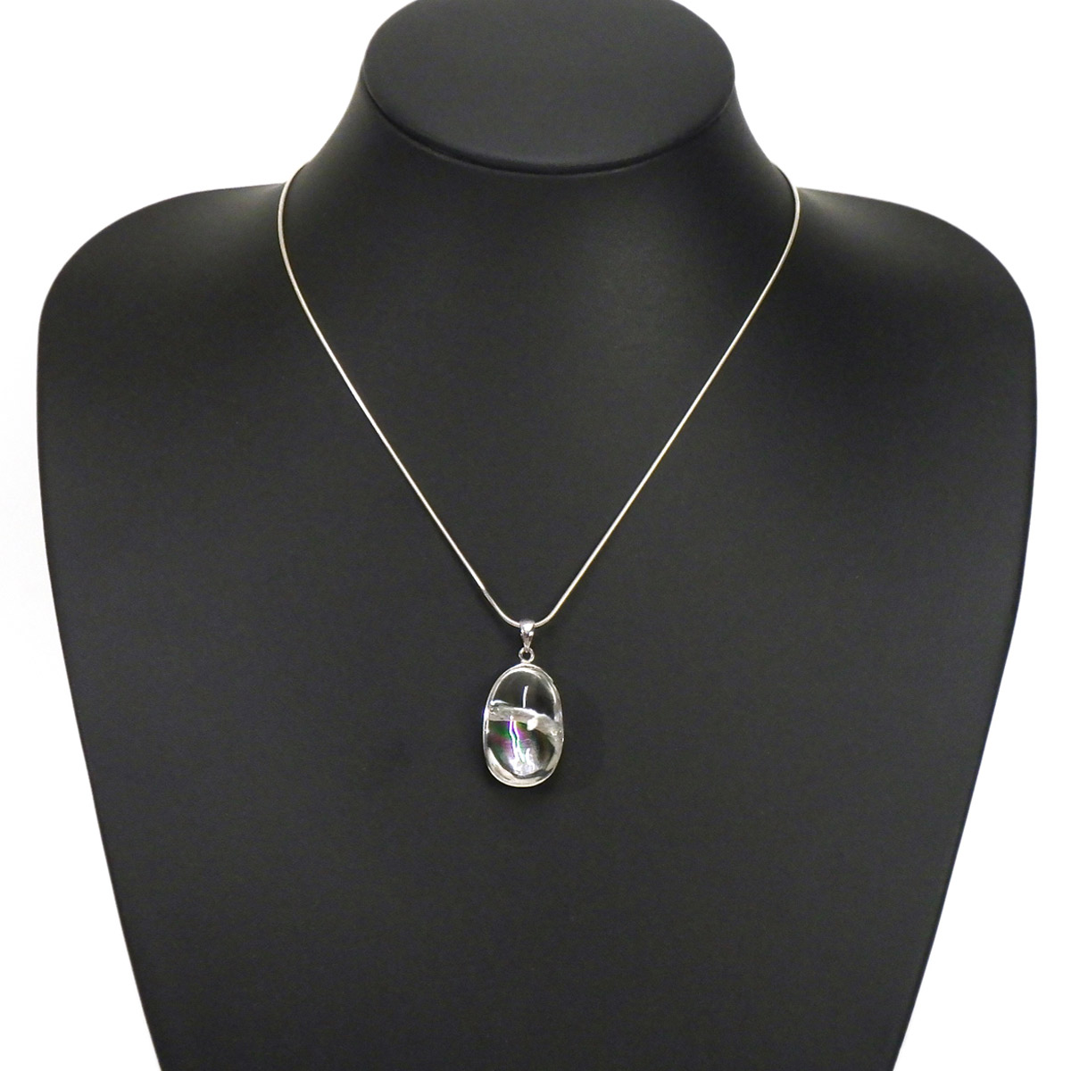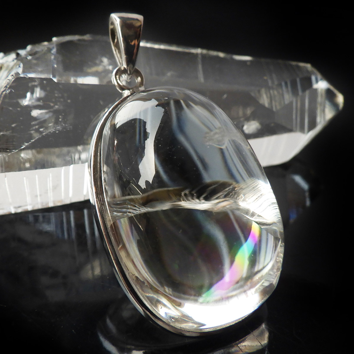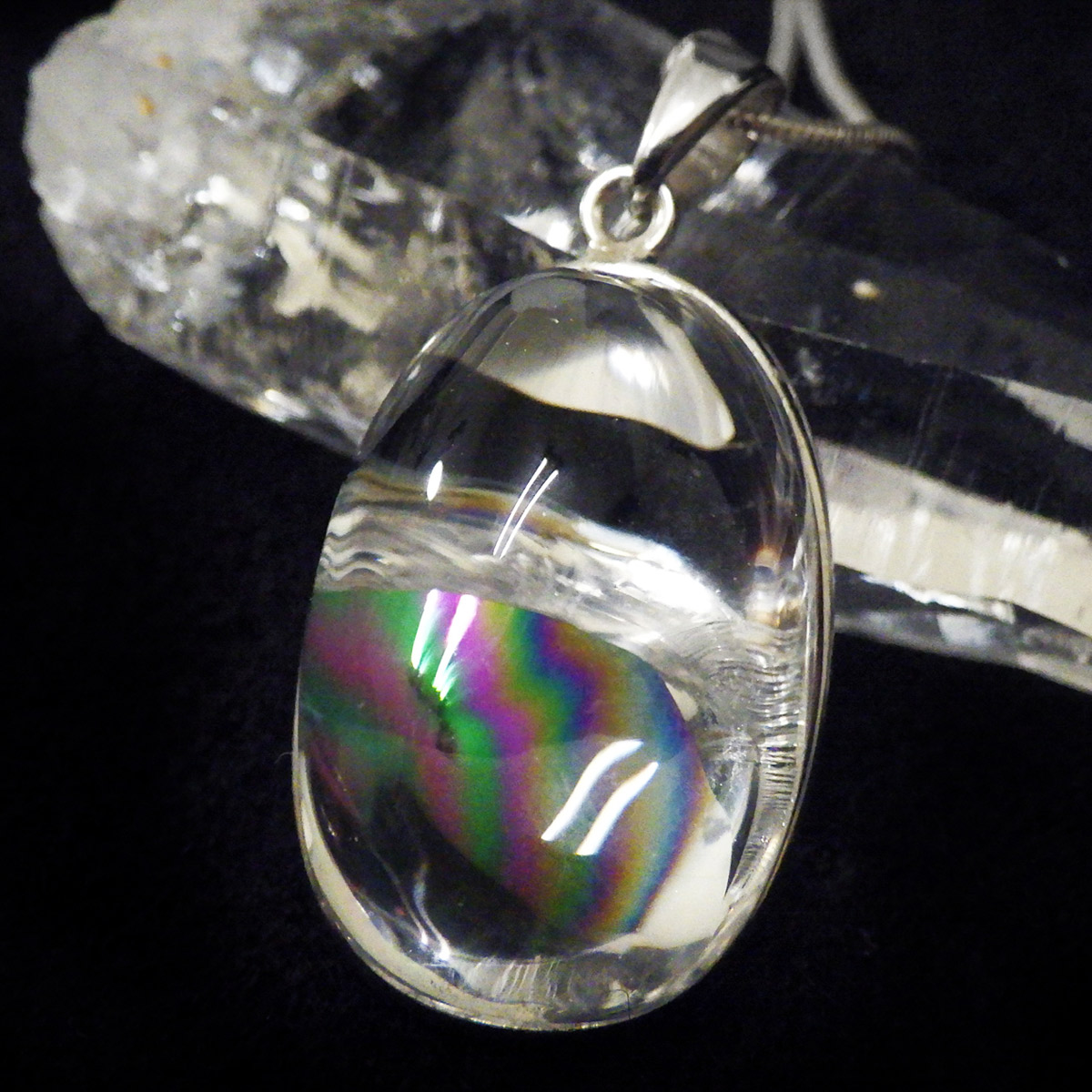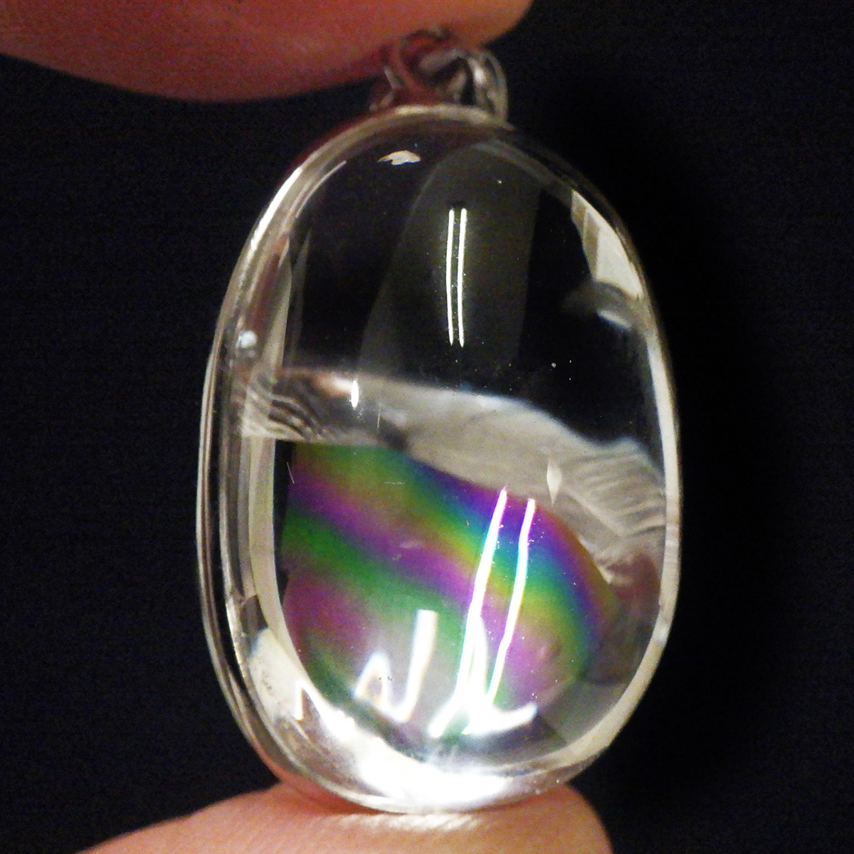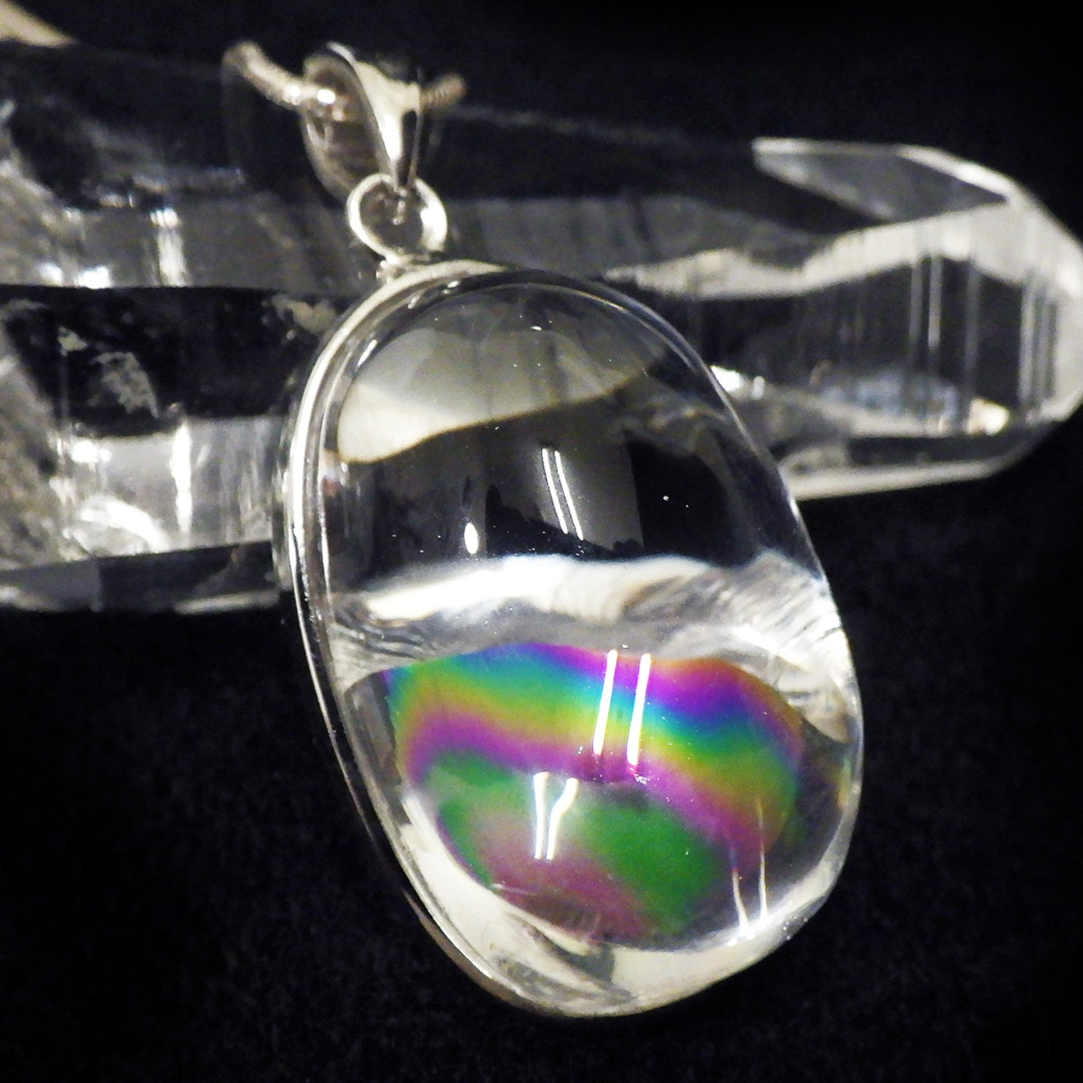 レインボーを残すように膨らみのある半球状のカボションペンダントに加工しました。透明度が高く、大きさもある水晶のレインボー部分のみを磨き上げており、虹色を閉じ込めた大変美しいペンダントに仕上がっています。レインボークォーツは別名アイリスクォーツとも呼ばれており、持ち主を幸福や希望に導くとされています。