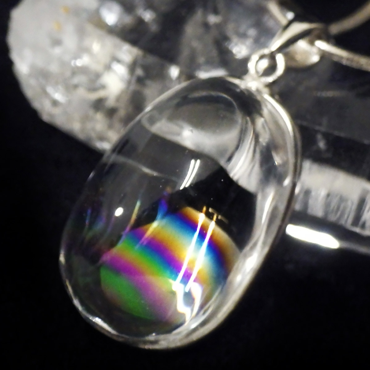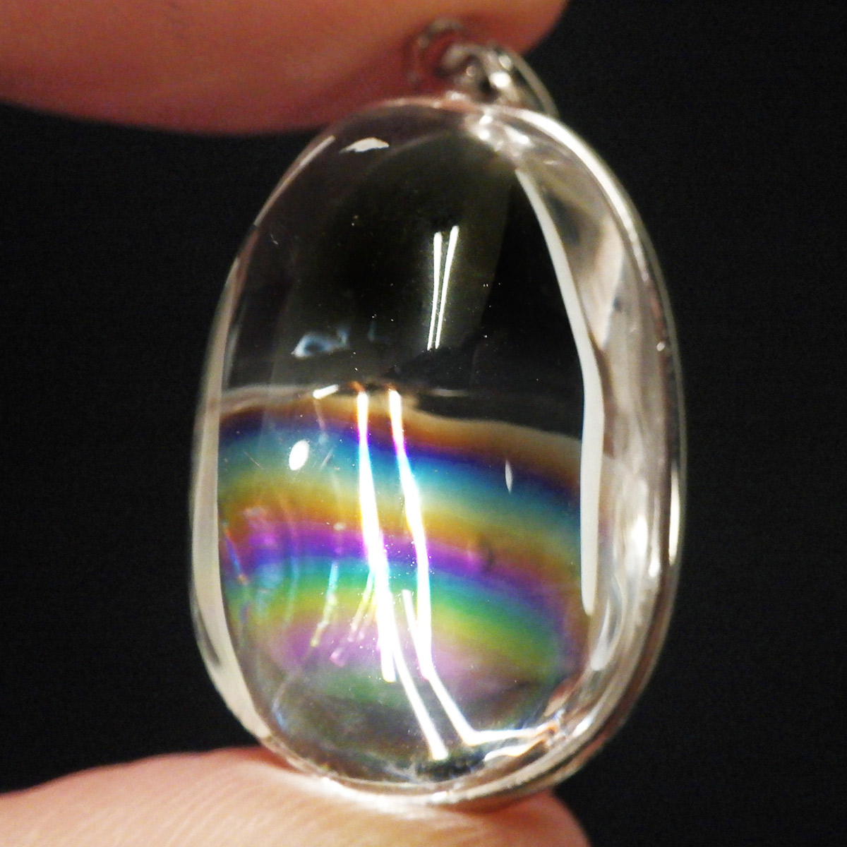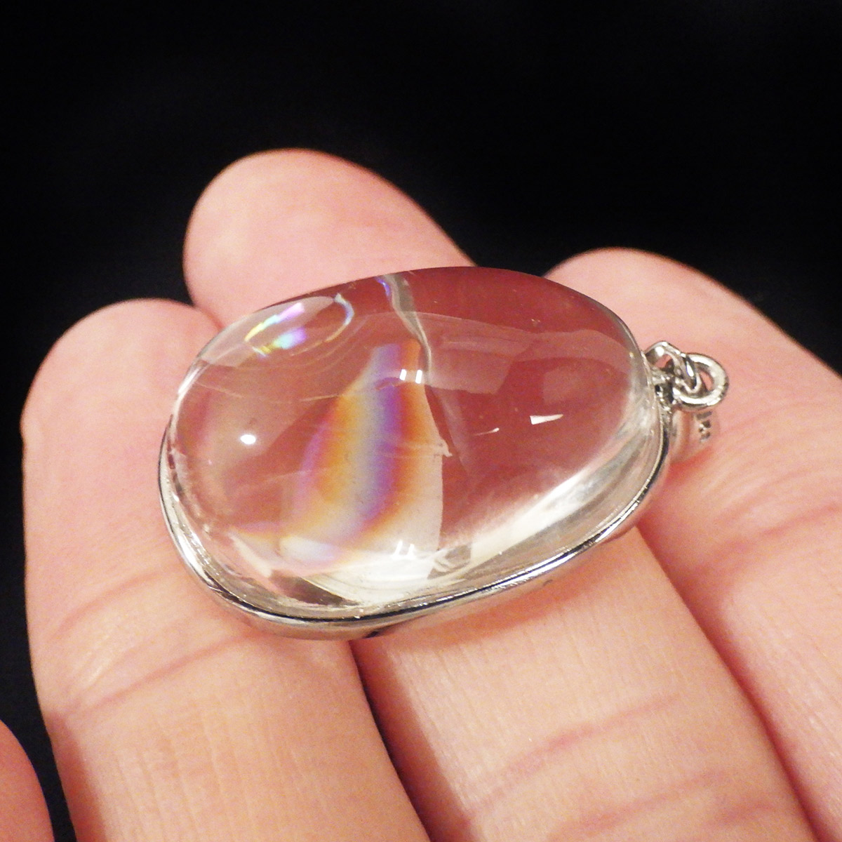 ブラジル産、アイリスクォーツ(レインボークォーツ)のペンダントトップです。和名は虹入り水晶で中心部に大きなレインボーが入っています。 レインボーを残すように膨らみのある半球状のカボションペンダントに加工しました。透明度が高く、大きさもある水晶のレインボー部分のみを磨き上げており、虹色を閉じ込めた大変美しいペンダントに仕上がっています。レインボークォーツは別名アイリスクォーツとも呼ばれており、持ち主を幸福や希望に導くとされています。