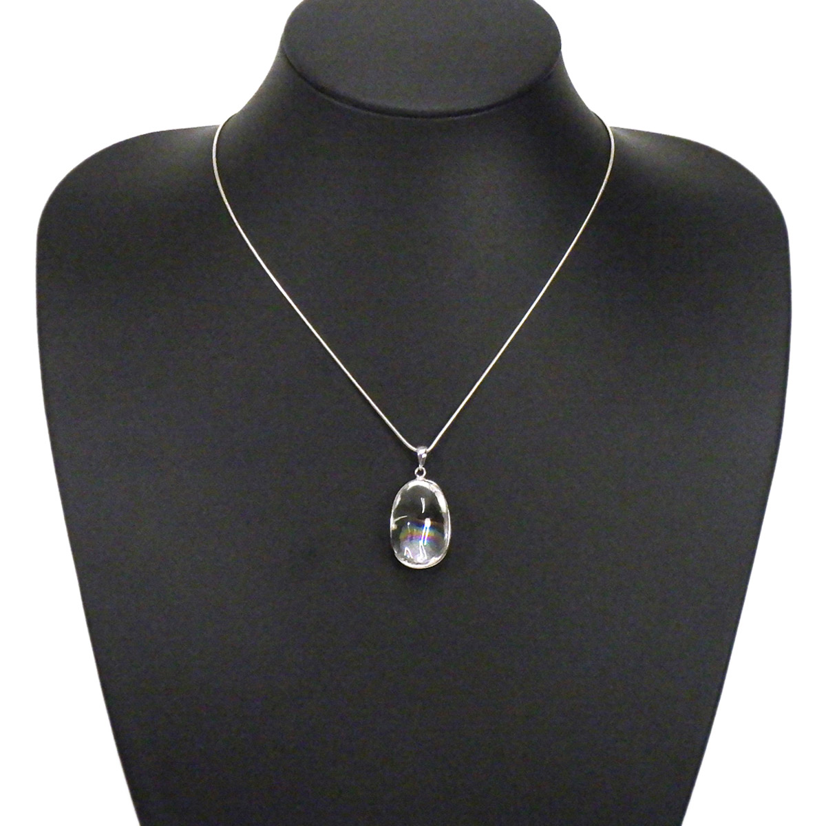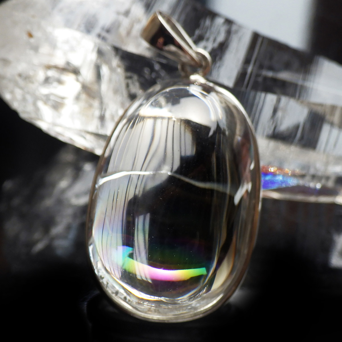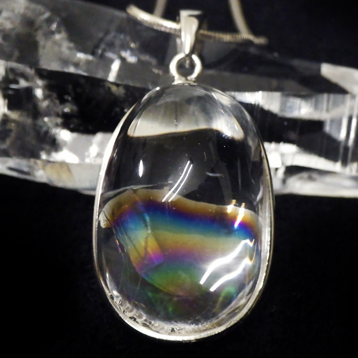 ブラジル産、アイリスクォーツ(レインボークォーツ)のペンダントトップです。和名は虹入り水晶で中心部に大きなレインボーが入っています。 レインボーを残すように膨らみのある半球状のカボションペンダントに加工しました。透明度が高く、大きさもある水晶のレインボー部分のみを磨き上げており、虹色を閉じ込めた大変美しいペンダントに仕上がっています。レインボークォーツは別名アイリスクォーツとも呼ばれており、持ち主を幸福や希望に導くとされています。