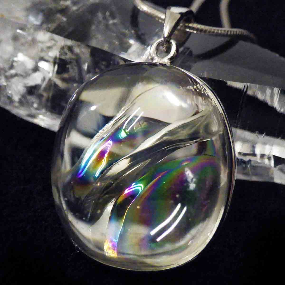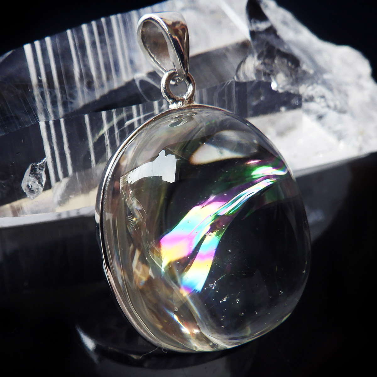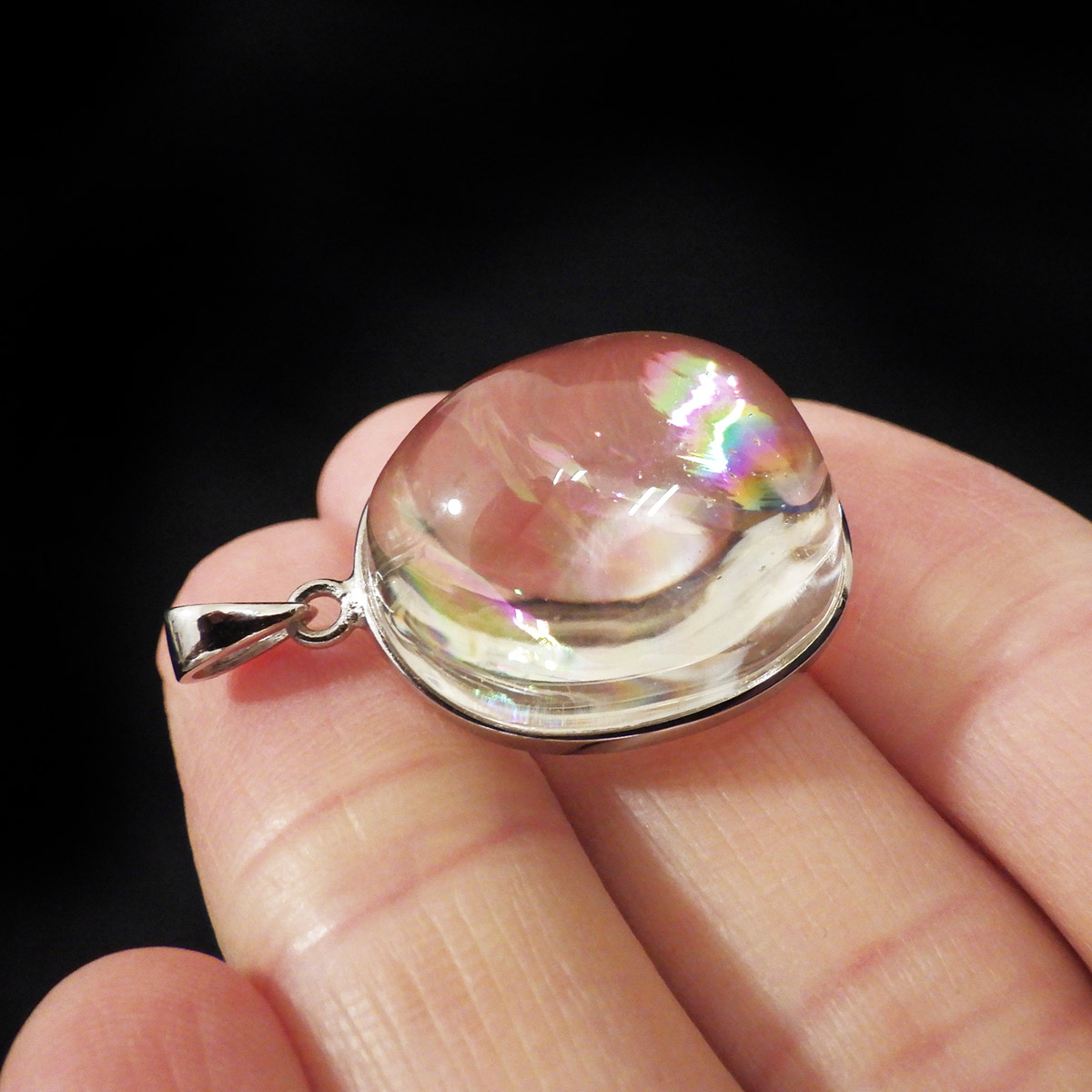 レインボーを残すように膨らみのある半球状のカボションペンダントに加工しました。透明度が高く、大きさもある水晶のレインボー部分のみを磨き上げており、虹色を閉じ込めた大変美しいペンダントに仕上がっています。レインボークォーツは別名アイリスクォーツとも呼ばれており、持ち主を幸福や希望に導くとされています。